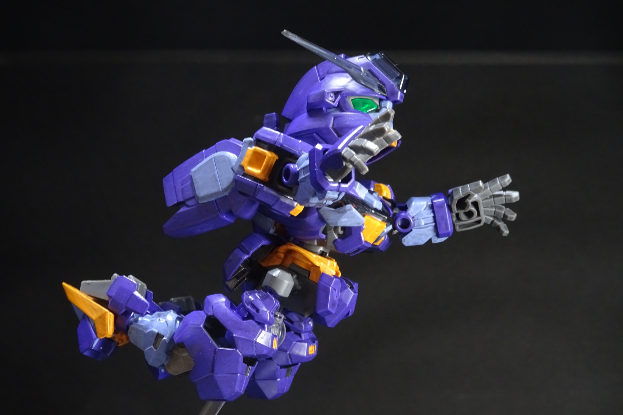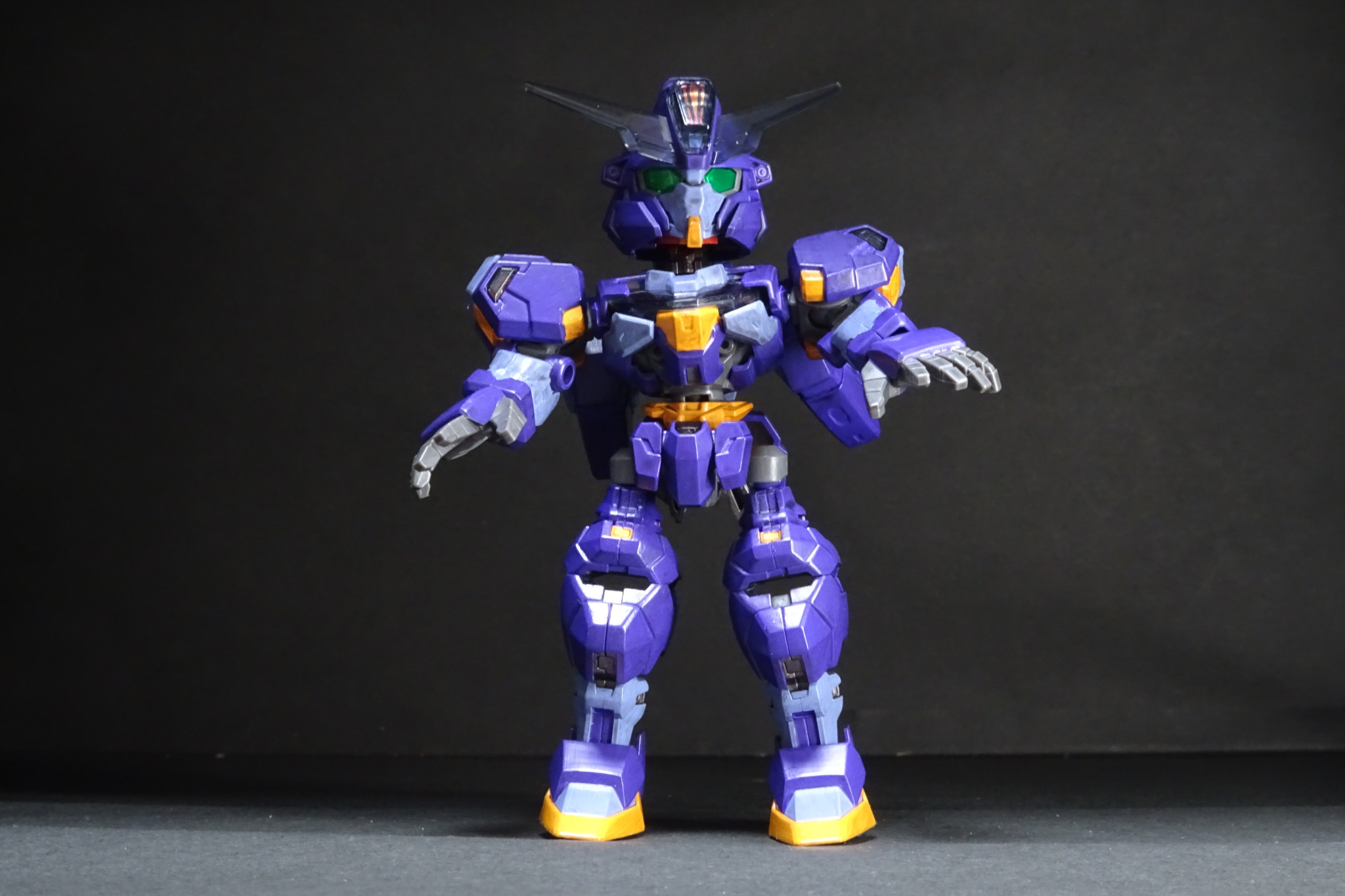 SDとCSバージョン両方のモモから下を組み合わせ、SDフレームのまま足を取り付けられるように改造し、ハロウィンらしくゾンビカラー風にパープル系で全塗装してみた。