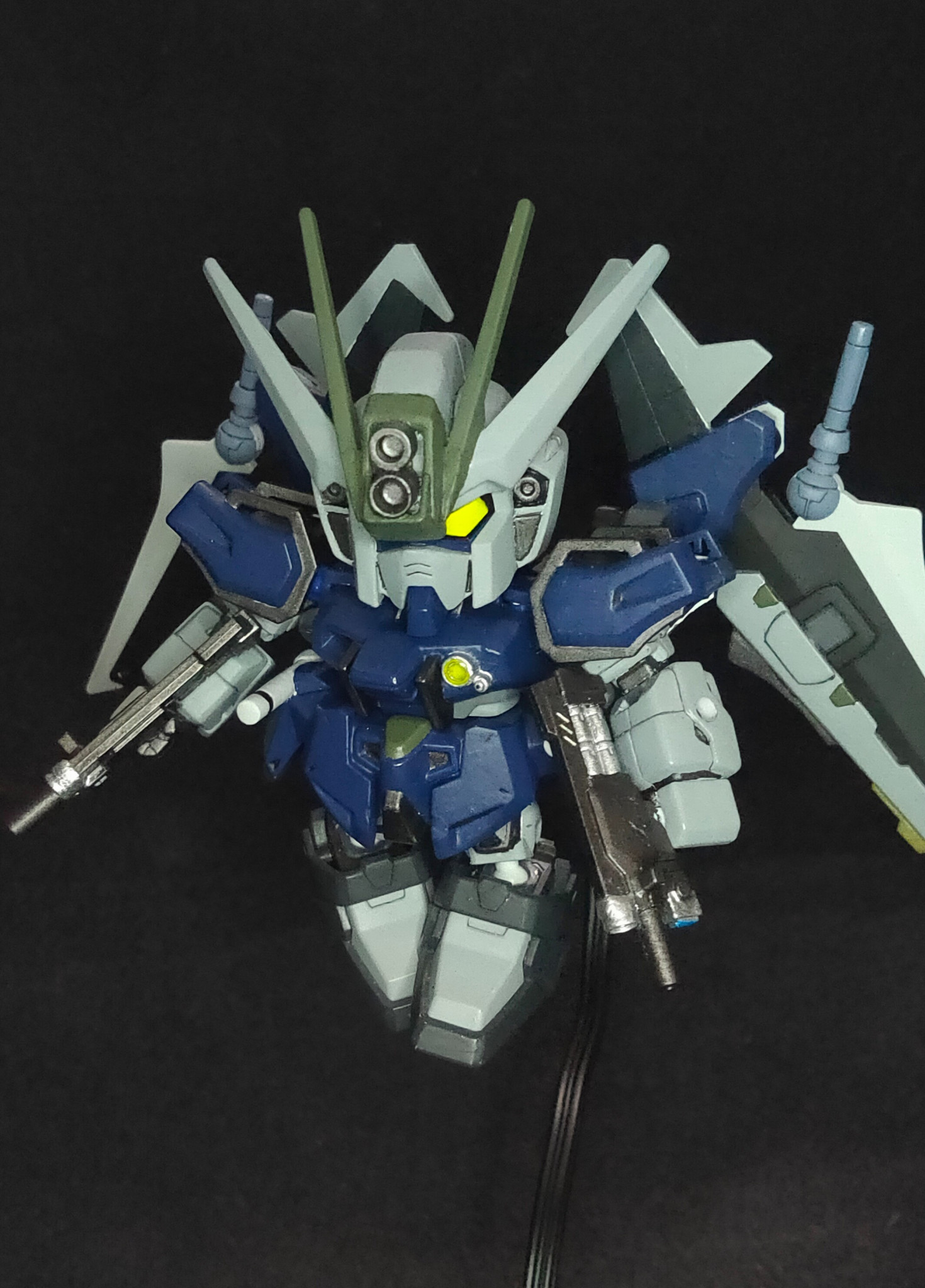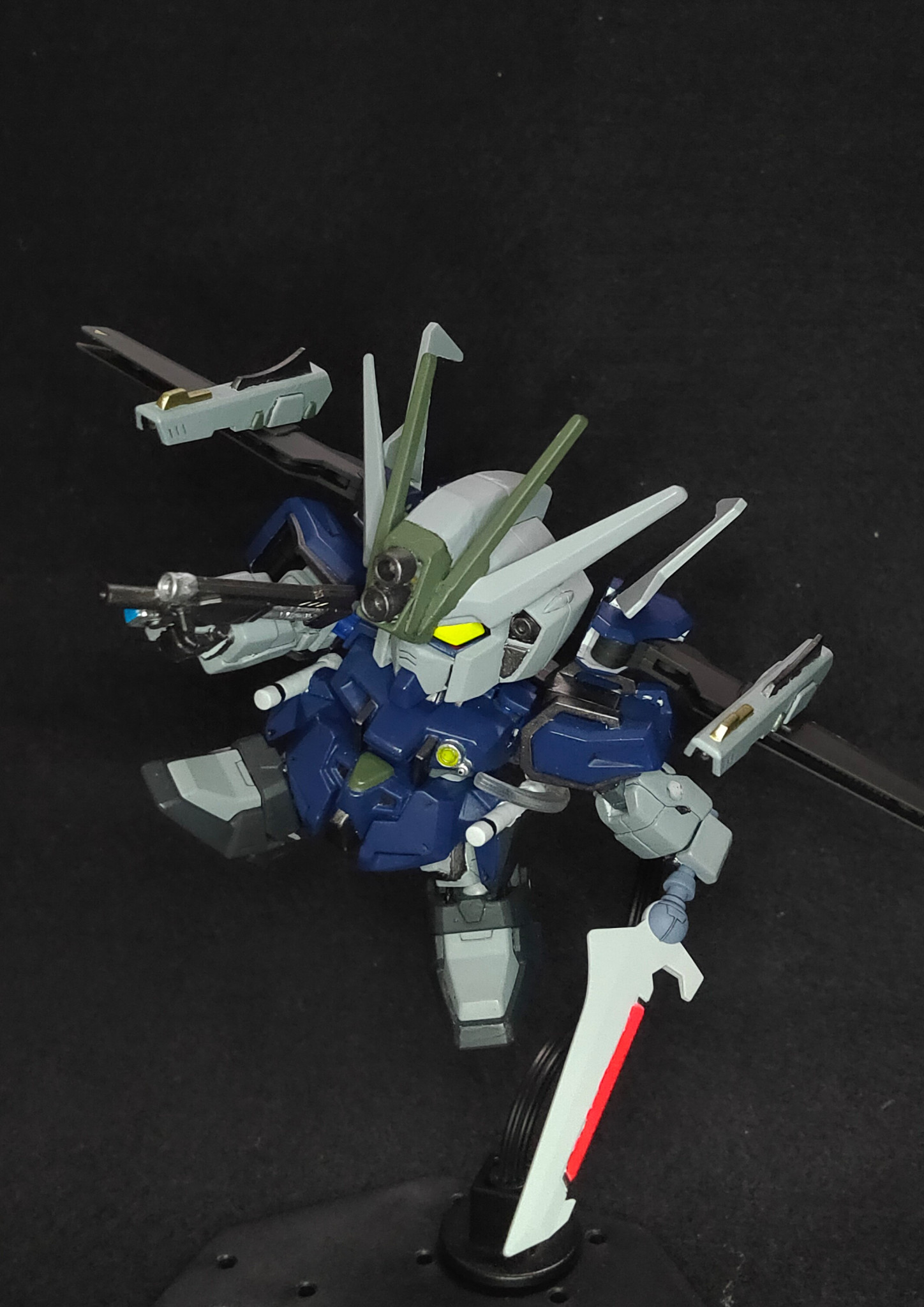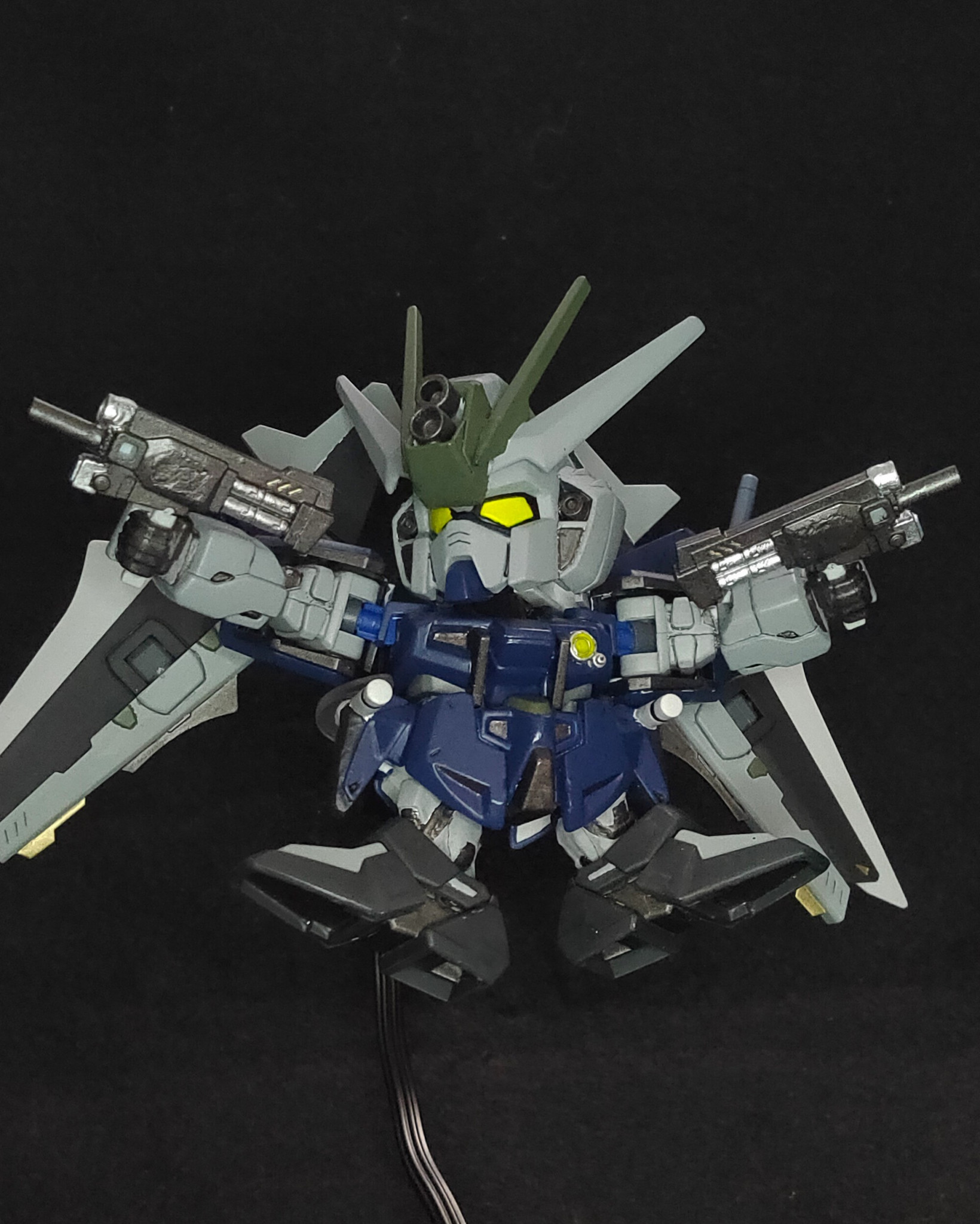 SDシリーズのプラモで初めて改造したガンプラで、BB戦士ストライクガンダムをベースに、肩と足首はストライクノワールのものに差し替えて改造しました。