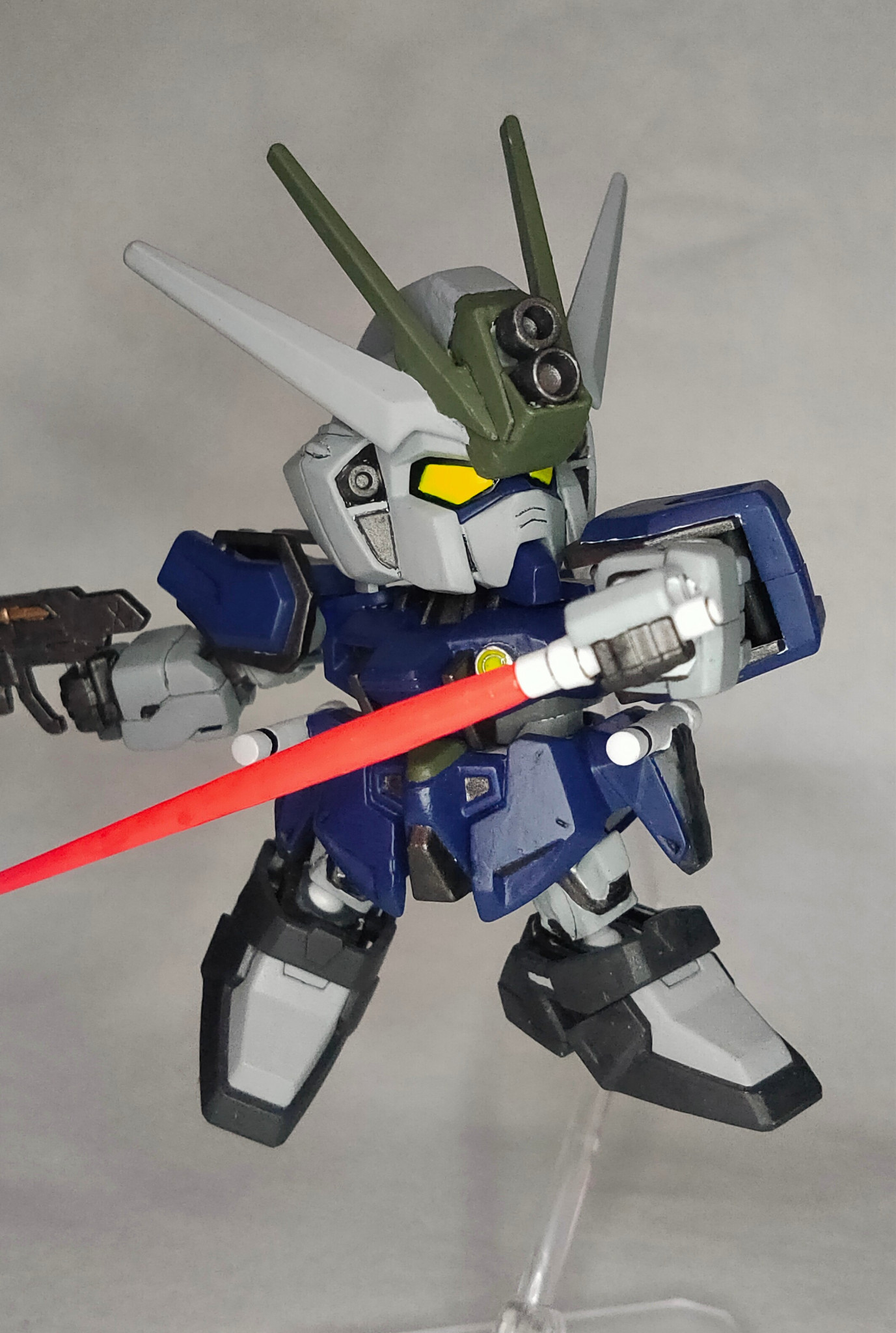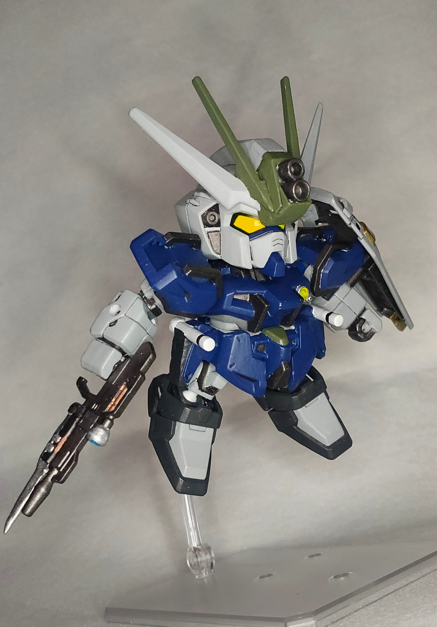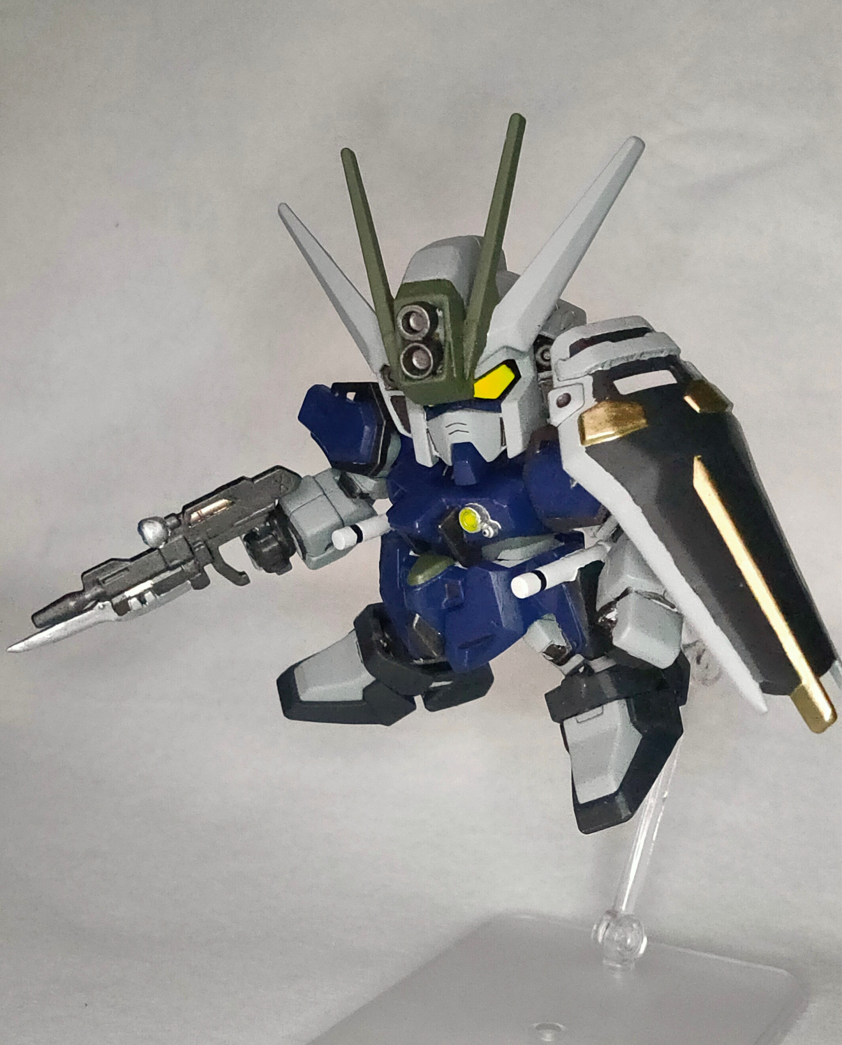 SDシリーズのプラモで初めて改造したガンプラで、BB戦士ストライクガンダムをベースに、肩と足首はストライクノワールのものに差し替えて改造しました。