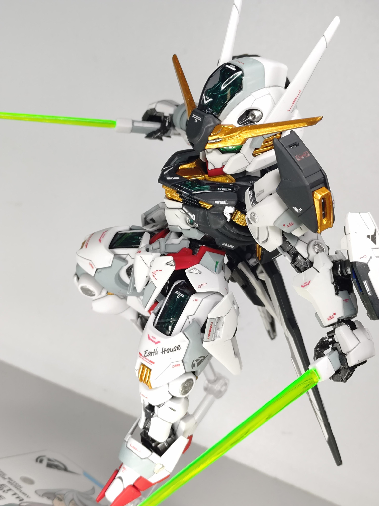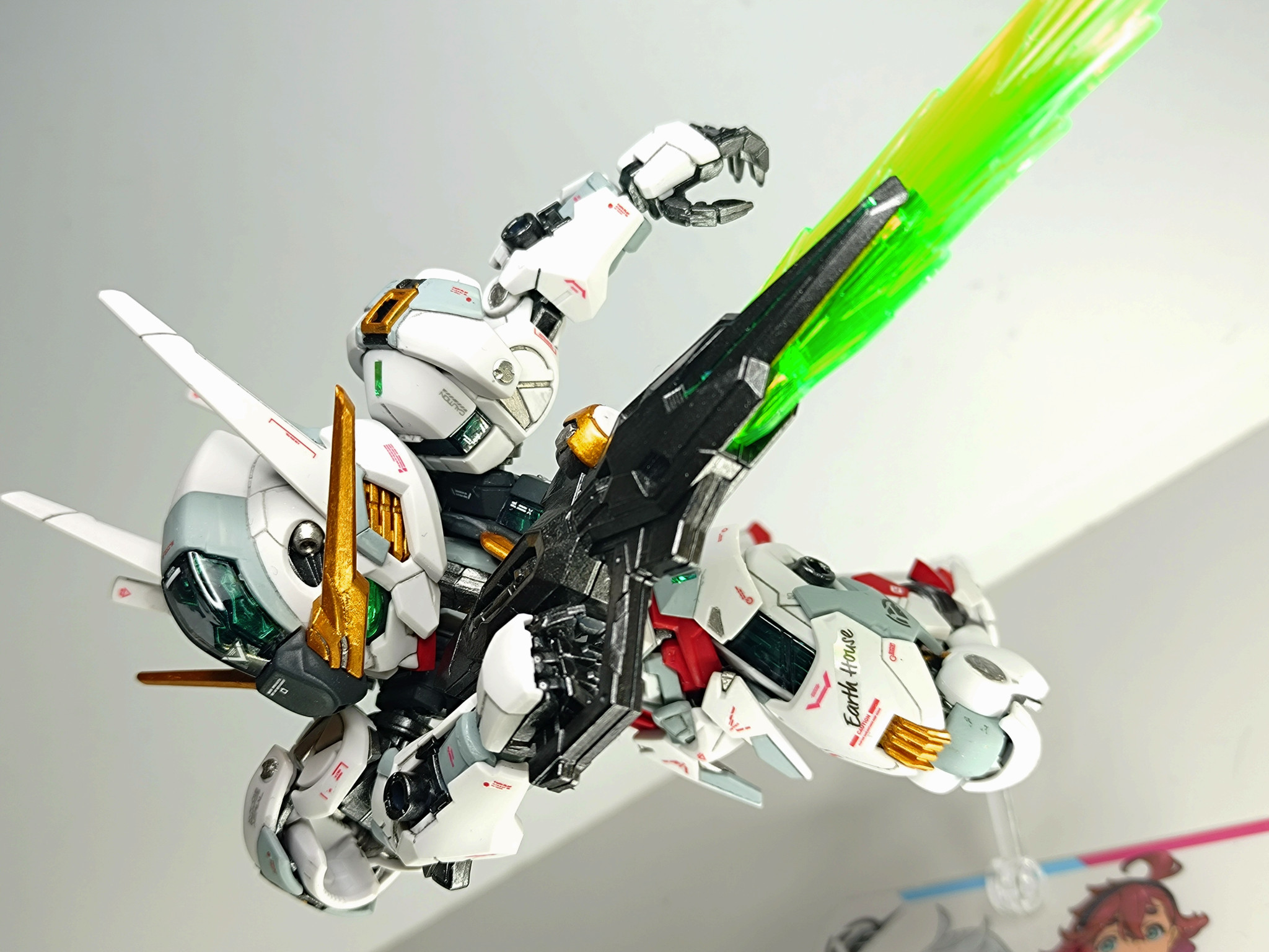 ビーム刃は成形色そのままです。ちら見えしてる左フトモモにある『EARTH HOME(地球寮)』デカールがお気に入りポイント。パイセンに無理やり書かれたイメージ。
