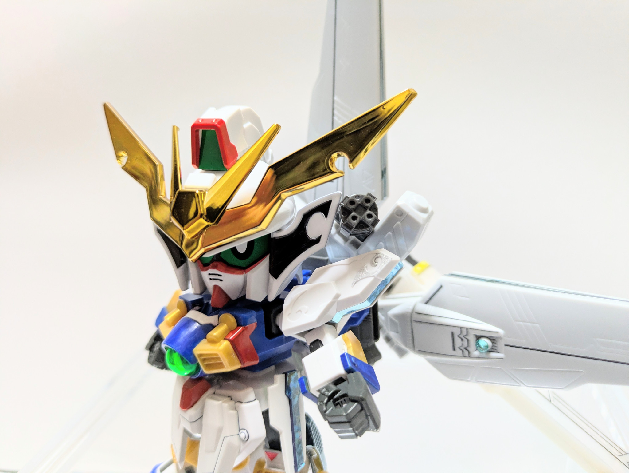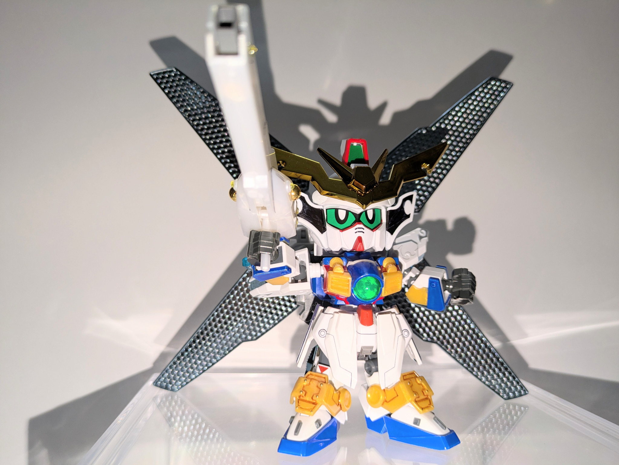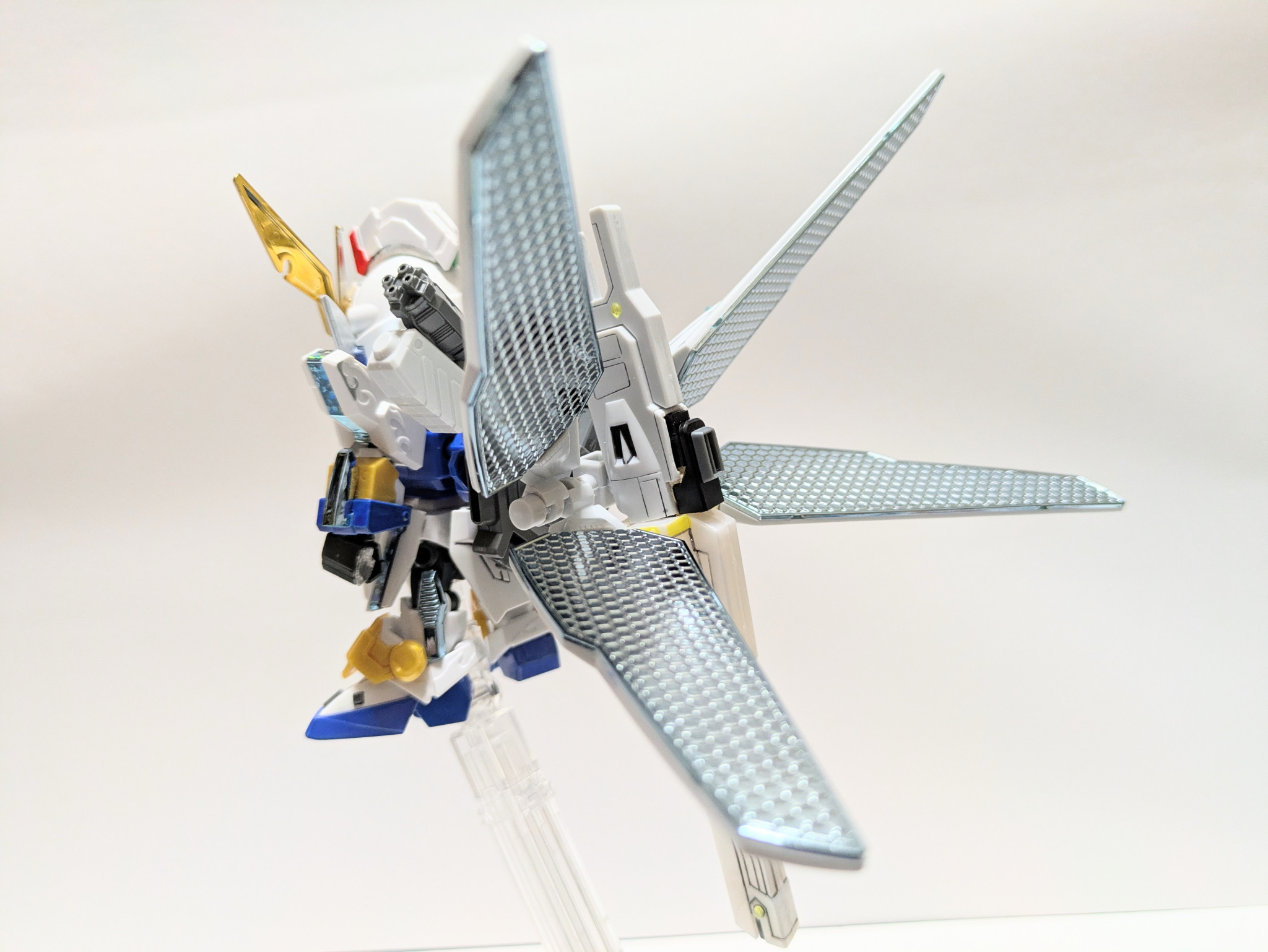 肩と腰横にはホログラムシールで煌びやかな仕上がりに。サテライトシステムを象徴するバックパックは『HG 1/100 ガンダムX』のものをそのまんま背負わせました。SDの身体には不釣り合いな大きさですが、何故そうしたかは次段にて。