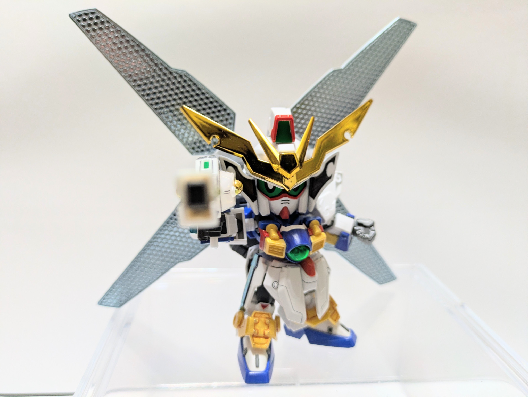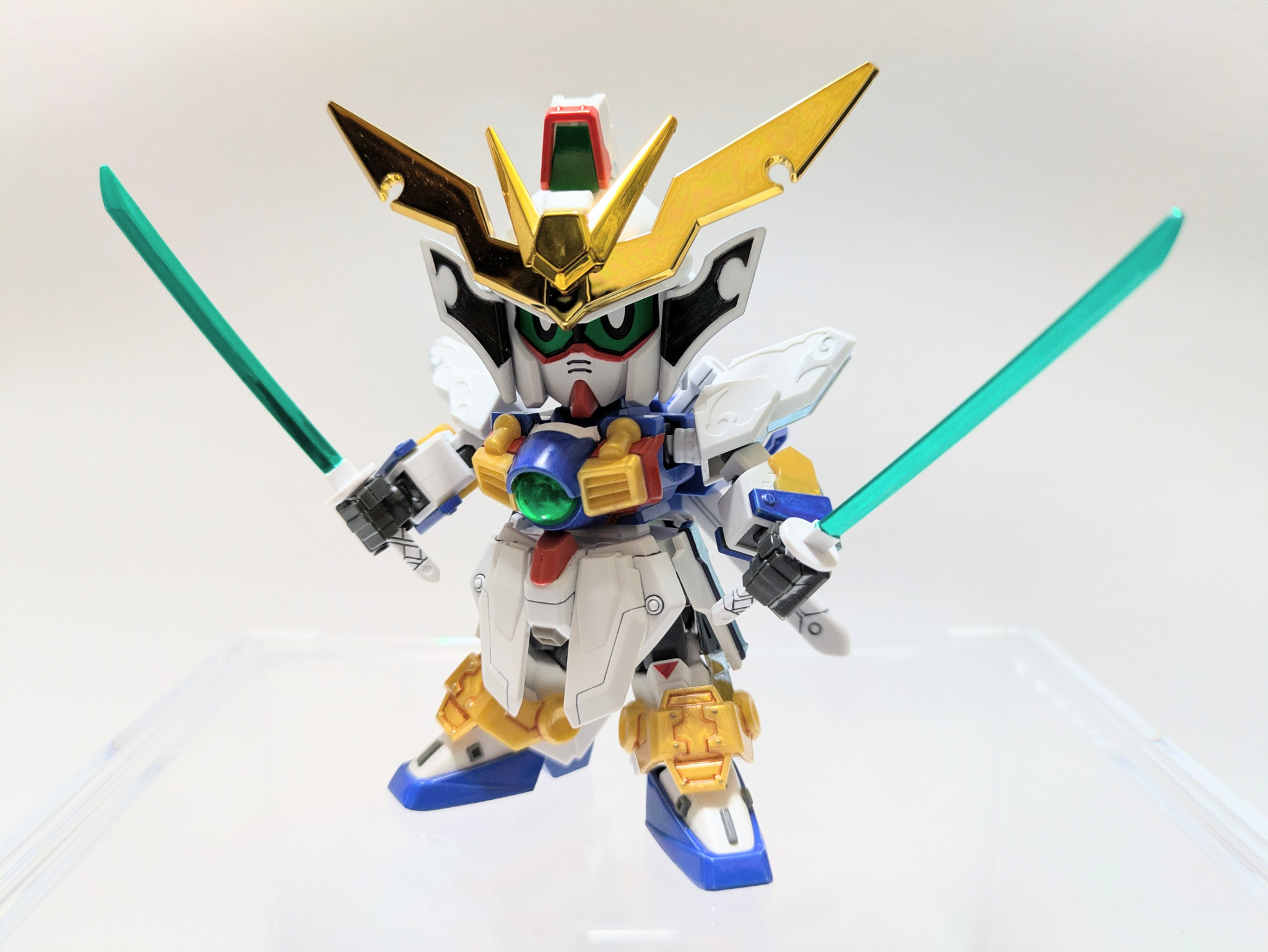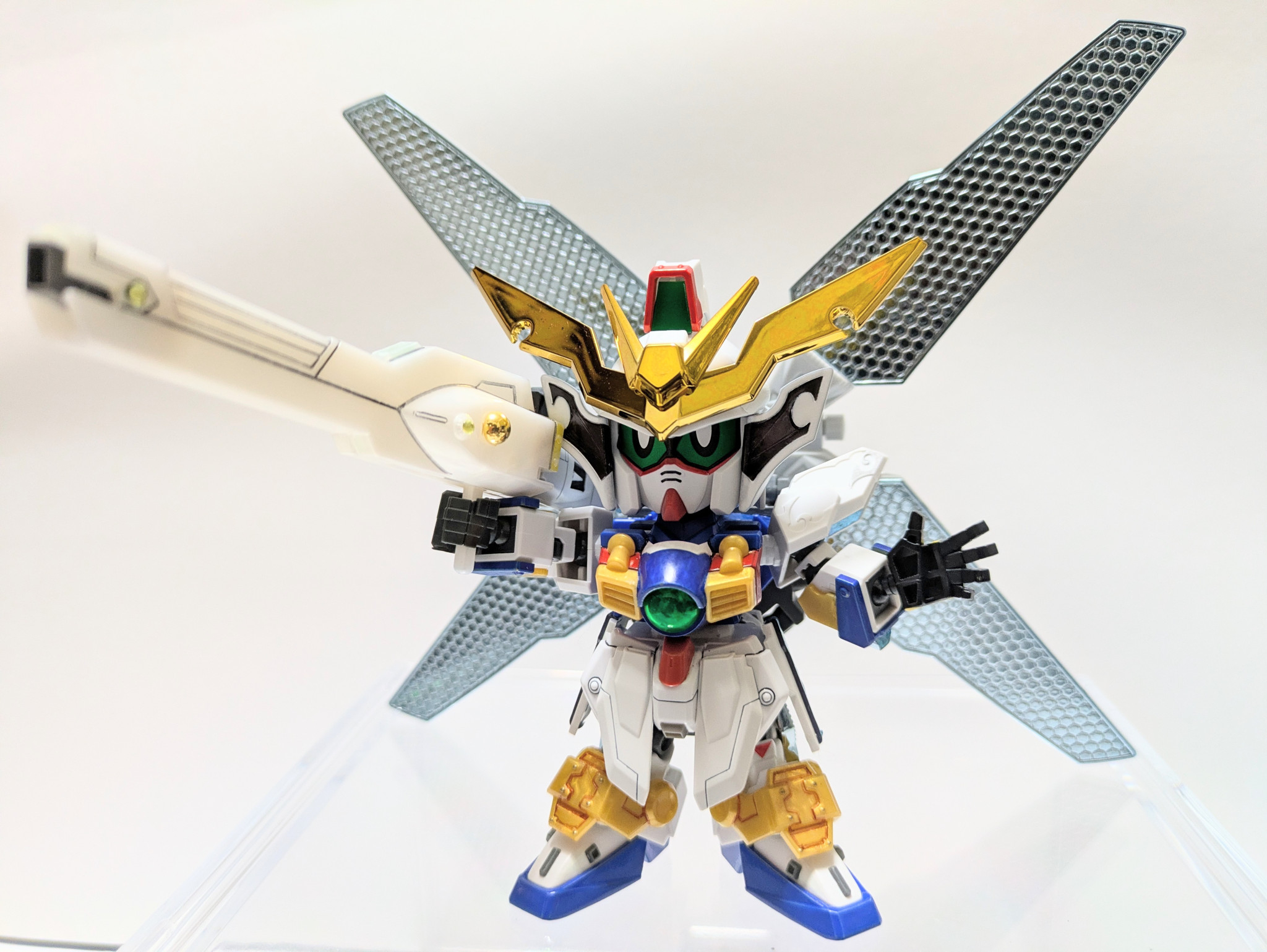 肩と腰横にはホログラムシールで煌びやかな仕上がりに。サテライトシステムを象徴するバックパックは『HG 1/100 ガンダムX』のものをそのまんま背負わせました。SDの身体には不釣り合いな大きさですが、何故そうしたかは次段にて。