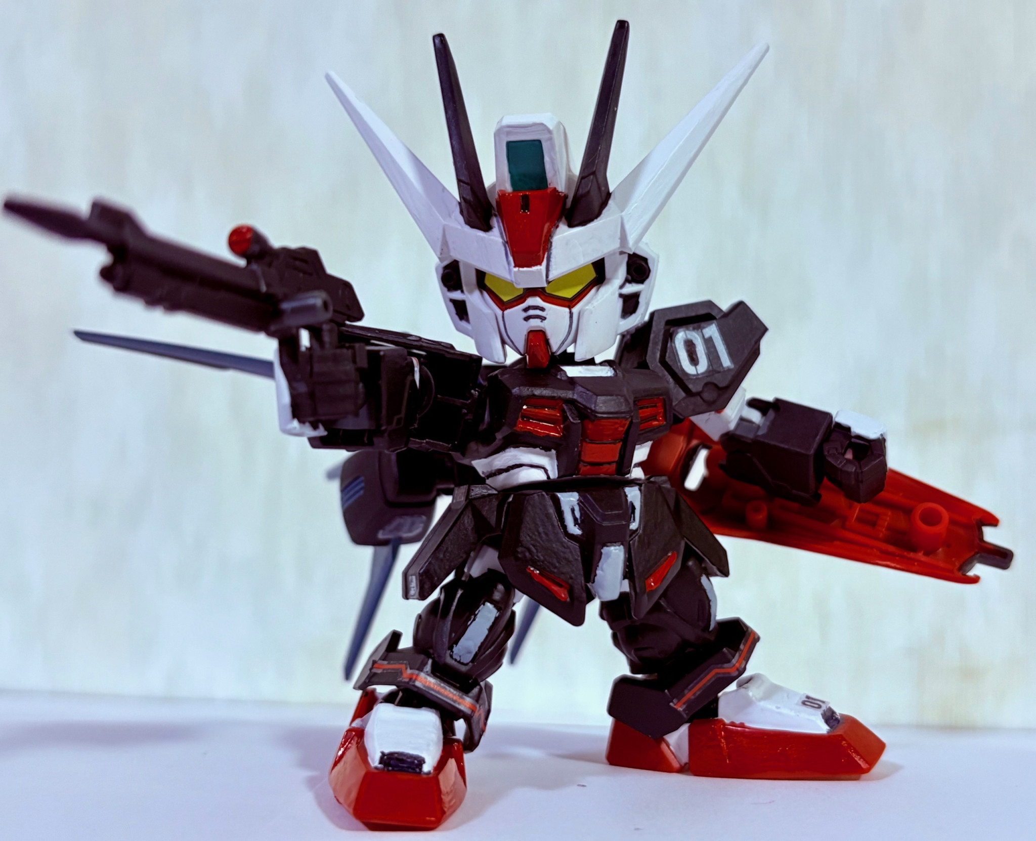 練習がてら機体の各部分にデカールを貼ってリアルな感じに仕上げている。デカールはジムナイトシーカーと30MMシリーズから流用。「01」と数字が貼られているがこれはSEED世界における「01ガンダム」を意識したものである。