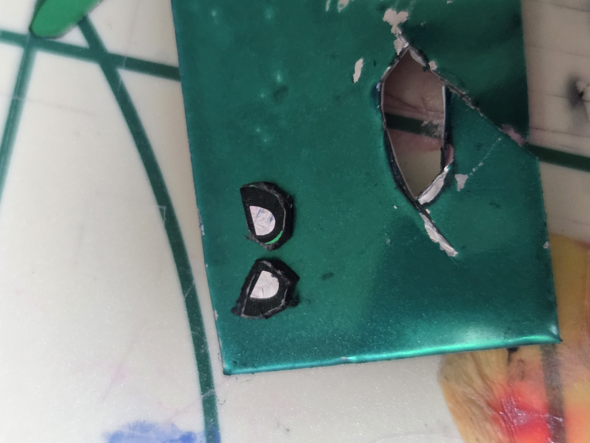 見ての通り目の形が悪い。さらにメタルテープの塗装がすぐ剥げる、さらには瞳部分のマグネットがどうしても分厚くなり浮く、と散々な結果に…トホホ
