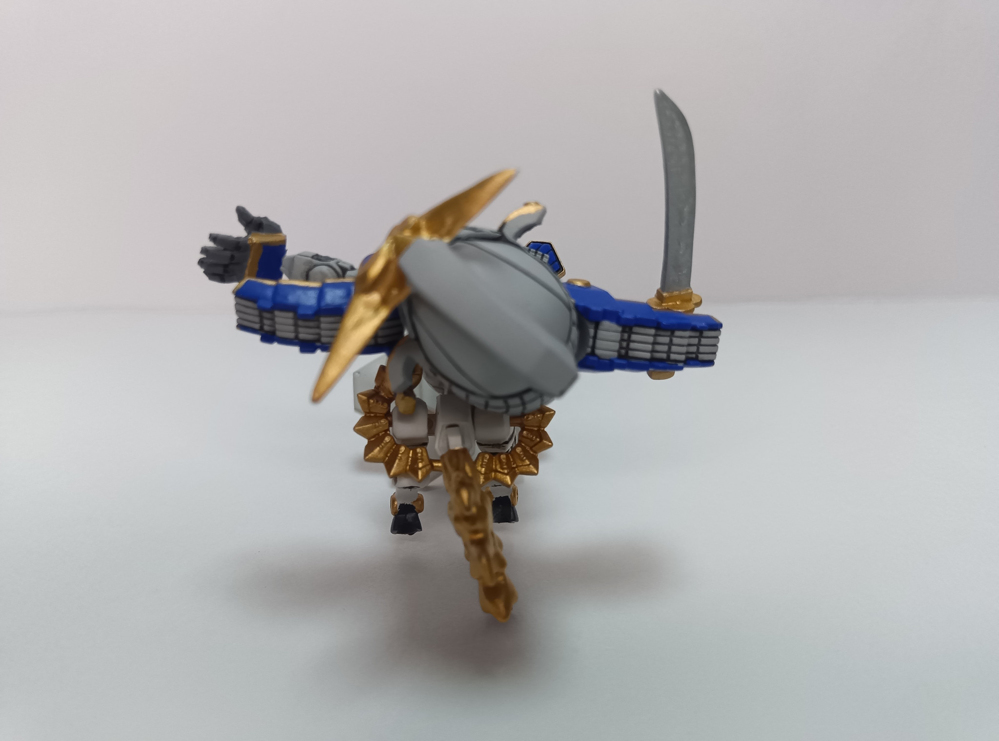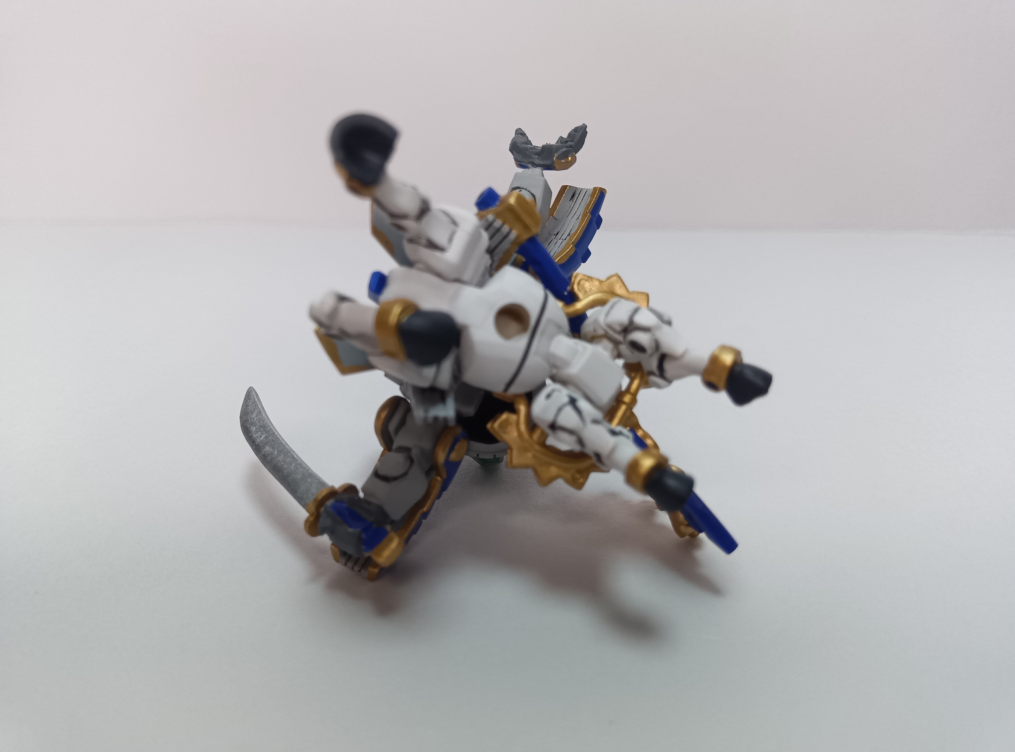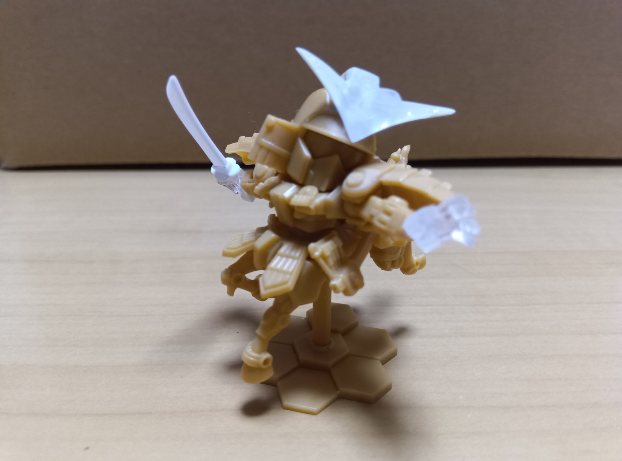 謙信頑駄無なので、「麒麟の神器」の翼と足首の飾りはナシ、接続部はそのままなので取り付けは可能ですが、その気はないので塗装もしていません。