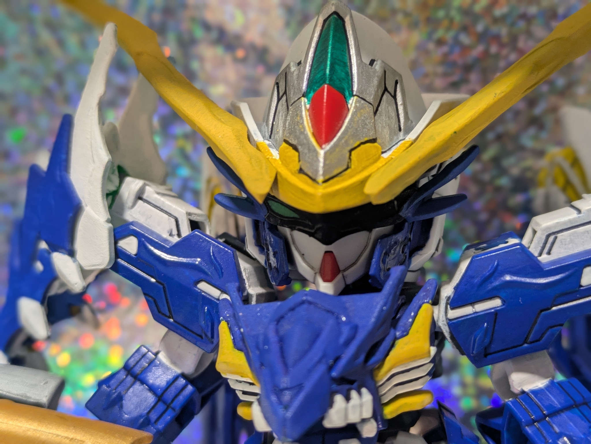 顔をアップで。モノアイを丸型ジュエルシールにすることも考えましたが,表情的に微妙でしたので,マスクの目を生かしました。三国創傑伝のAGE2が好きで,主人公の素体にも採用。顔以外はこの変身のために,龍賢劉備ユニコーンを多用してます。
