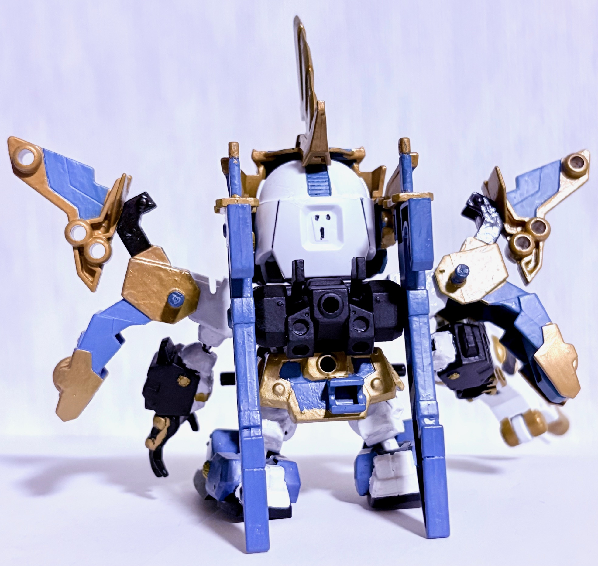 武器をすべて背中にしょわせた状態。重心が後ろに行くので、倒れやすい(gundam-kao10)