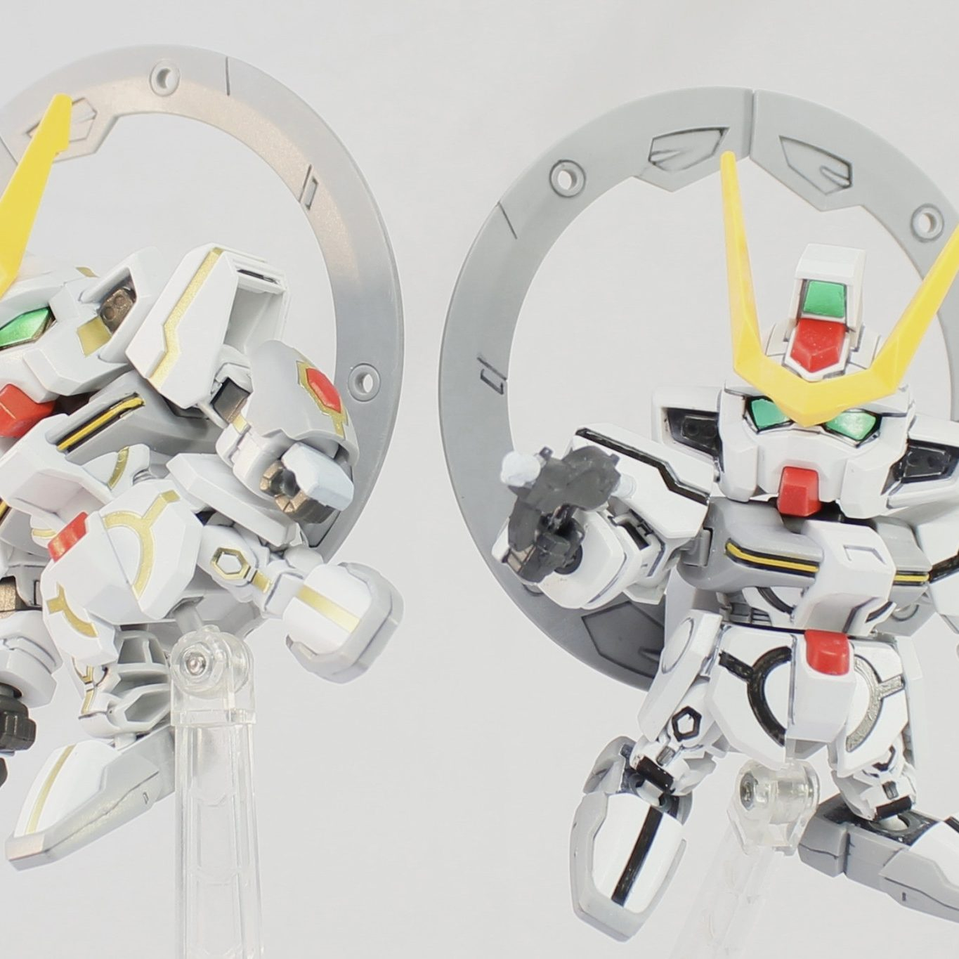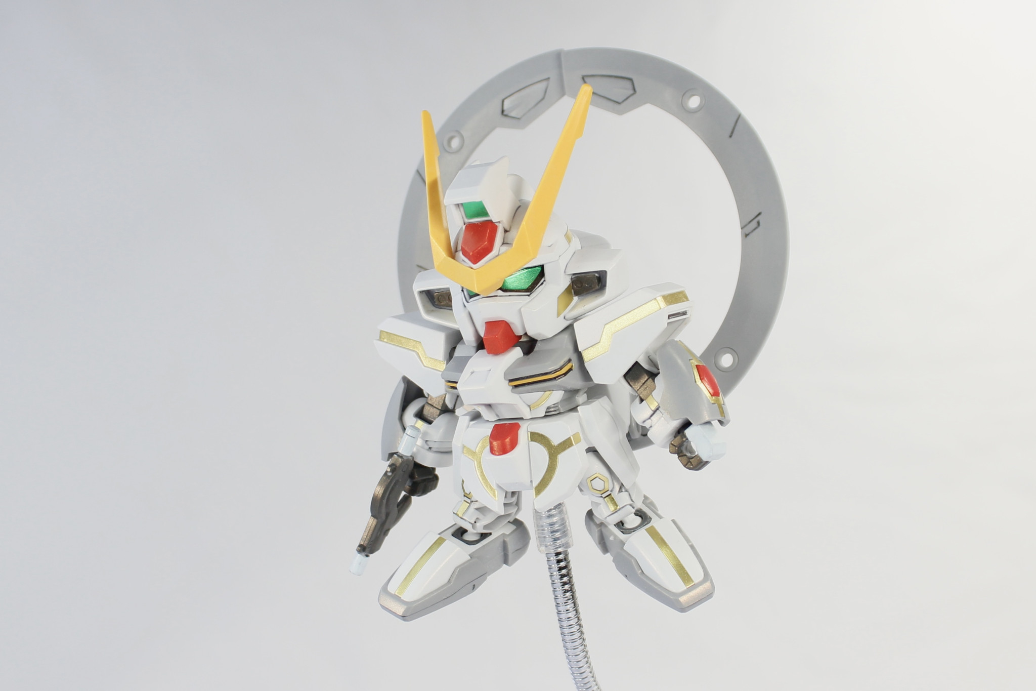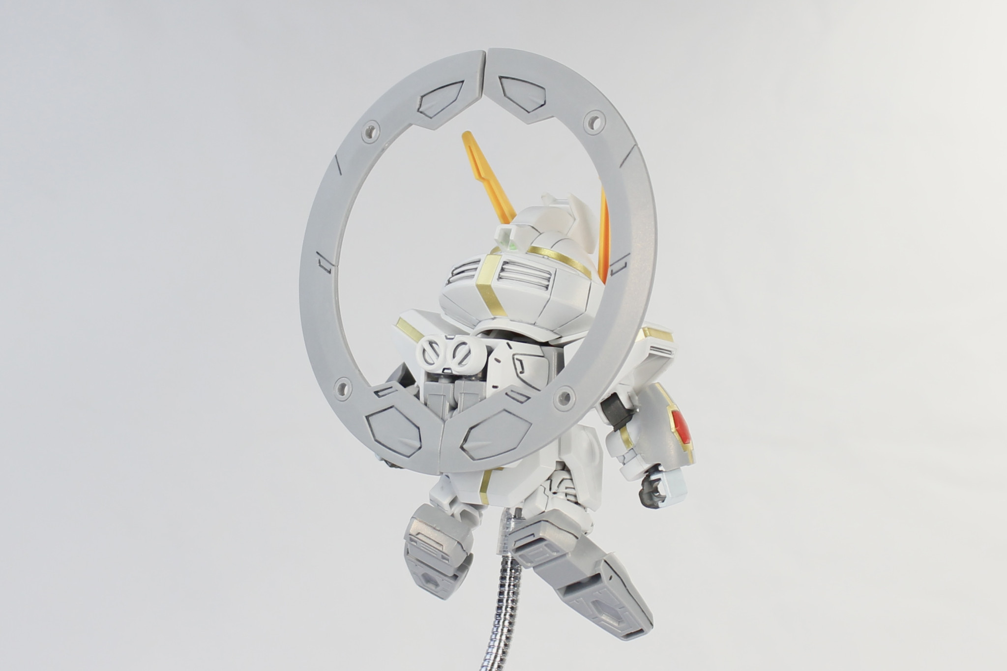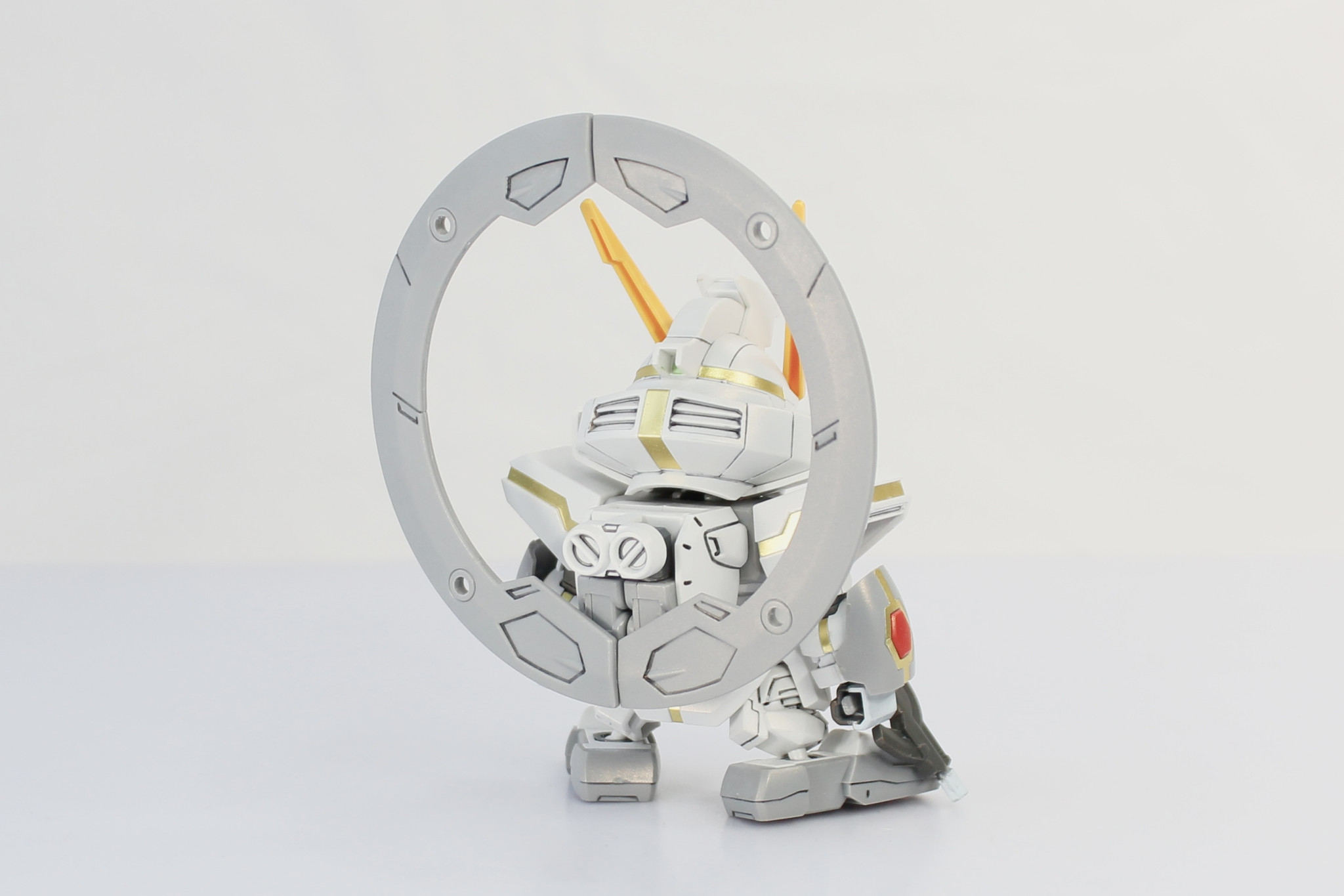 VLシステムの稼働状況に応じて、2体のBB戦士スターゲイザーガンダムを製作した。VLシステム稼働中の1体には付属の金色デカールを貼り、全体にパールゴールドを吹き付けています。