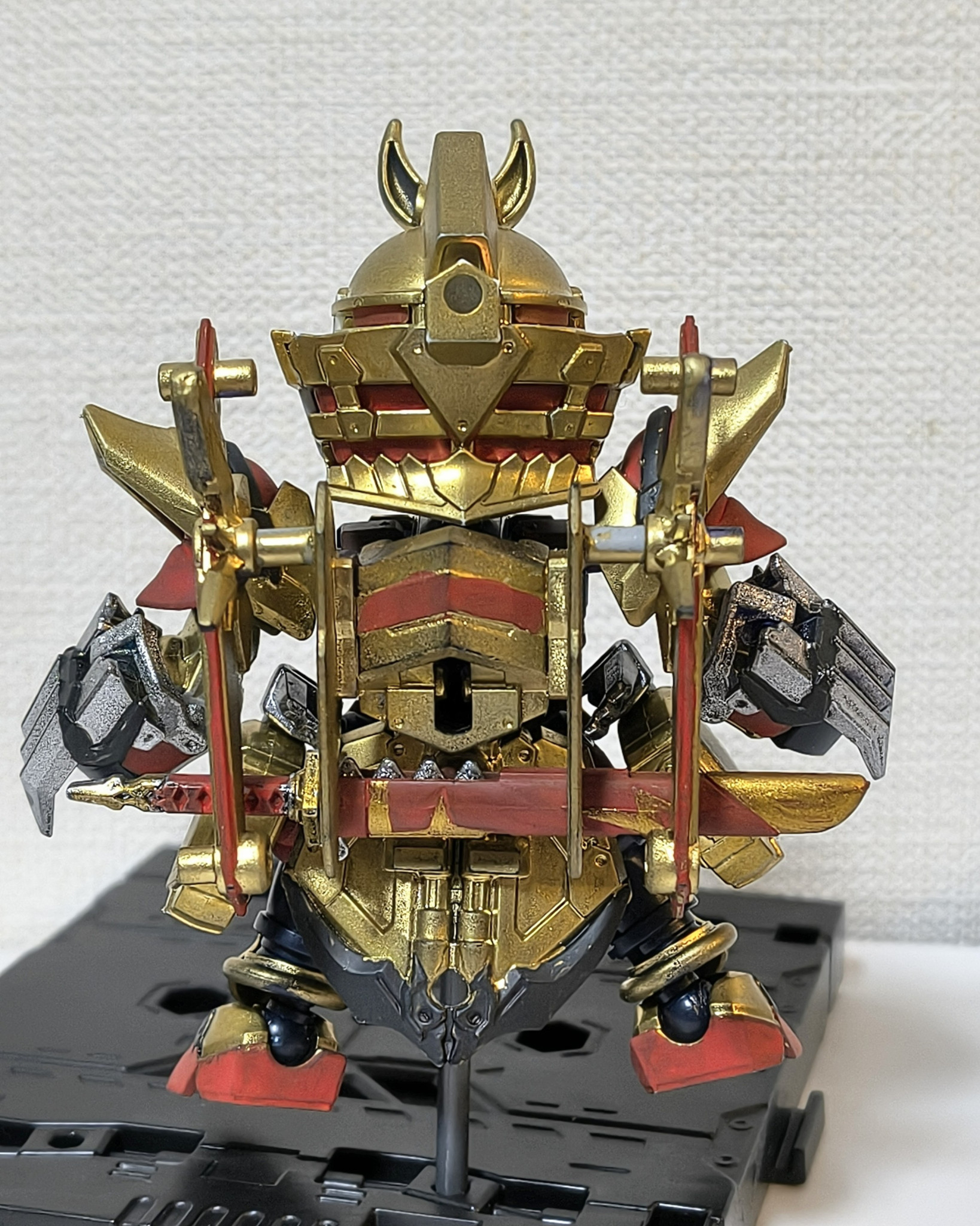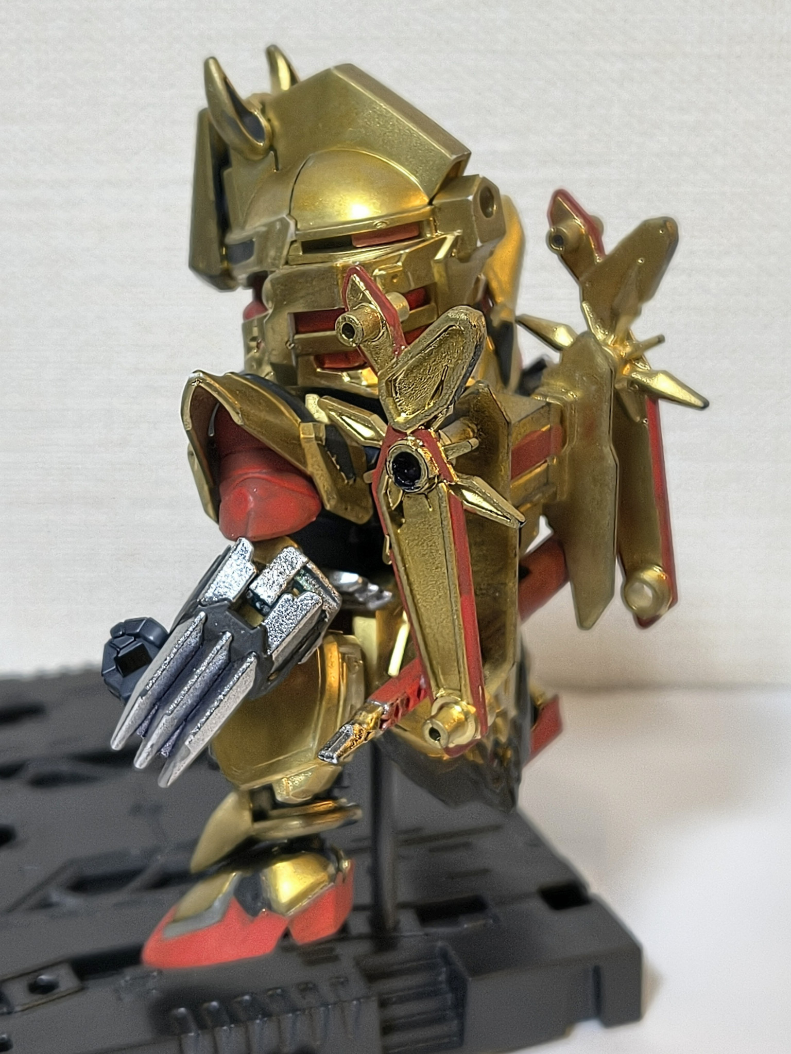 頭頂部の角や額の縦長部分、ヒゲ?の元祖SDガンダム百式改のカミツキギミックモチーフなどは百式改モチーフの名残です。
