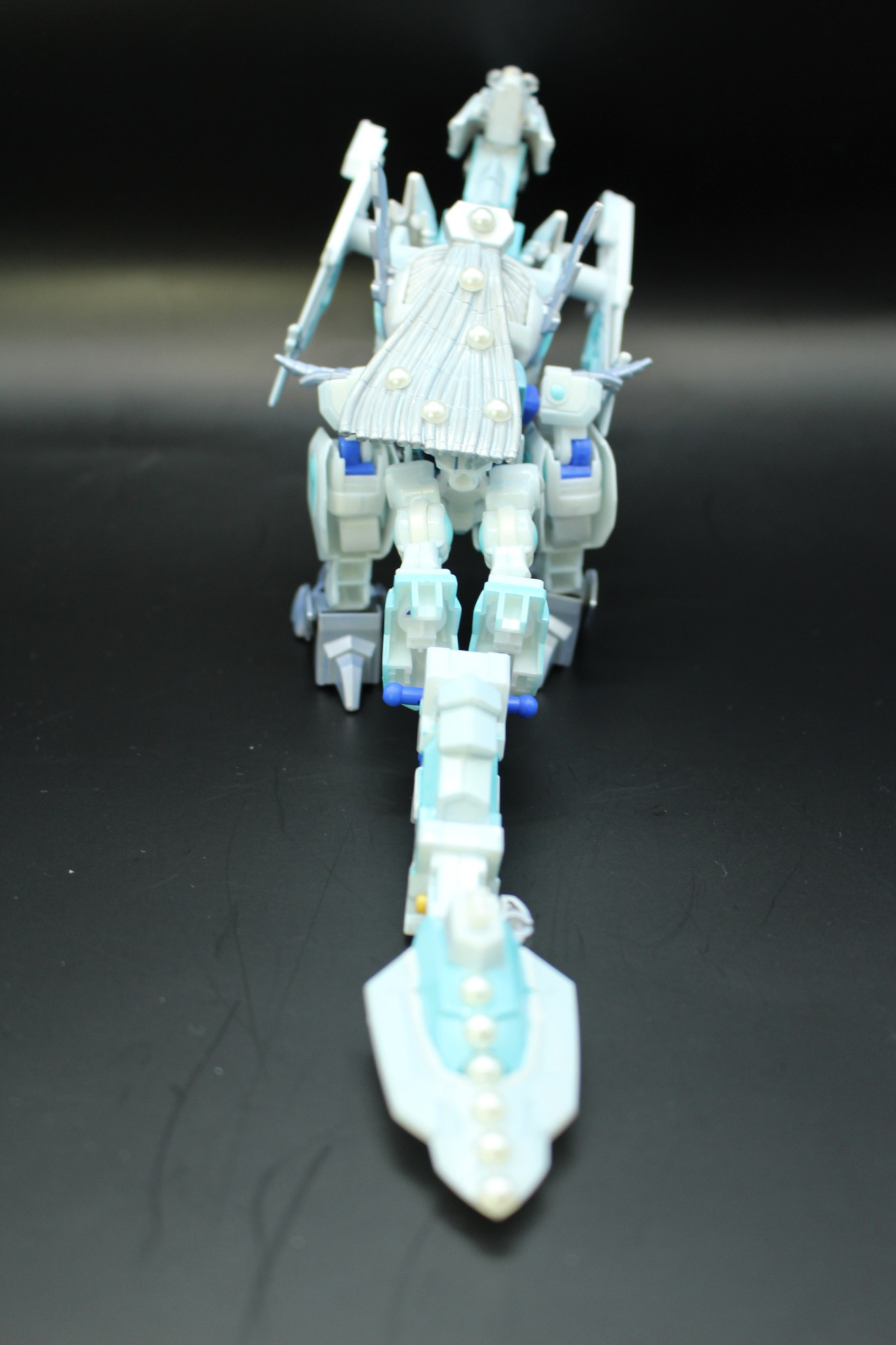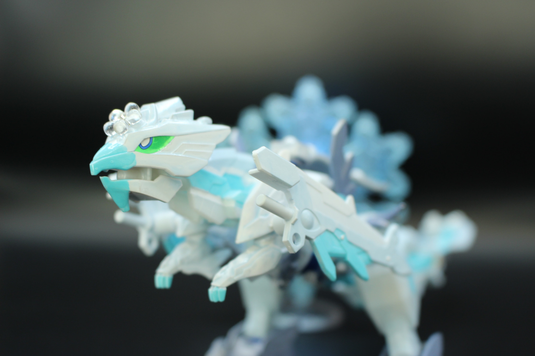 個人的にこだわりポイントは前足。元キットのヴァルキランダーのドラゴン形態では前足が無いため、シャイングラスパードラゴンの前足を拝借。そこに双剣をつけることで、ヴェロキラプトルの羽根を表現しました。
