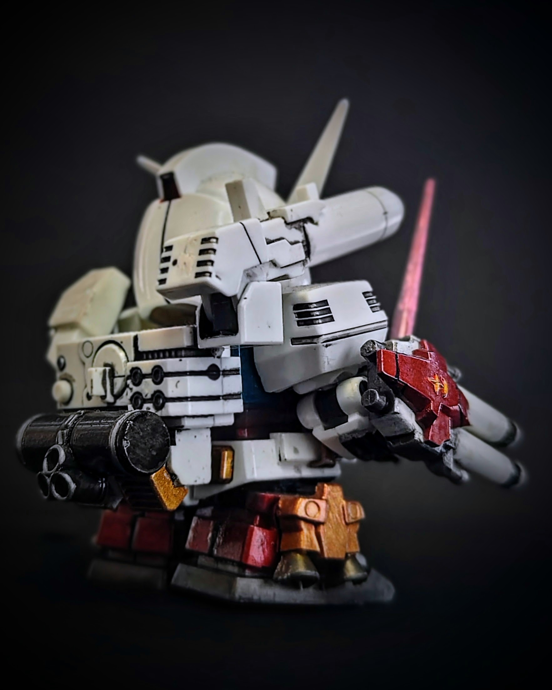 ガンダムの白場をどう塗るか色々試しているときに作ったもので、成型色に一部ガンダムマーカーのレタッチ(合わせ目消しやバリ取り跡等)を施しつつ、その他はシタデルカラーの筆塗りで塗装しています。