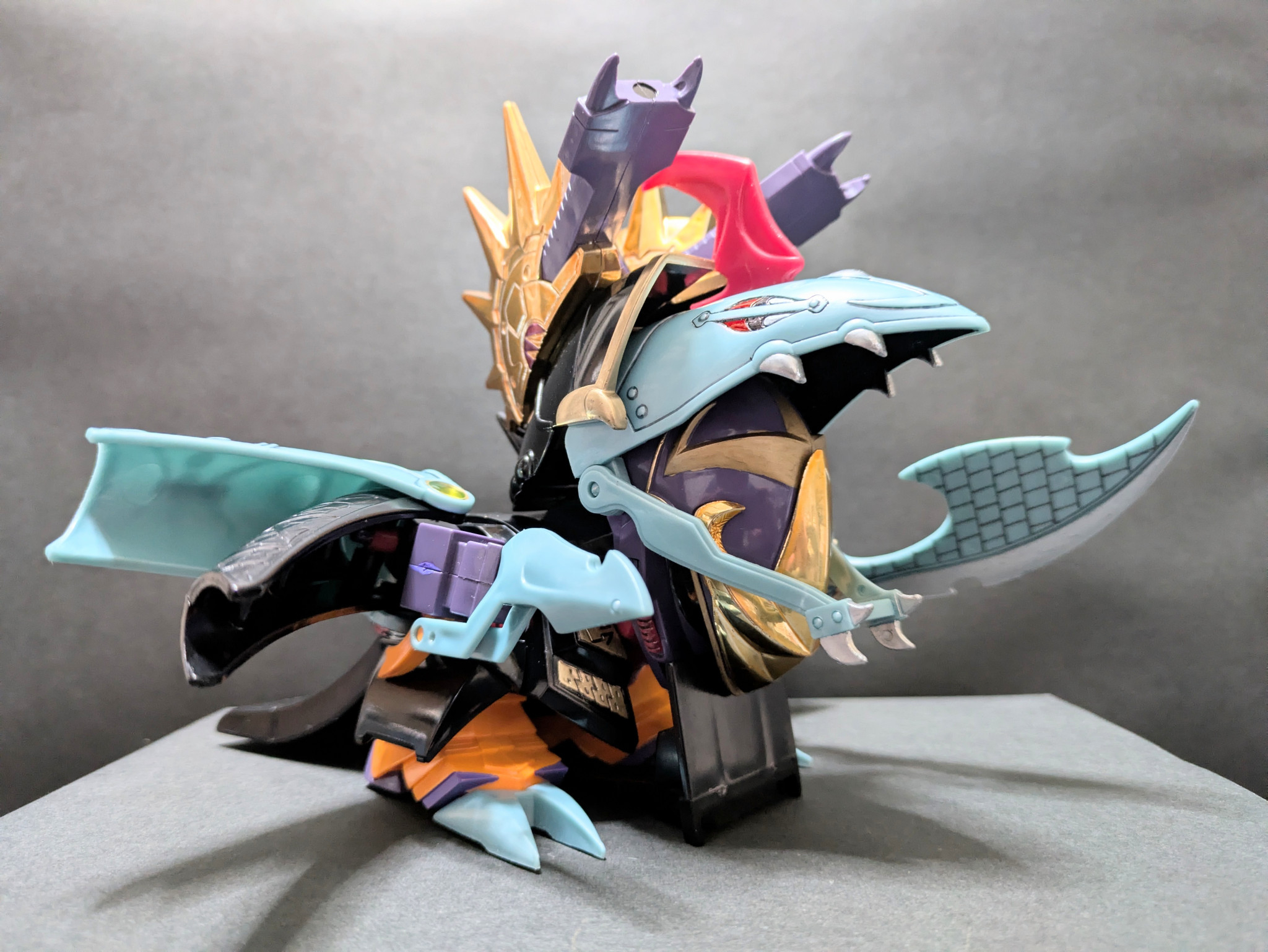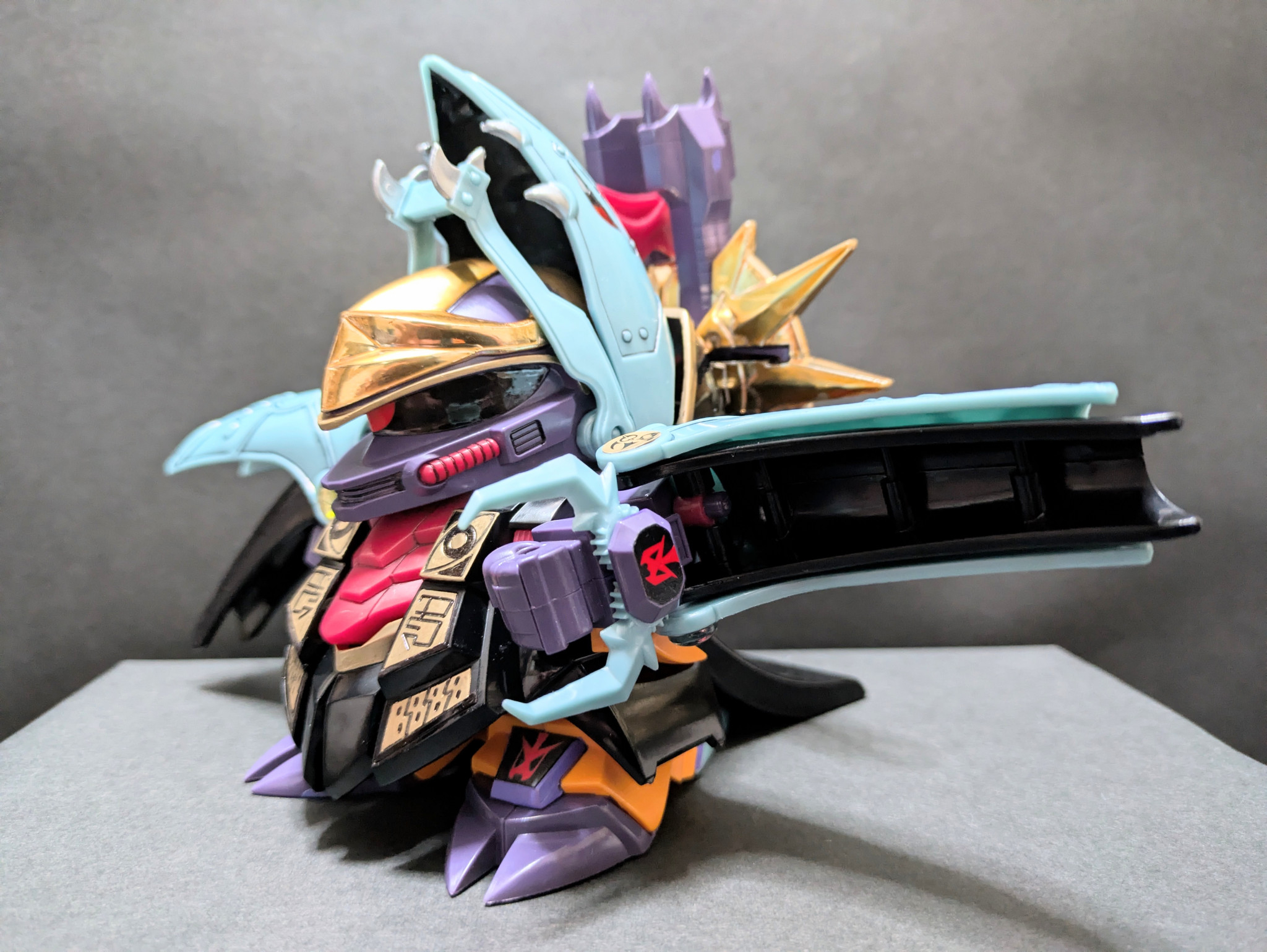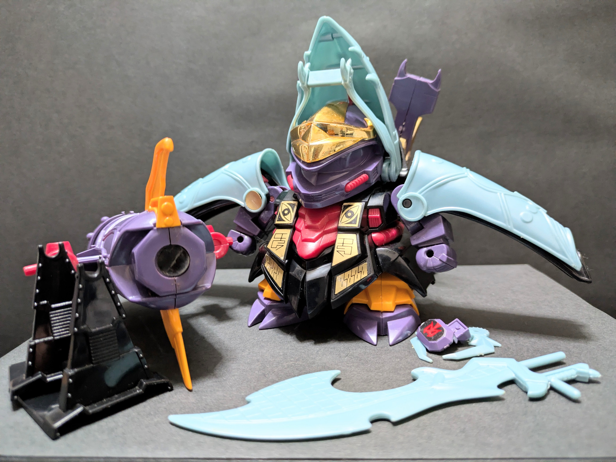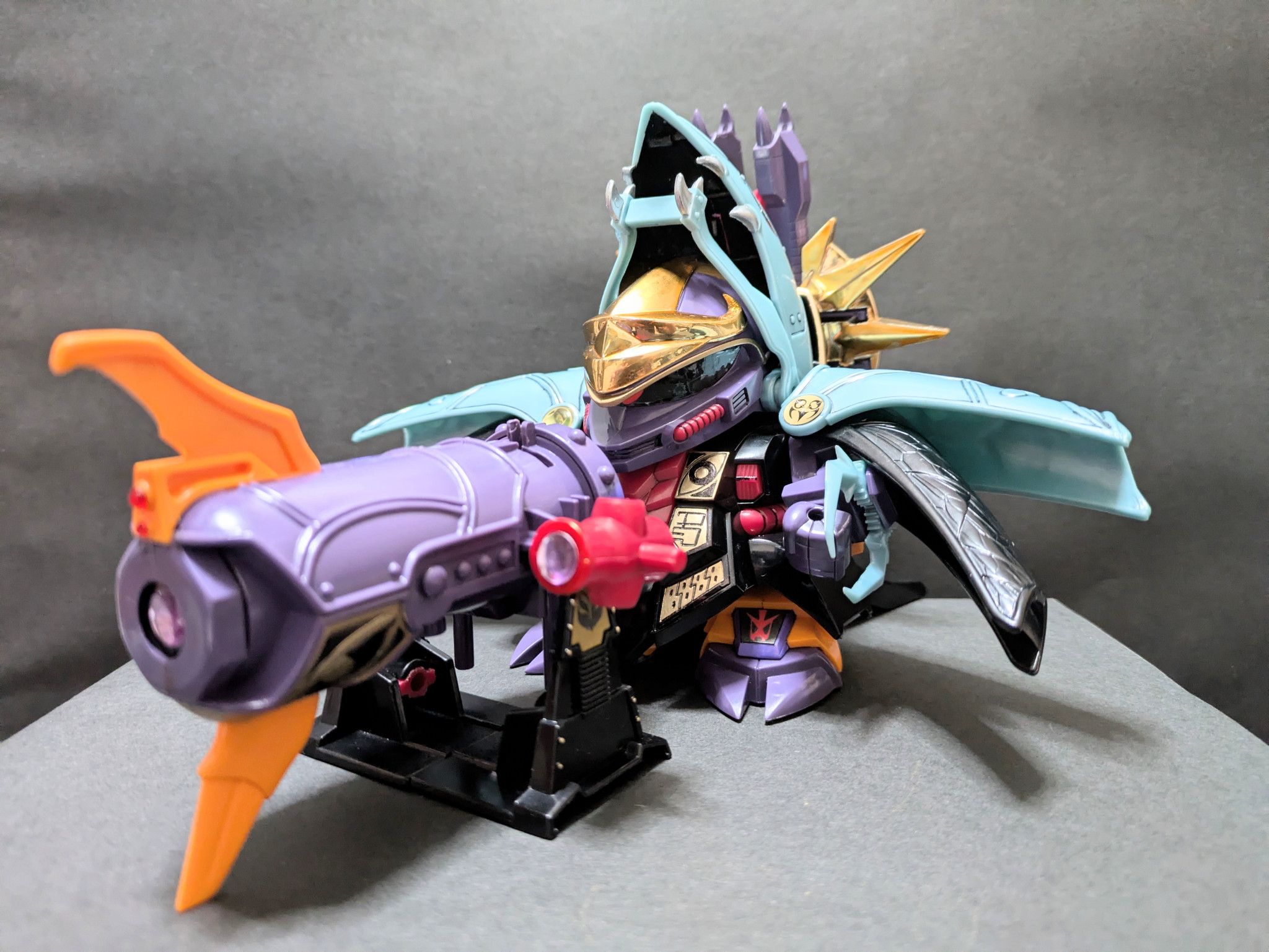 闇の鎧と大暗黒幻砲が合体した闘獣モード。こちらも元祖SDにしかないギミック。こちらもなかなかのボリューム! 驚く事にアクションベースがすっぽり接続できる穴が大暗黒幻砲に設けられていました。他に用途も無いし…アクションベースなんて小洒落たもの、あの頃あったのかな?