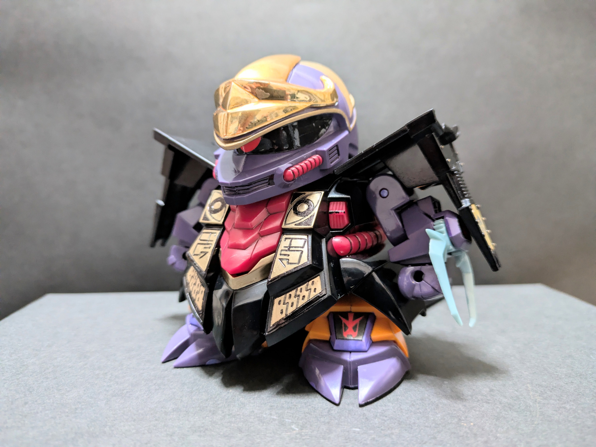 大人になっても忘れられない子どもの頃のおもちゃって一つはありますよね。私にとってのそれはやはりガンプラなのですが、その中でも特に記憶に焼きついているキットがいくつかあります。BB戦士より元祖SDが好きだったあの頃…デパートやおもちゃ屋に行けば当たり前のように元祖SDが陳列されていたあの頃…味方よりも悪者にカッコ良さを感じていたあの頃…私の中で最凶最悪にして最高最強のキットがこの闇皇帝でした。大事にしていた記憶はあるのにいつの間に失ったのか何故か覚えていないものです。いつか取り戻したい。ガンプラ制作を再開する以前から心の隅にずっと抱いていた夢が叶いました。今作、次作は懐かしき少年時代のノスタルジーに皆様も一緒に浸ってください。