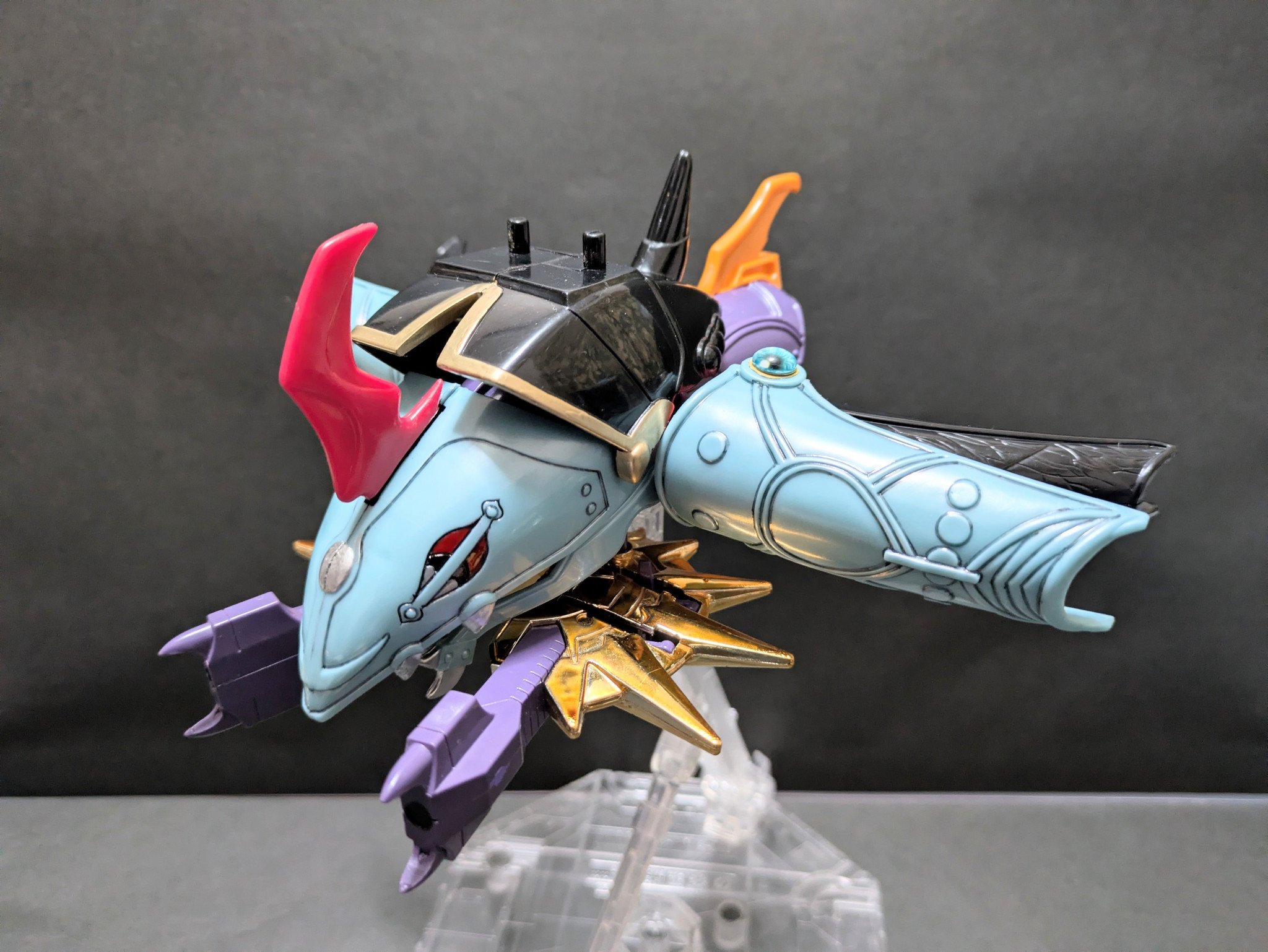 パッケージとは印象の異なる成形色なんですが塗り直しはせず。私の中の闇皇帝はやはりこの色なんです。シールは劣化でホロホロだったので慎重に剥がしましたが、ほぼ全滅。もともと粘着力の落ちていたものは再利用できましたが、ほぼ塗装で賄いました。胴体の幾何学模様と黒幻王の四つ眼の塗装が一番苦戦しました。頭部の金メッキをはじめ色褪せやメッキ剥がれは多少補修しましたが、小キズは敢えて残しました。35年の歳月を経て我が手に戻ってきた勲章みたいなものです。