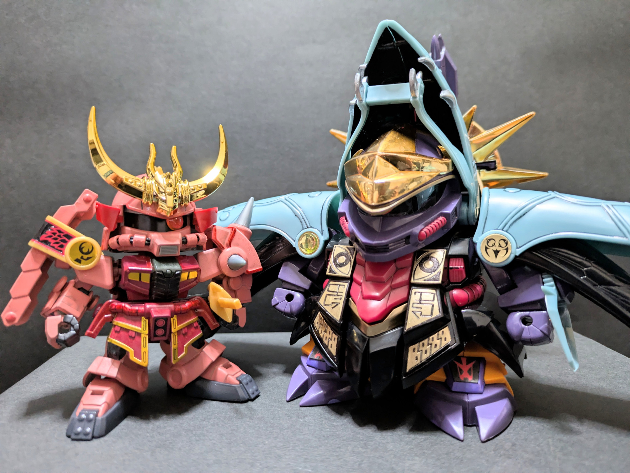 直属の配下である前作、魔殺紅と。完成度の高いレジェンドBBと並べてもこの圧倒的ボリュームと遜色ない完成度。ちなみに闇皇帝様、当初はザクIIとメッサーラをベースにデザインされていたが、紆余曲折を経て限りなくオリジナルのデザインであるこの姿になったとの事。一応モチーフに通じるところがある御二方です。