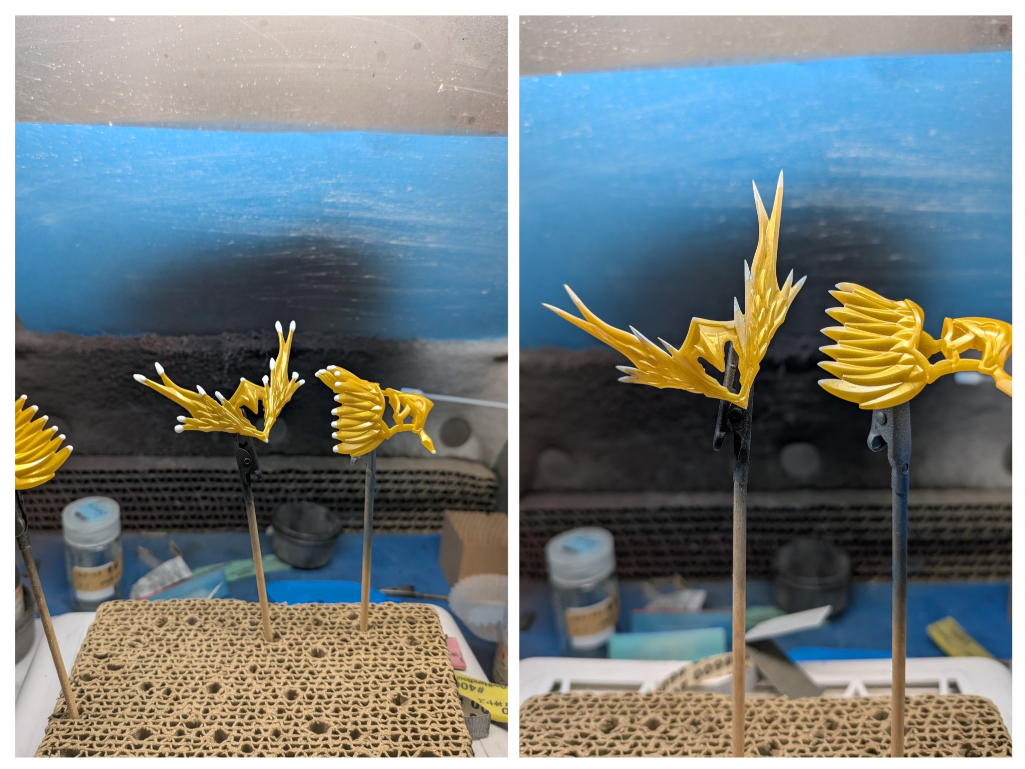瞬間接着剤にベビーパウダーを混ぜて尖らせたいところに 盛ってヤスリがけをするっていう簡易なシャープ化手法です!冠のパーツには真鍮線入れて瞬着盛りです