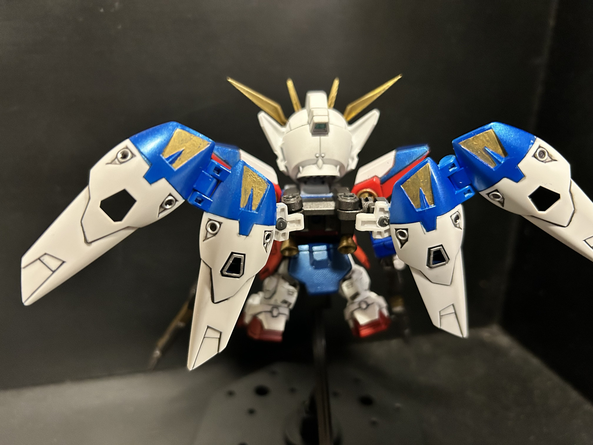 足の後ろの肉抜きをパテで埋めて、SDのGP01の余った腰パーツの一部をくっつけてそれっぽくしました。 バックパックは羽の可動域を良くする為になんかわからんパーツと、その辺に落ちてたバーニアを付けてそれっぽく。
