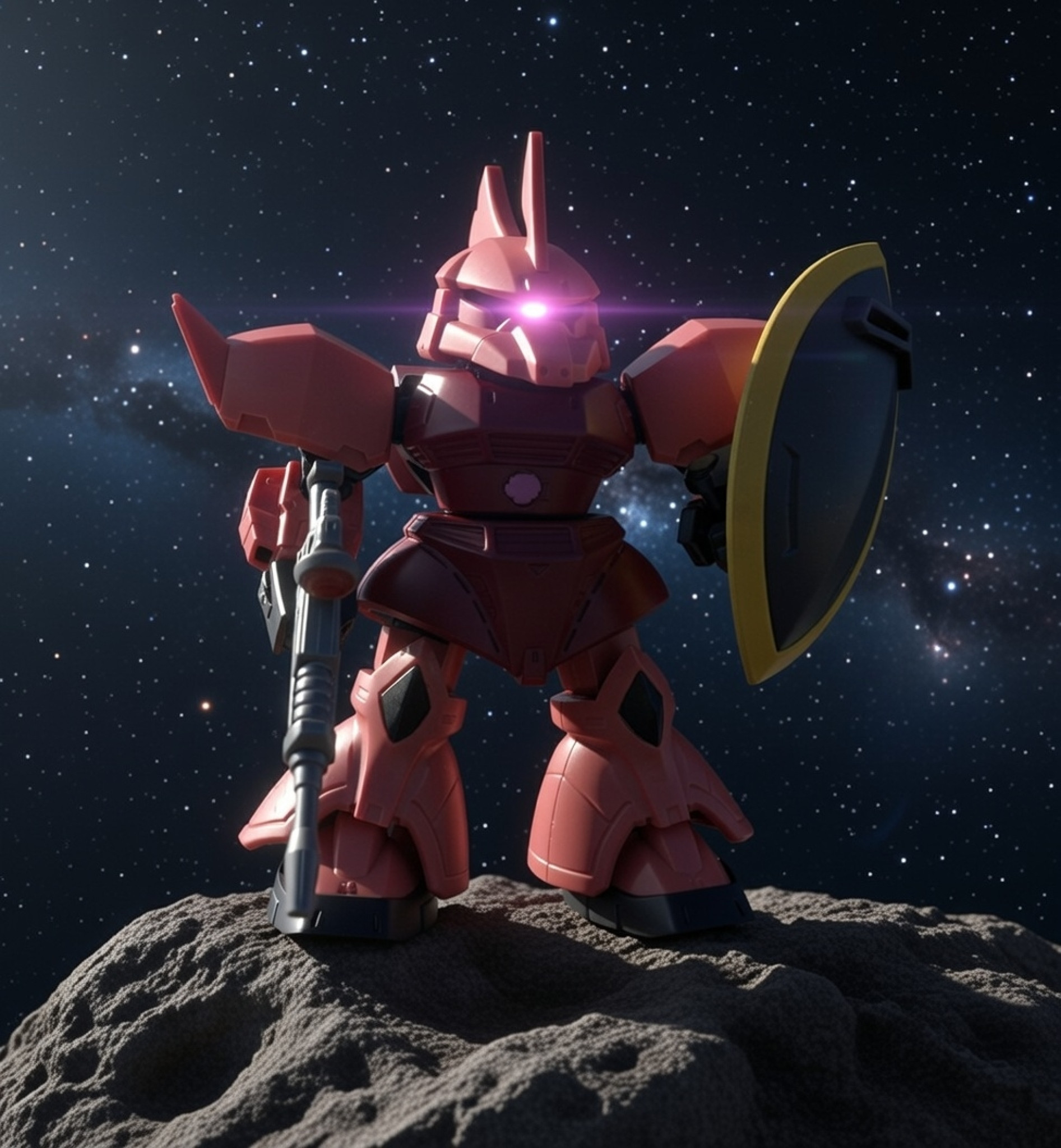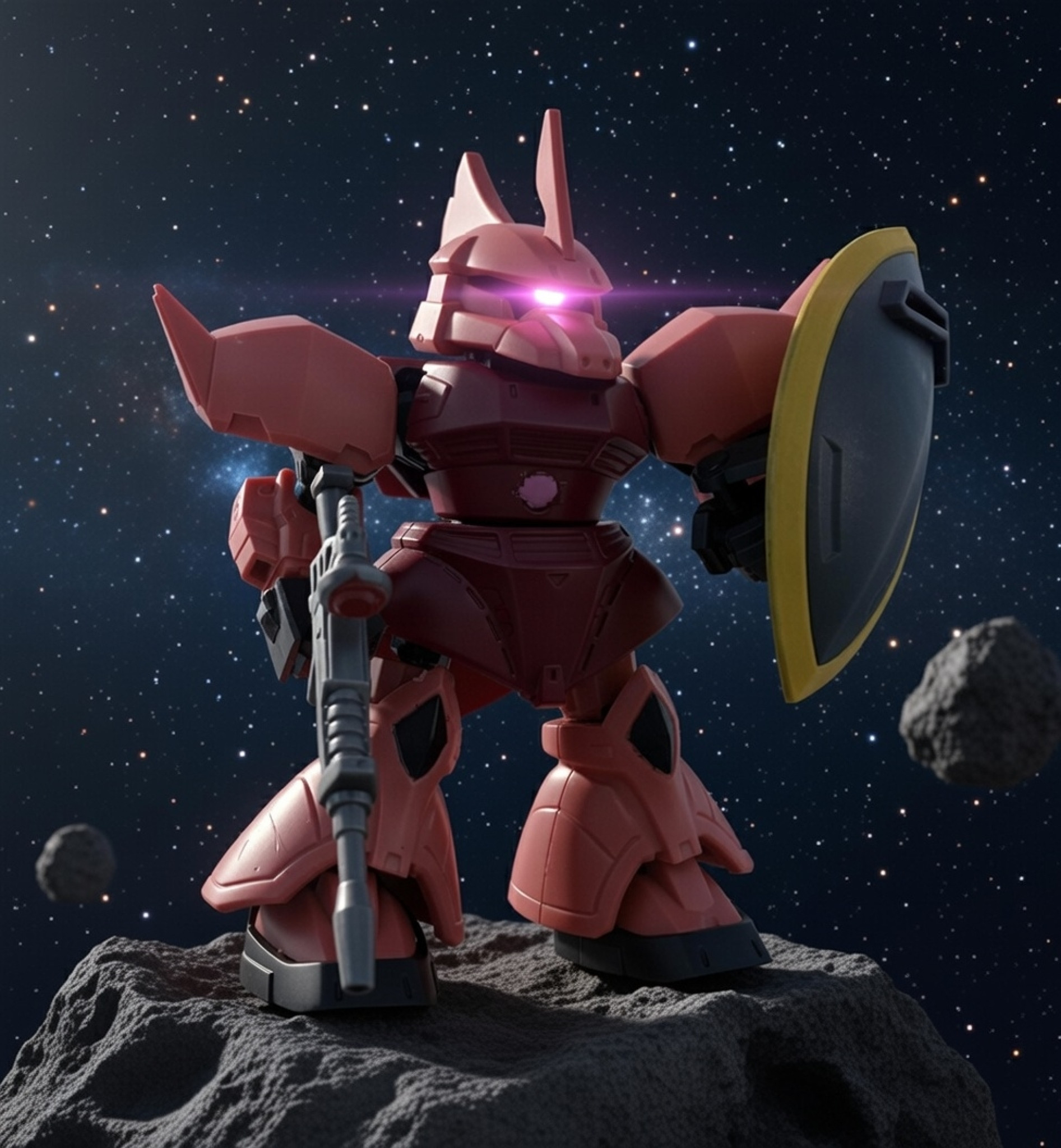 例えば宇宙空間なら、「背景を宇宙空間に変更。浮遊感を与える。被写体の構図はそのままで。モノアイはピンクに光る。」と入力すれば上記のようなデジラマ写真ができあがります。