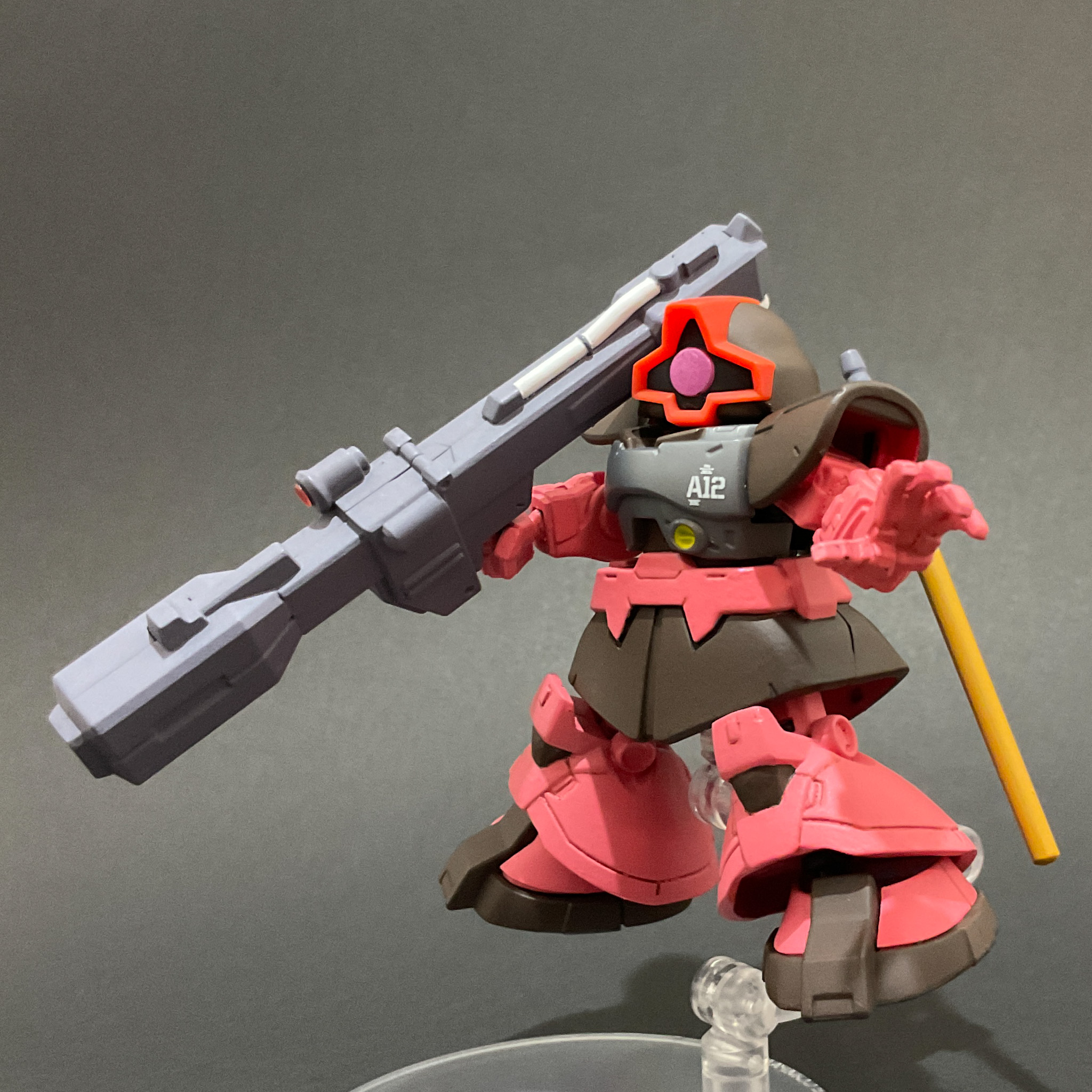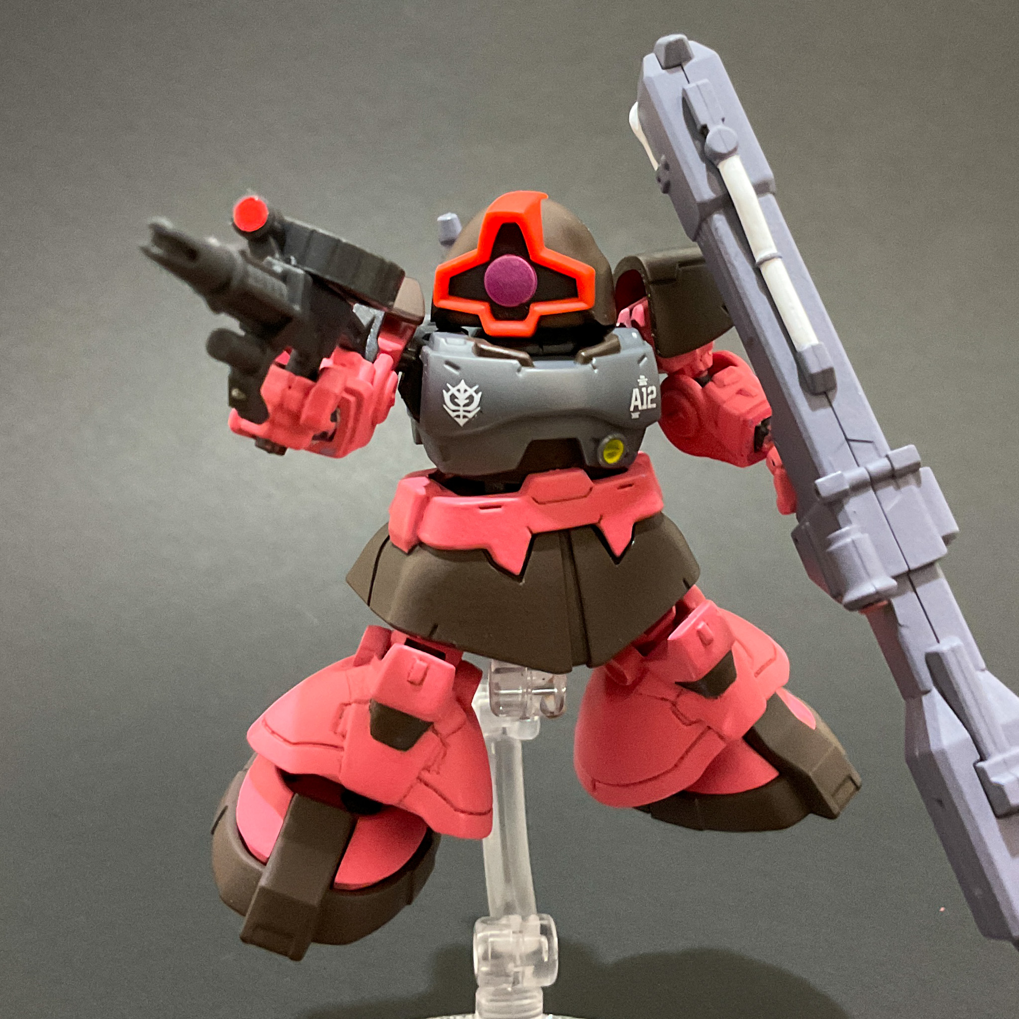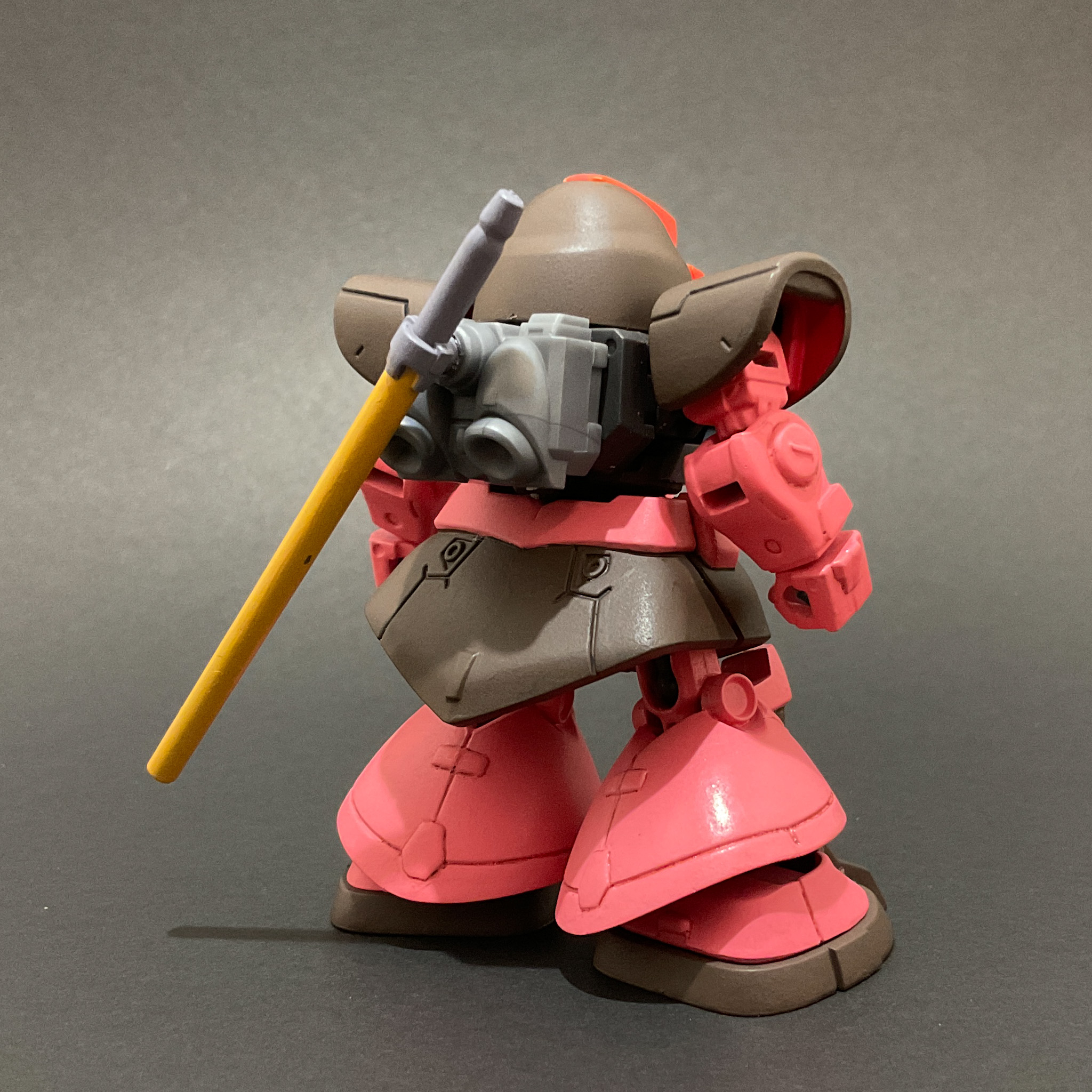 本体のピンクはクレオス ジークアクスカラーの赤いガンダムピンク、ドムで言う黒い部分は水性ホビーカラーのマホガニーで塗っています。胸にRGシャア専用ザク用のガンダムデカールを貼っています。工作はヒケ処理のためのヤスリ掛けや脛の部分の合わせ目消しをしたくらいです。