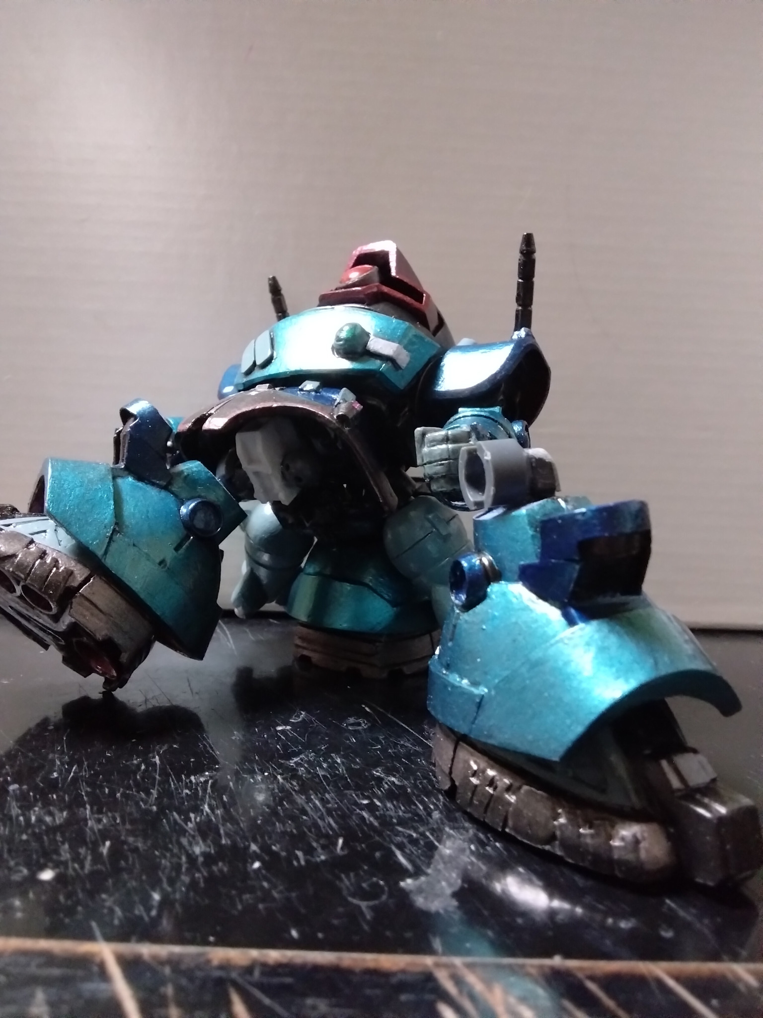 宇宙用なので、浮遊感を意識して撮影してみました。機体色は、アナベルガトーのリックドムや、GQ時空ならあったかもしれないランバラル専用機のような色合いにはならないように意識しました。