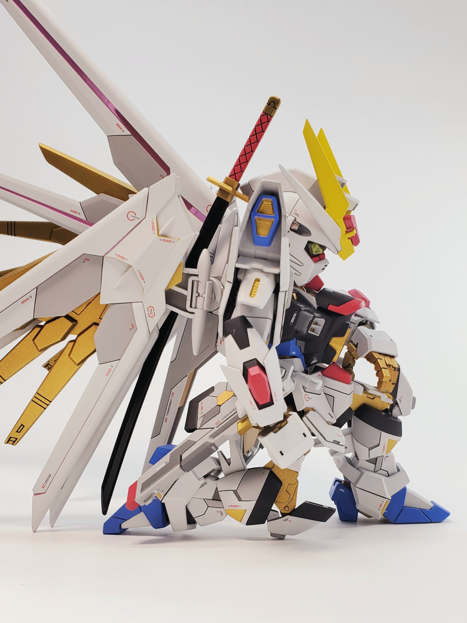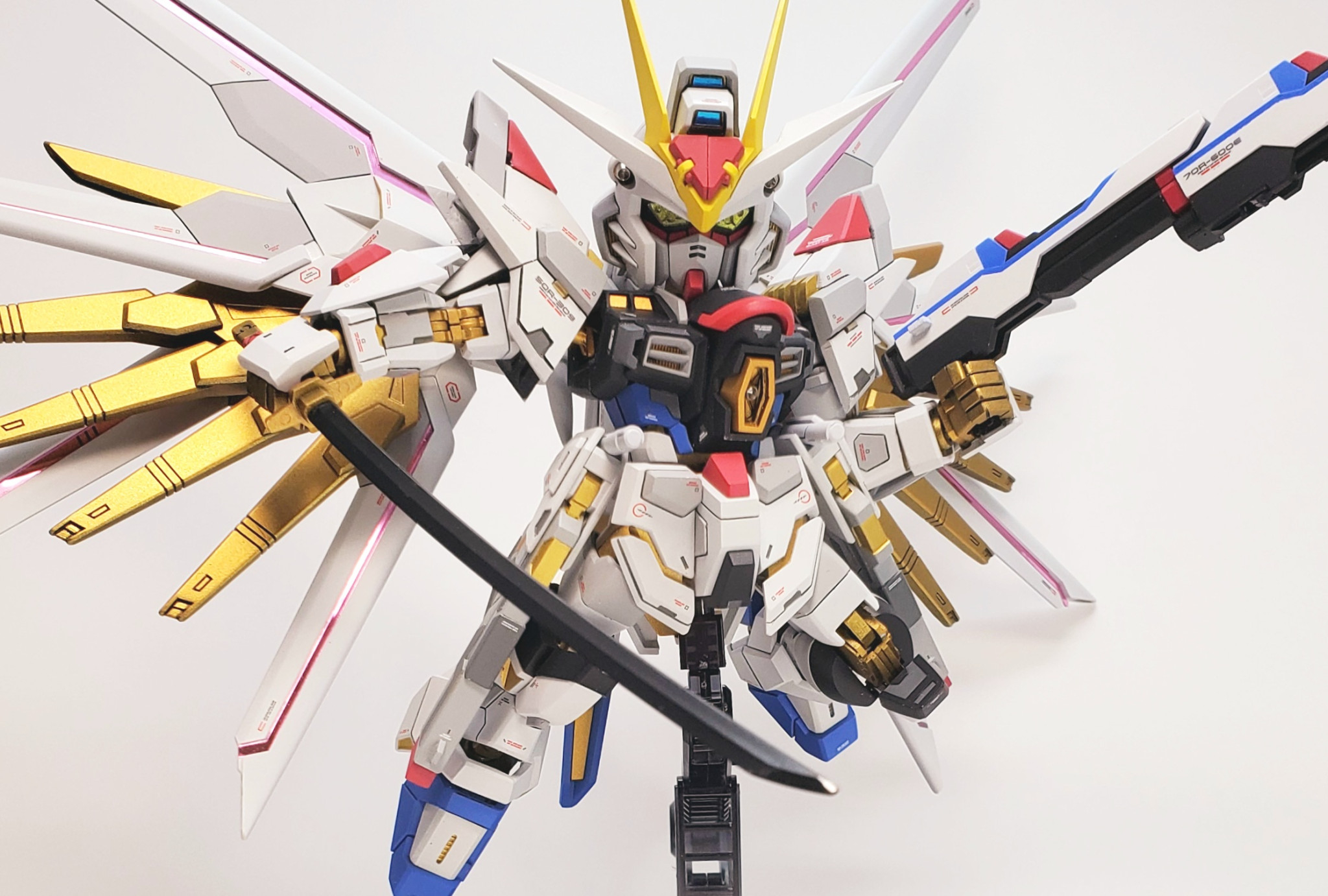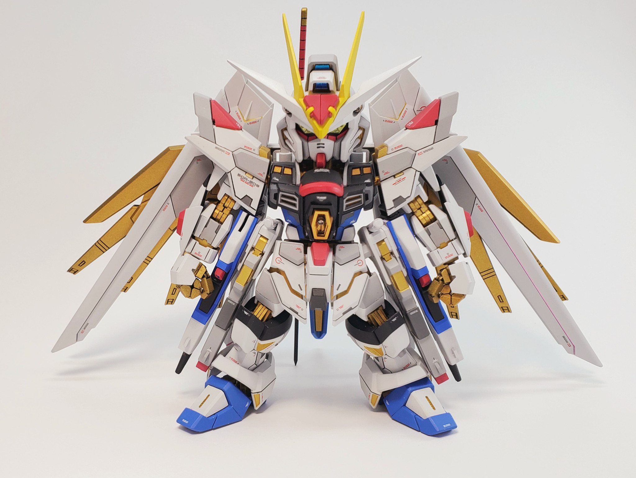 HGマイティストライクのMGSD化です。MGSDキットは一切使わず、HGとSDのみでMGSDの可動・プロポーション・ディテールを再現しました。