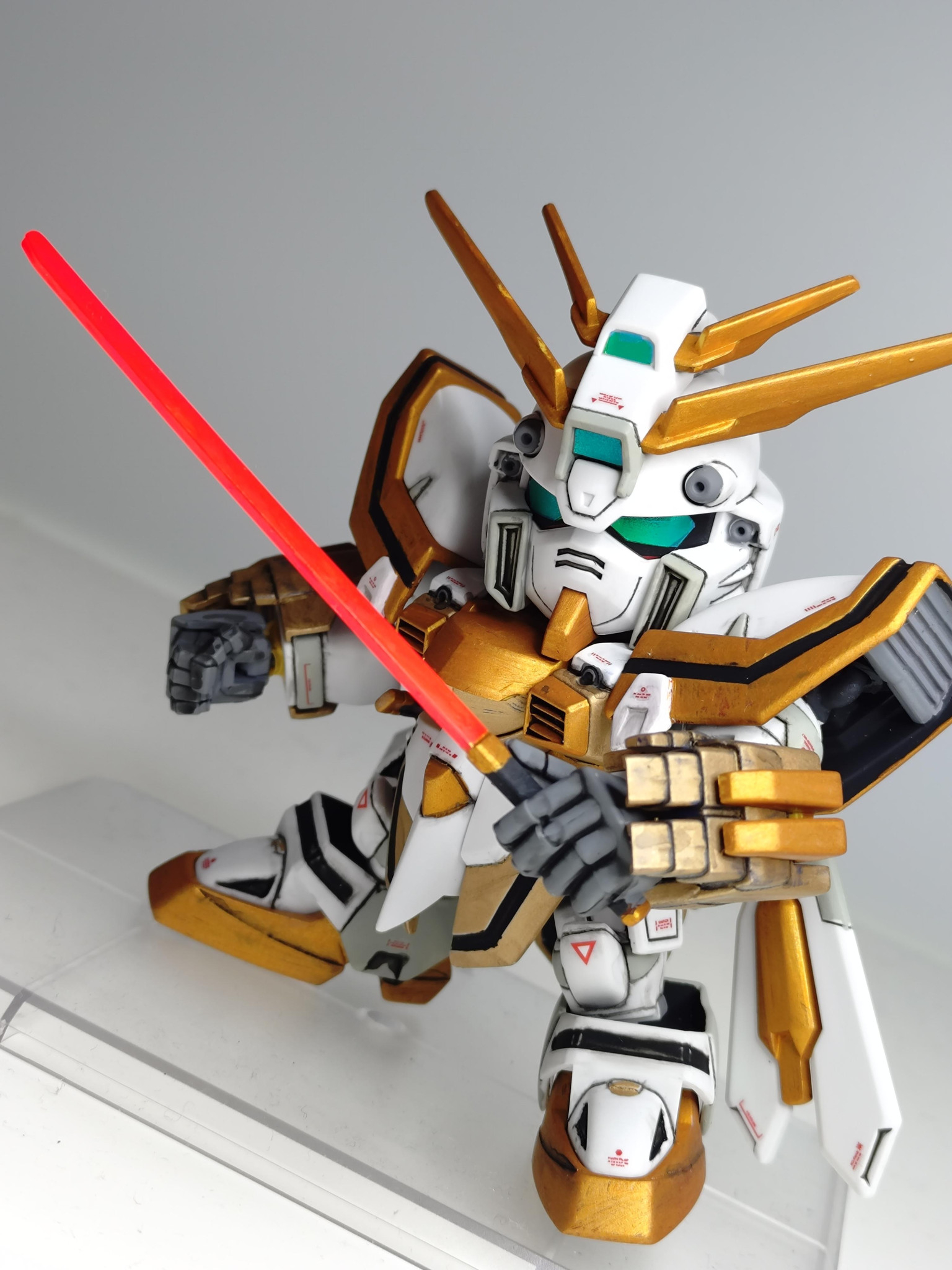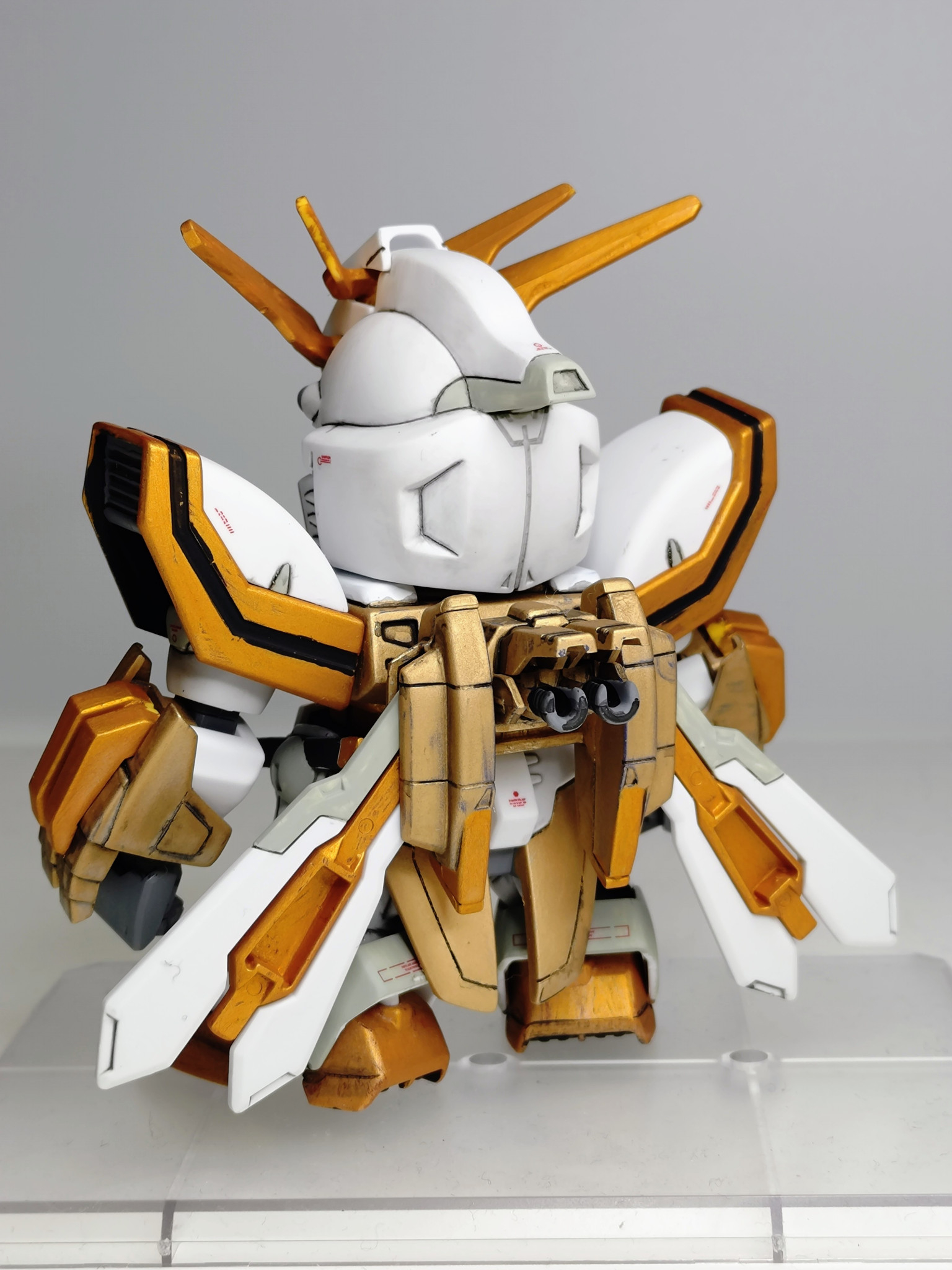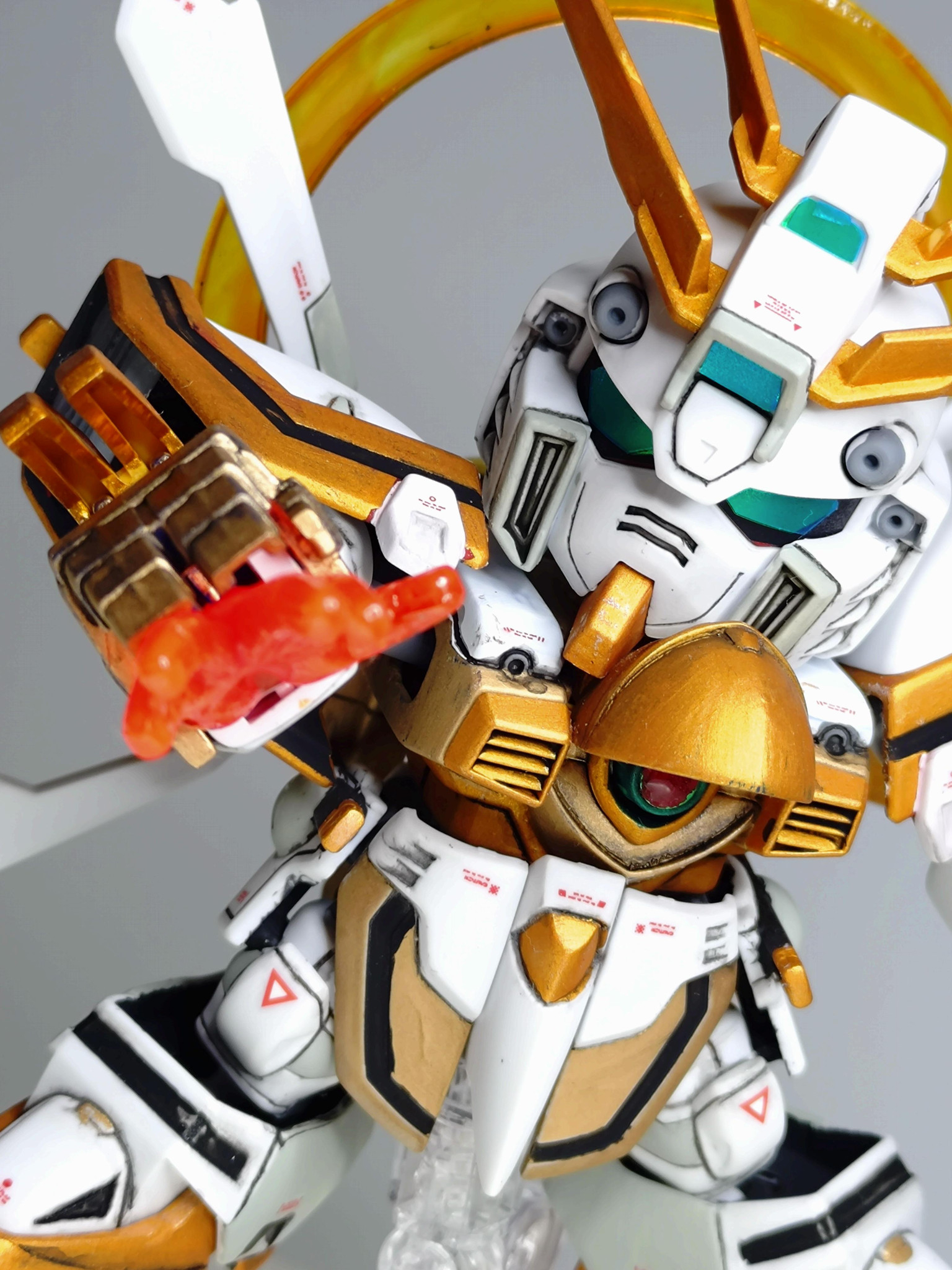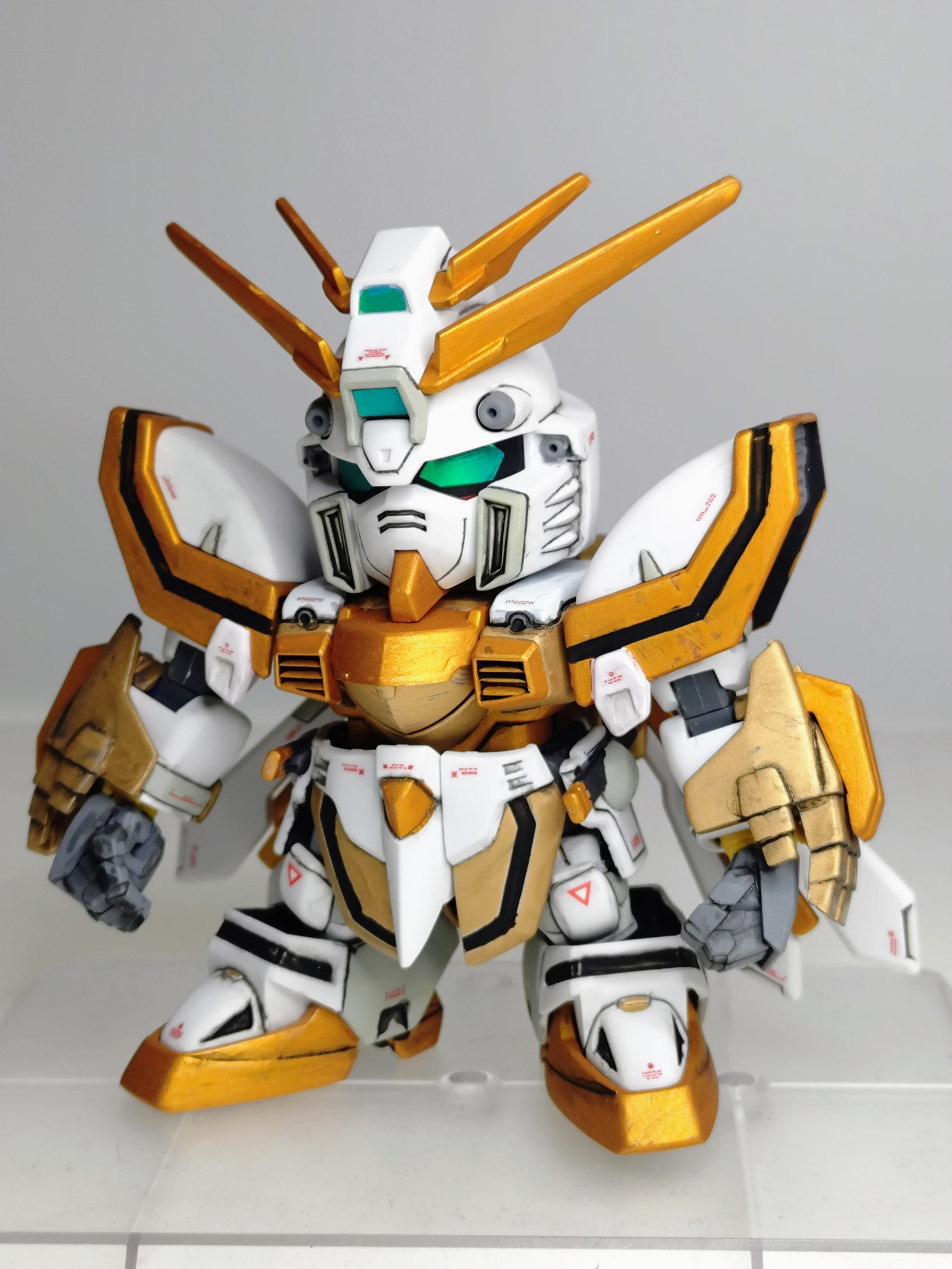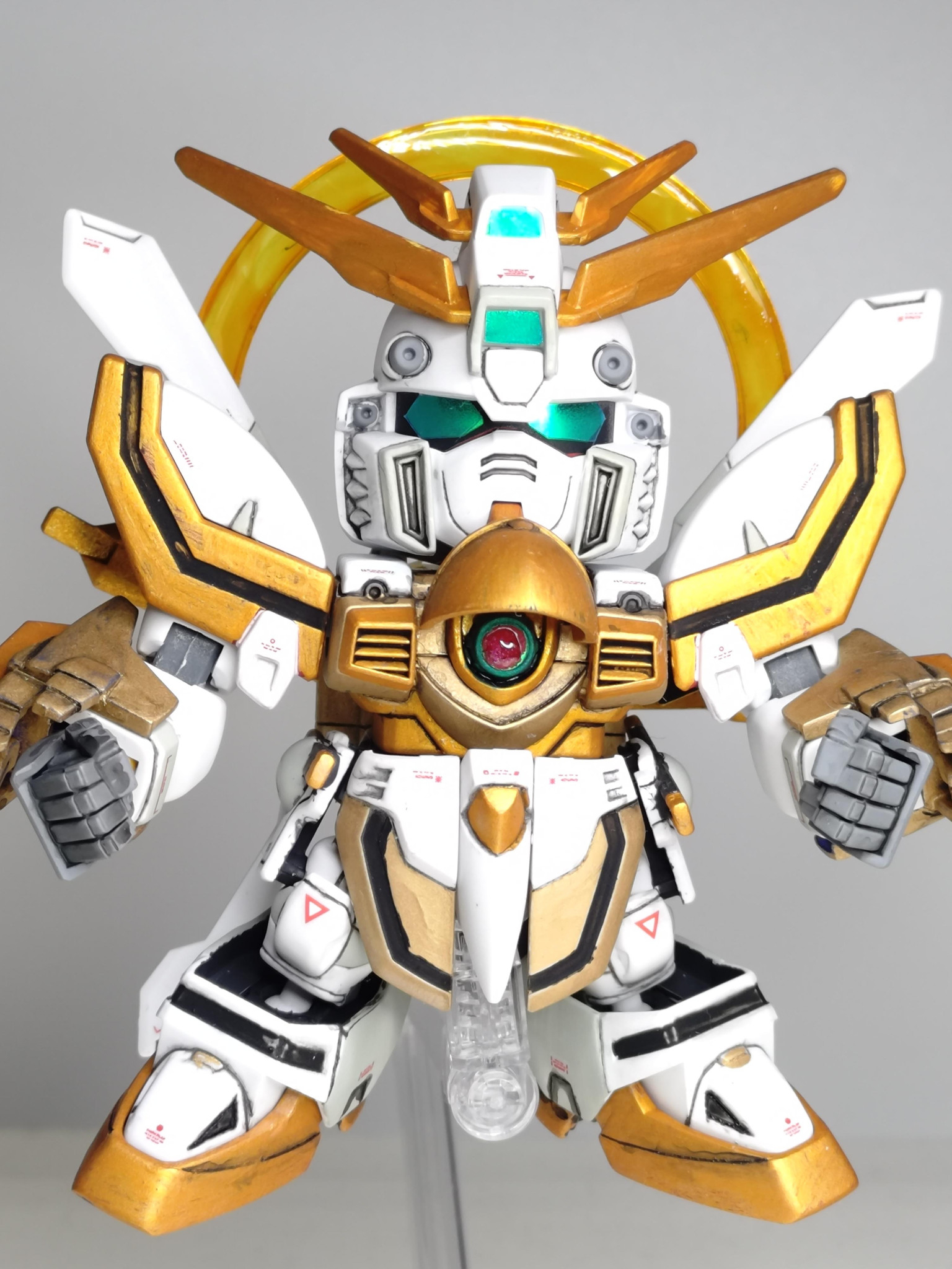 機動武闘伝Gガンダムより「SDゴッドガンダム」を全塗装で作成しました!全身金ピカにやや抵抗があったため、白い部分を残すような配色しました。こちらはどなたかの作例を参考にさせていただきました!