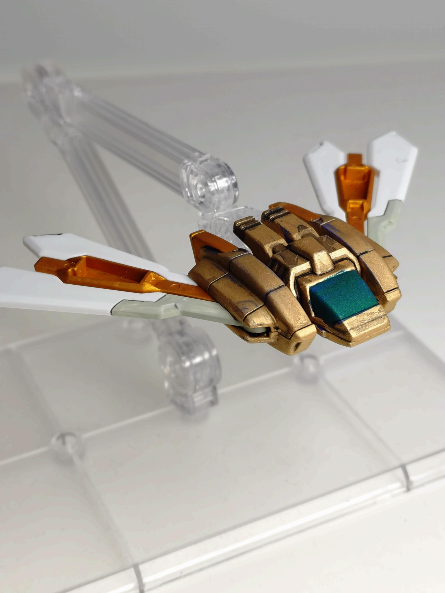 本体に合わせて配色。コックピット部はメタリックグリーンで塗装しましたが、どうせ合体して隠れてしまうのでさらっと塗りました。