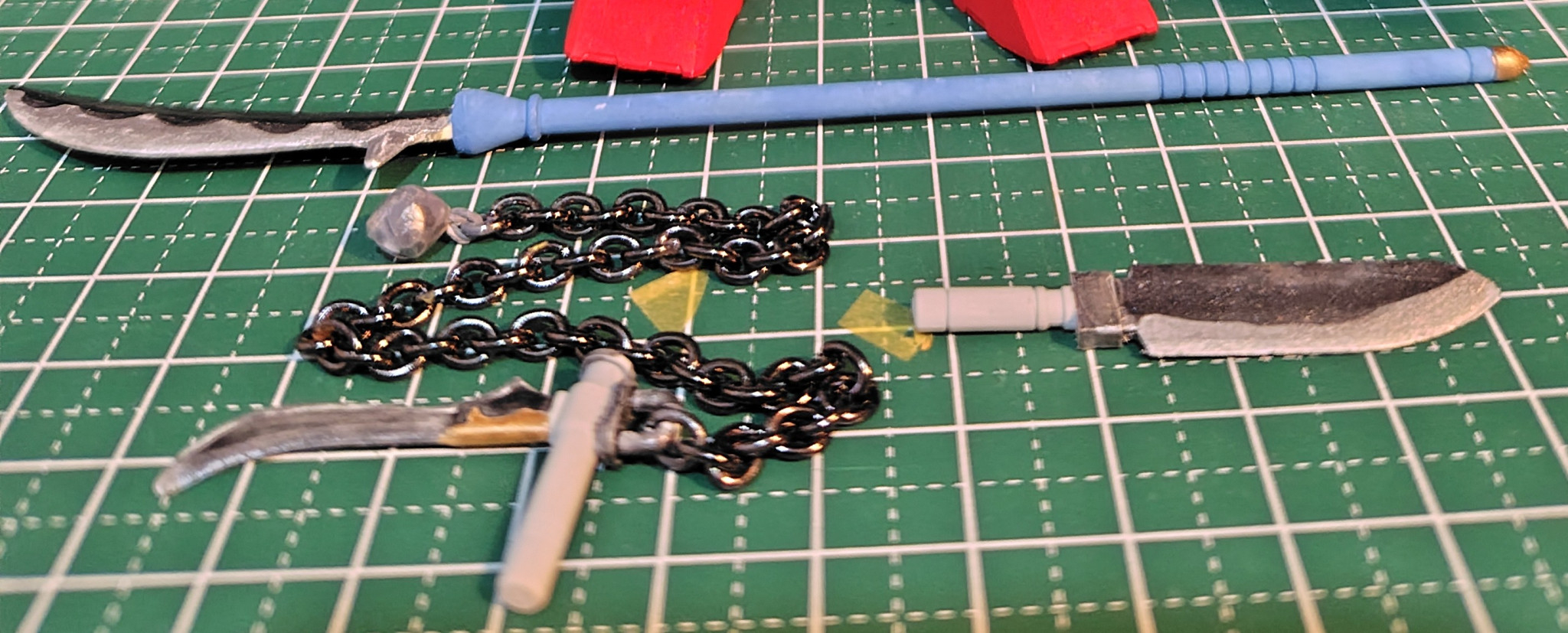 - クナイ(?) 忍者=クナイなので1/144のデミ用パーツセットから流用。どう見ても包丁にしか見えん悲しい武器。闇軍団の国に潜入する時はサラシに巻いて料理人と偽って持ち込んでいるのかもしれません。