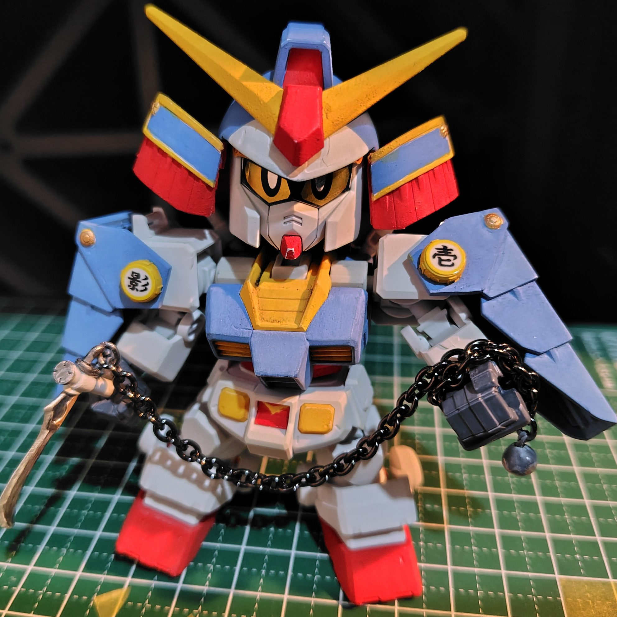 - 鎧 LEGEND BB版は豪華過ぎたので武田信玄頑駄無の物を使用。バックパックから切り落として、公式パーツのカメラアイ部品を接着し「影」「壱」のシールをムシャカゲガンダムから流用して武者影軍団感をアップさせてます。前述の鎖鎌とクナイはバックパックに収納されているという設定で(どうやって?)、バックパックのビームサーベルに整合性を持たせてます。