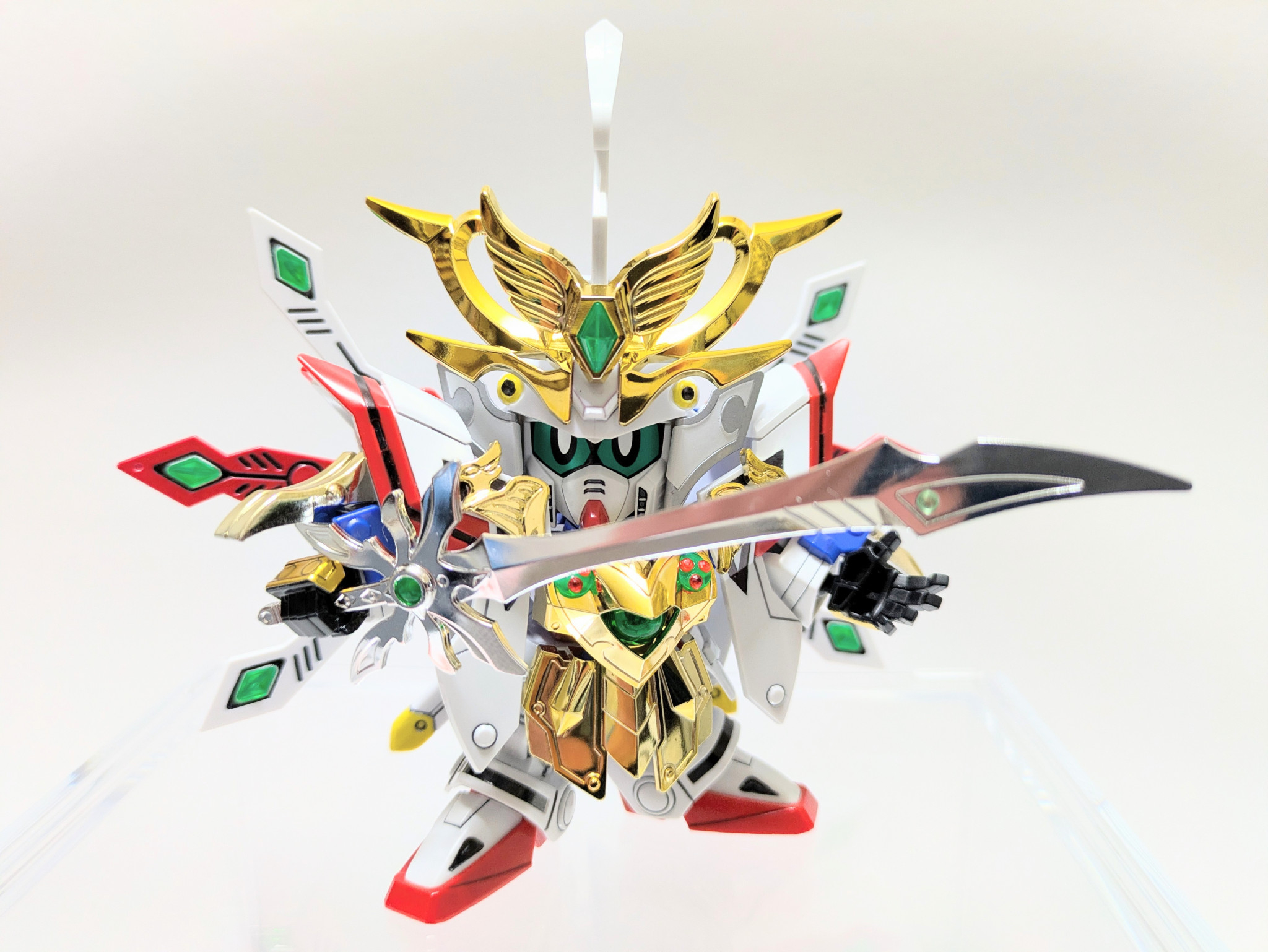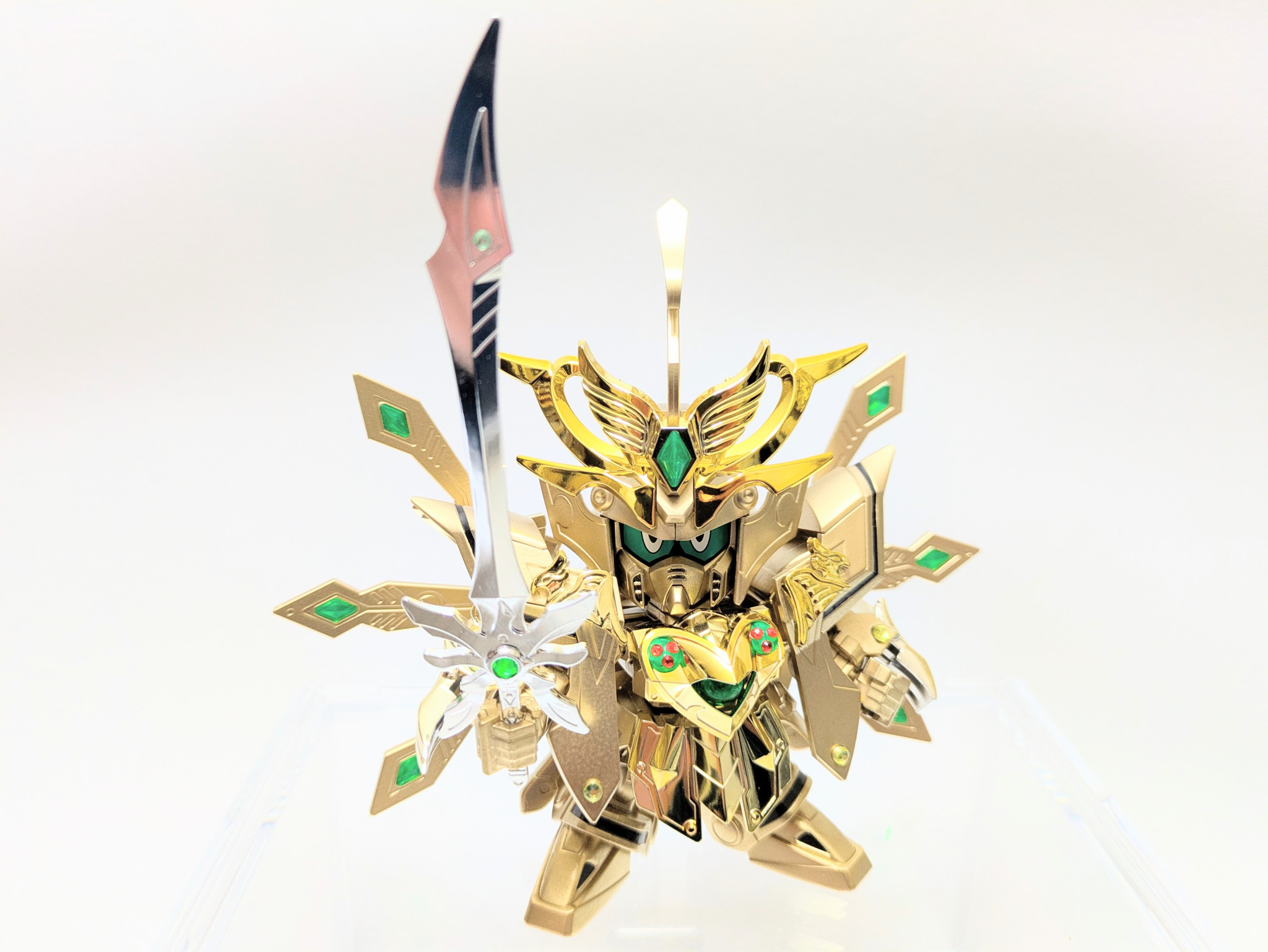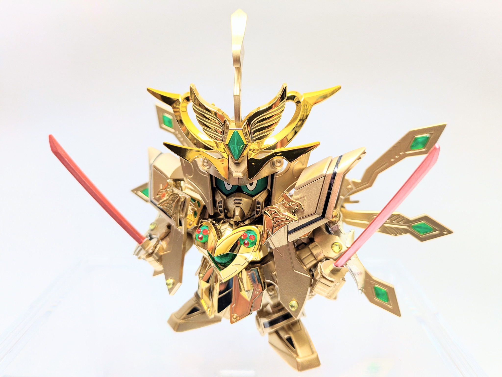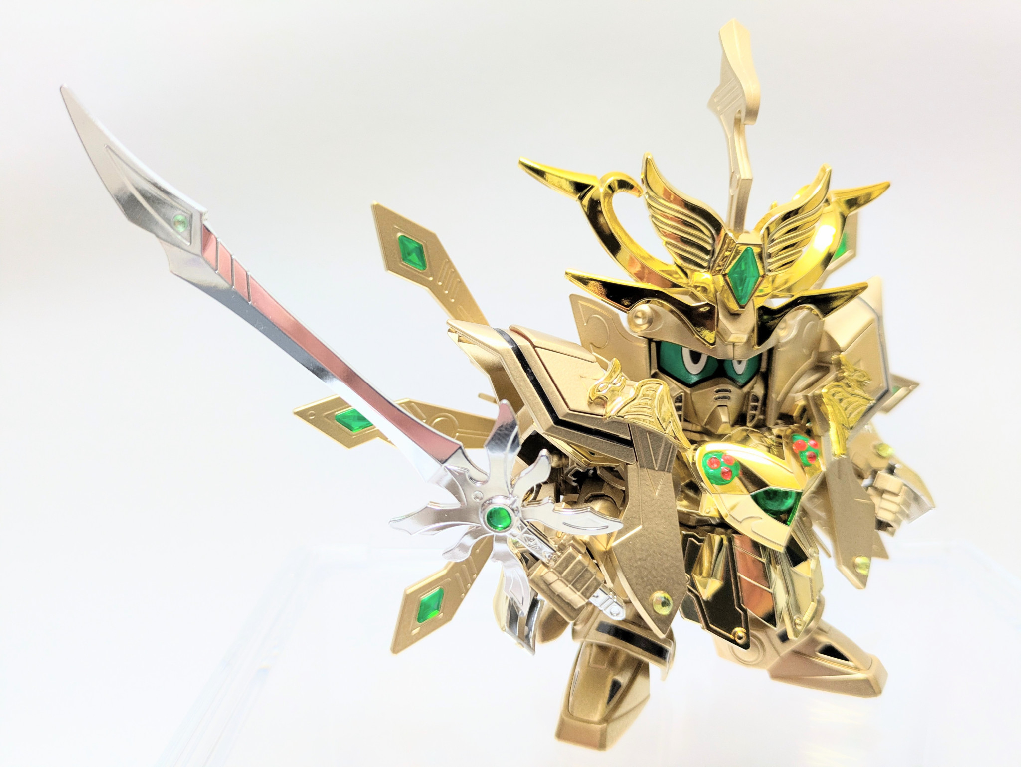 爆烈刀と熱破刀が光の力を受けてパワーアップ。『羽荒斗頑駄無』に付属する旧キットの石破天驚剣をアレンジ。炎と水の力をイメージしてラインストーンを貼りました。胸の宝玉の中にはキング・オブ・ハートの紋章が浮かび上がります。