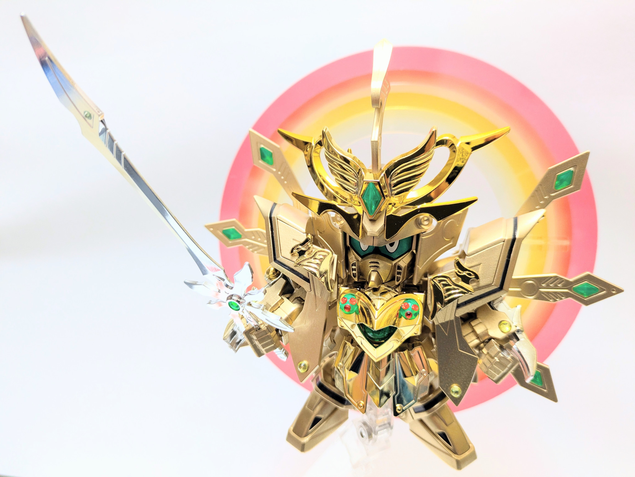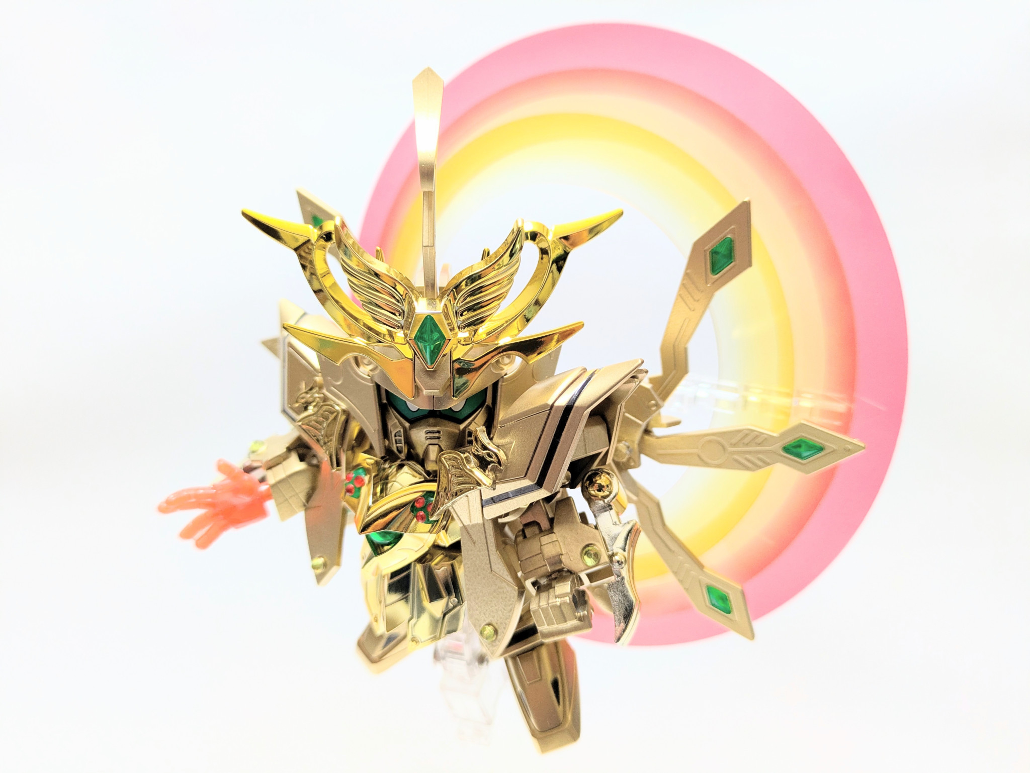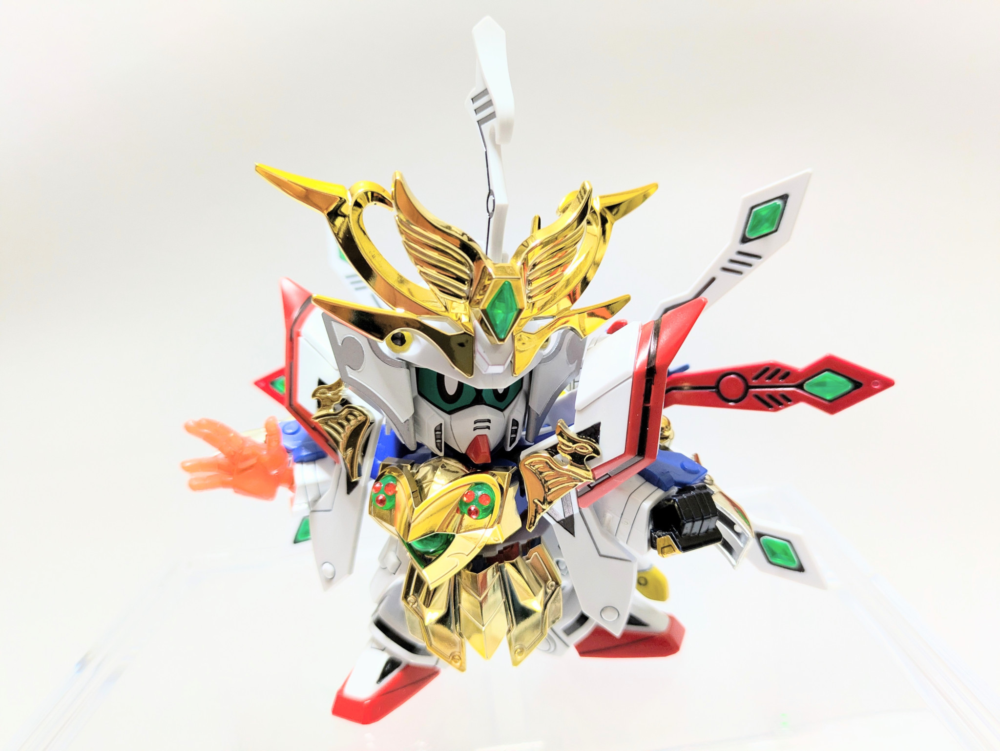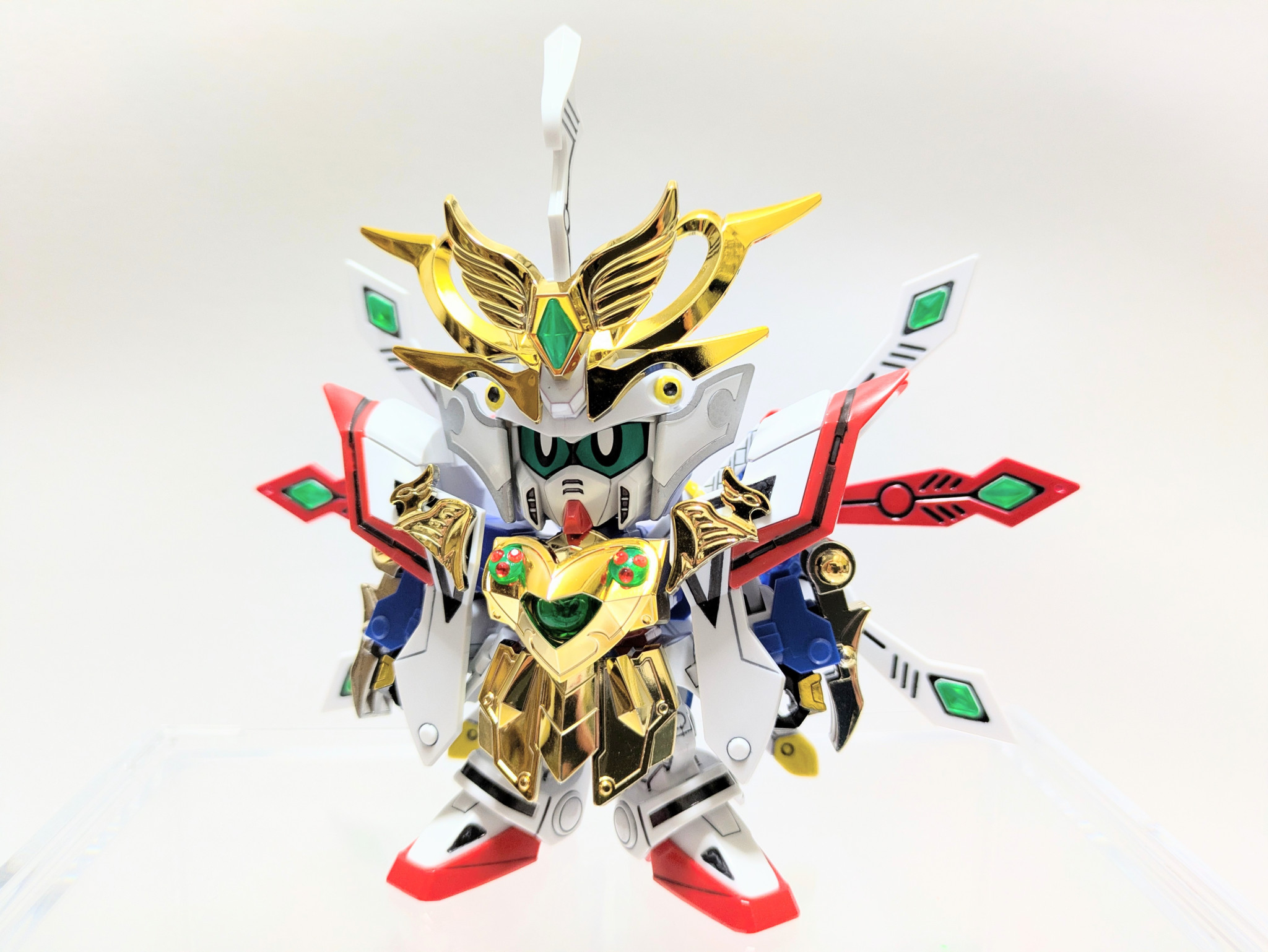 爆烈刀と熱破刀が光の力を受けてパワーアップ。『羽荒斗頑駄無』に付属する旧キットの石破天驚剣をアレンジ。炎と水の力をイメージしてラインストーンを貼りました。胸の宝玉の中にはキング・オブ・ハートの紋章が浮かび上がります。