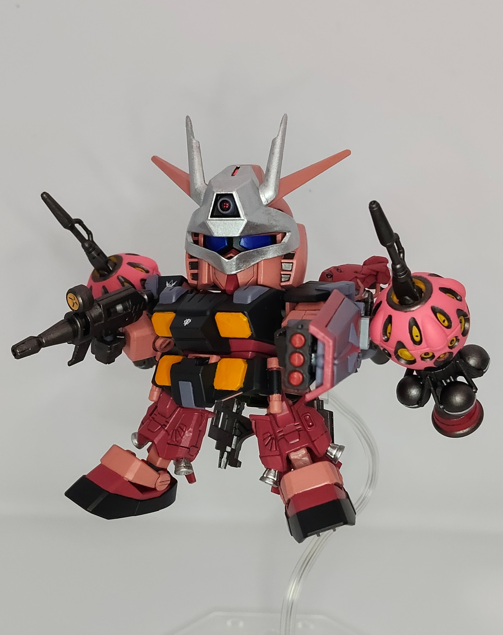 機体前面はフルアーマーガンダムのアーマー、背面はゲルググ(GQ)、足は食玩の高機動型ザクとSDEXガンダムのパーツを使いました。