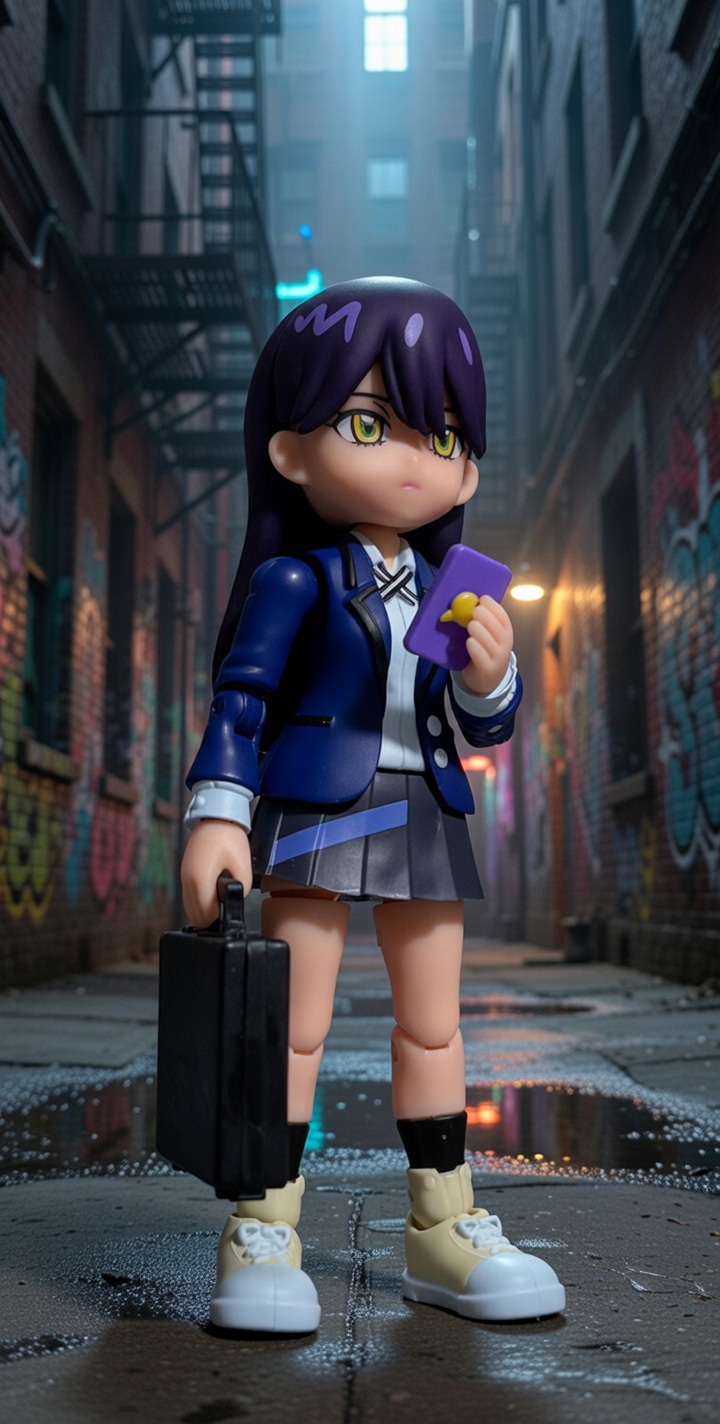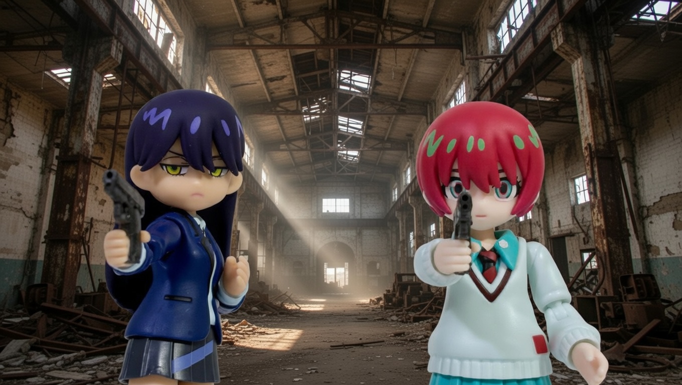 ハーレーに乗り、ショットガンを構えるニャアン。ハーレーは百均で売られてるチープトイを改造した。