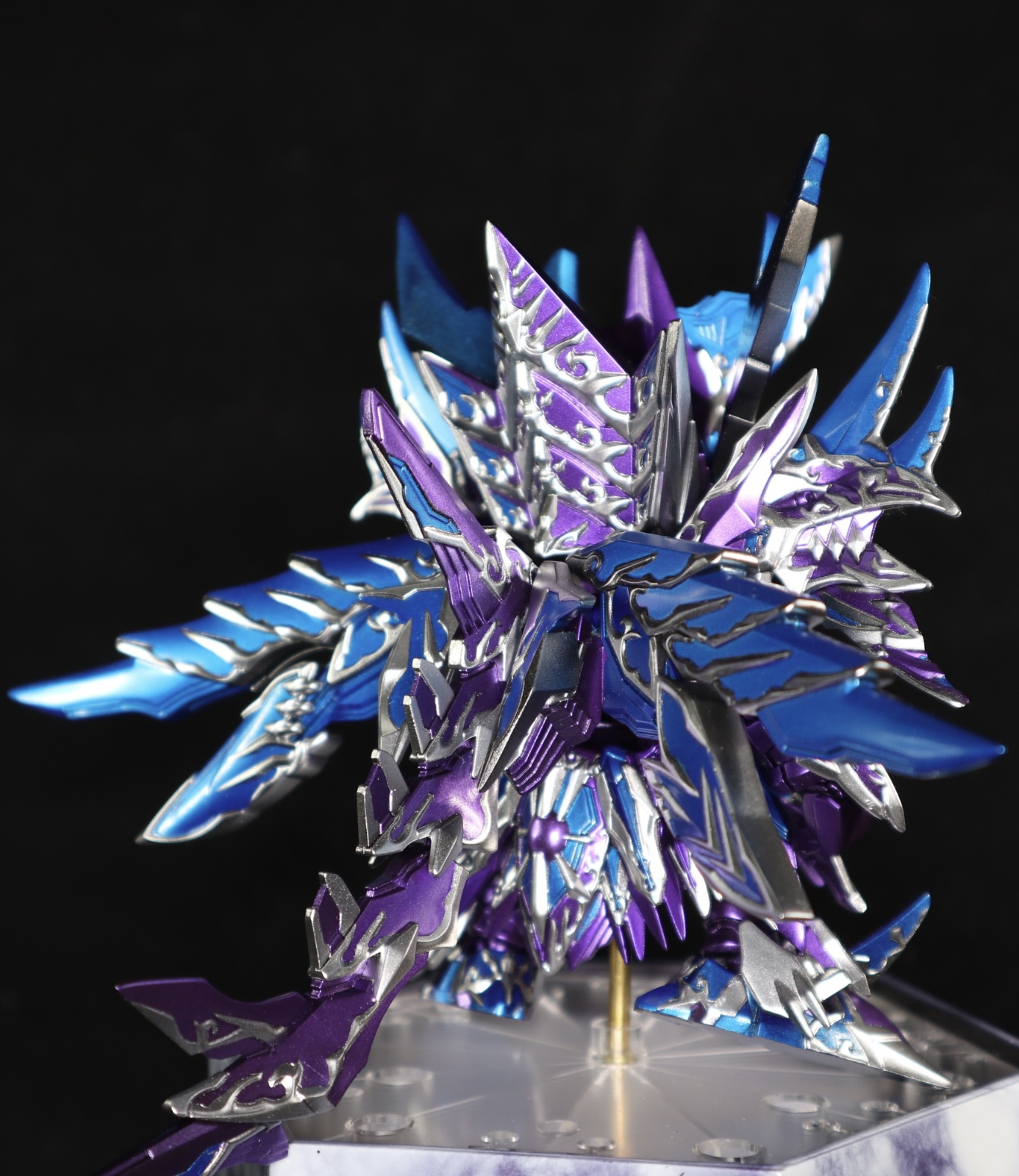 よーく見ると紫2色使ってます。明るいというか薄いというかの紫はメタルバイオレット。マスキングテープを細切れにして1パーツづつ2ヶ月くらいかけて塗装してます。2回くらいドボンしたりもしましたが無理のないよう時間かかるのが健全だと思います。