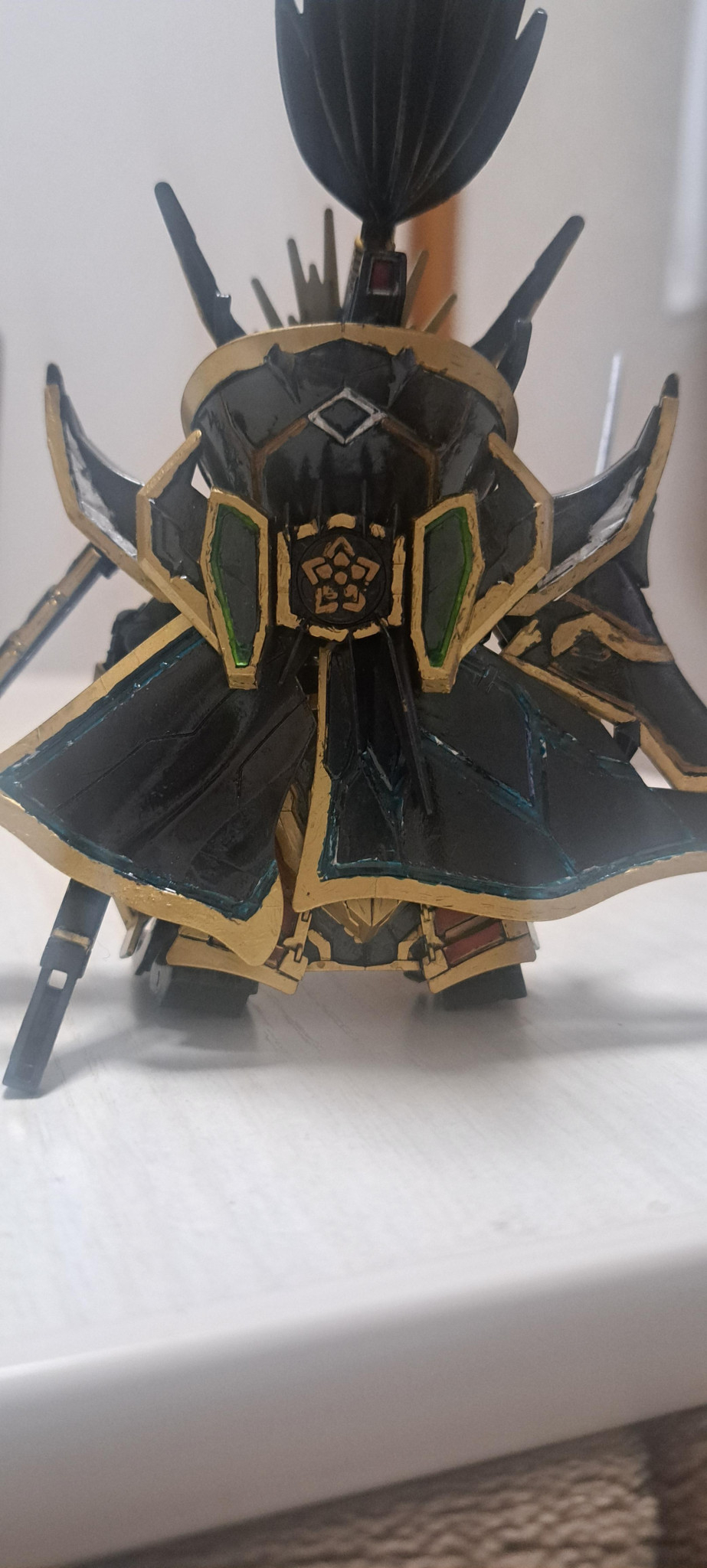わりと細い塗り分け老眼にムチ打ちました。黒い機体にゴールドがよく映えてる自画自賛。黒いとこは塗ってからスモークブラックを上塗りしました。光沢仕上げです。