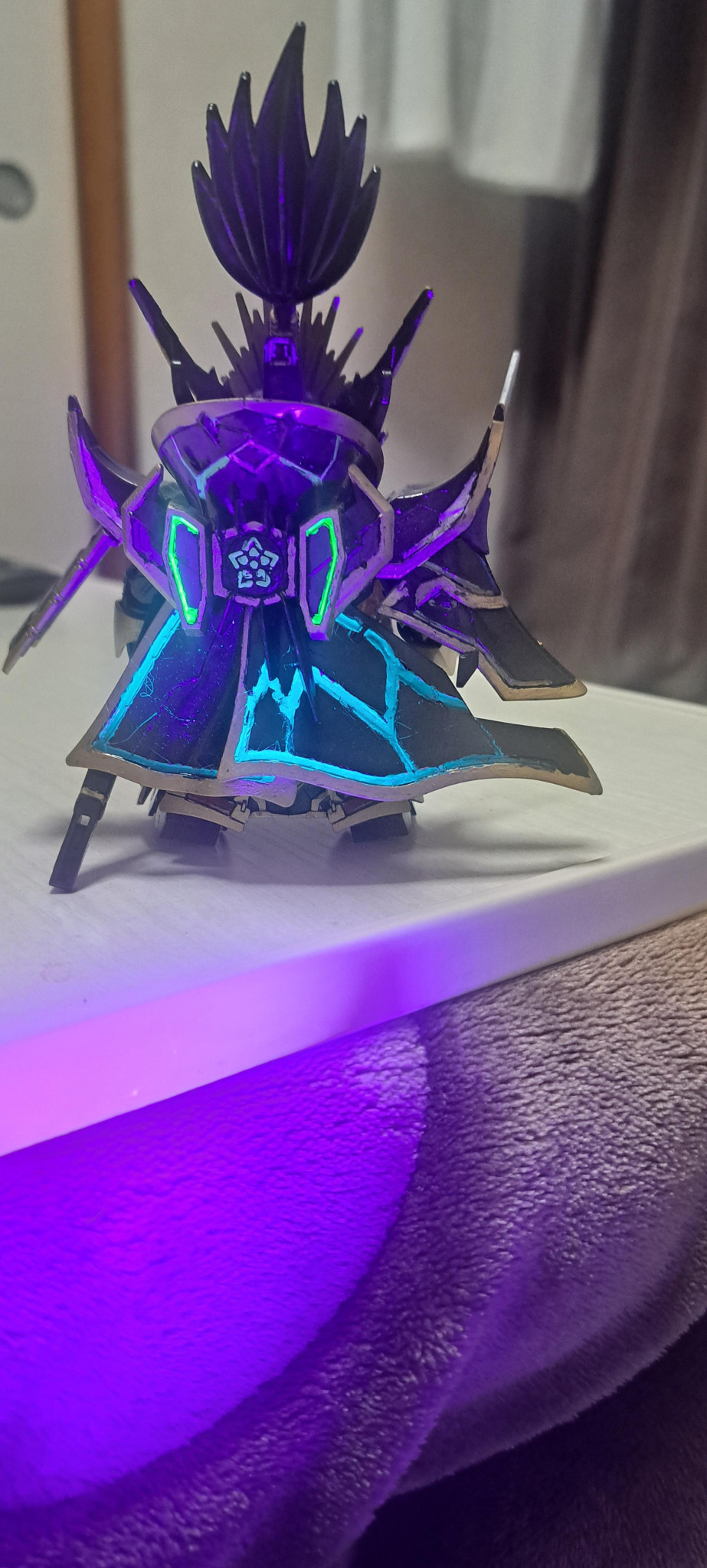 UVライトでピコーン。粗さが丸見え。でもこれでいいのだ。モワ〜と光って怪しく見えてる気がします。信長専用の馬もあるようなのでいつか見つけたら是非乗せてあげないと。ちなみに必殺技の絶刀なんですが塗装時早々ポキンってなったので無しです。早々心折れるとこでした。なんとか細いとこも気持ちはコツコツ丁寧に頑張り、光沢クリア吹き、流石光沢テカテカしたぞと。背中の家紋もまぁまぁ上手くいったので満足です。またまたご覧頂きありがとうございました。久々HG作ろうかな何かないかな。