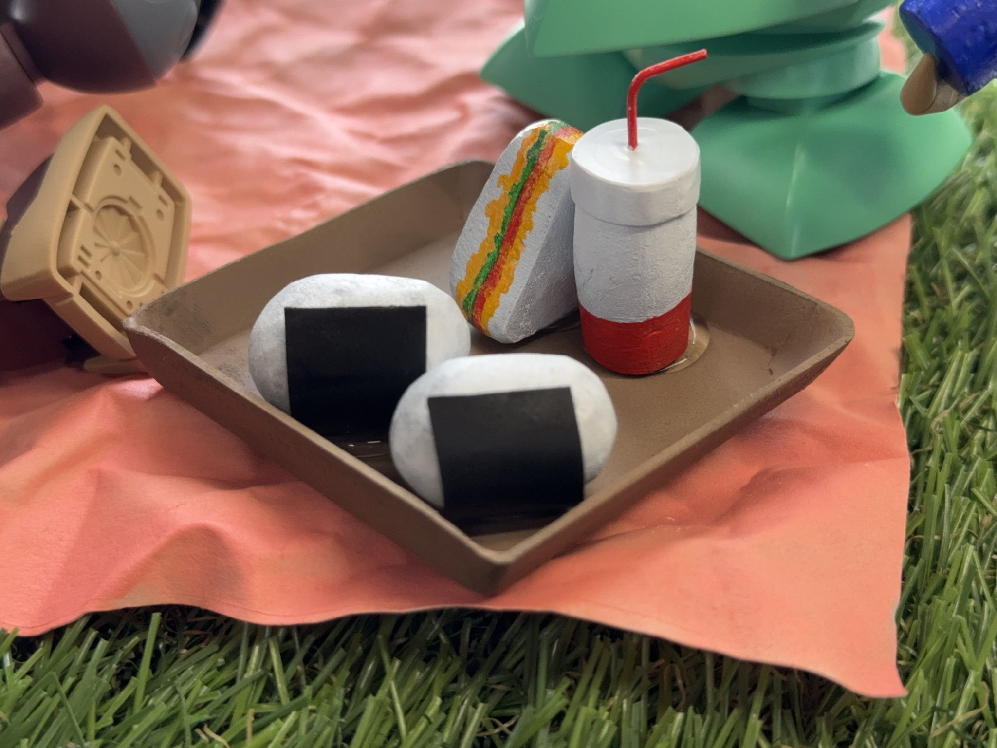 ランチトレーはプラ板。おにぎり、サンドイッチ、ジュースはパテでスクラッチ🍹🥪🍙