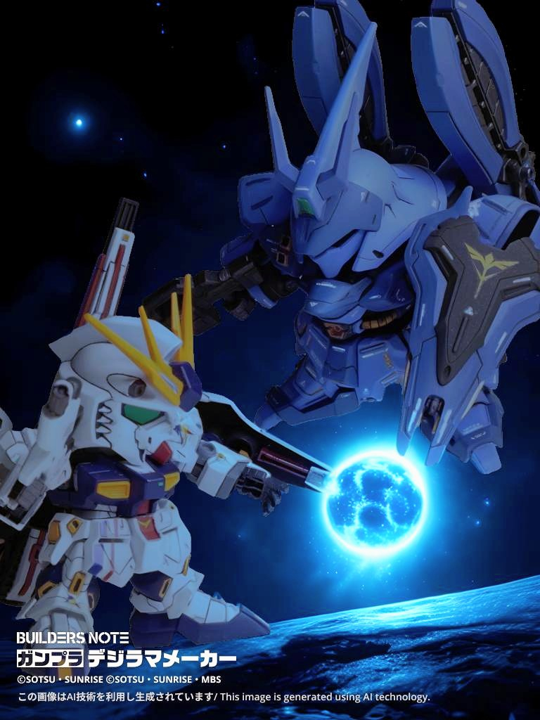 以前製作した福岡νガンダムとデジラマ。並べてみるとブルー系統同士なのでGSFカラーで統一感があるように見えますね。