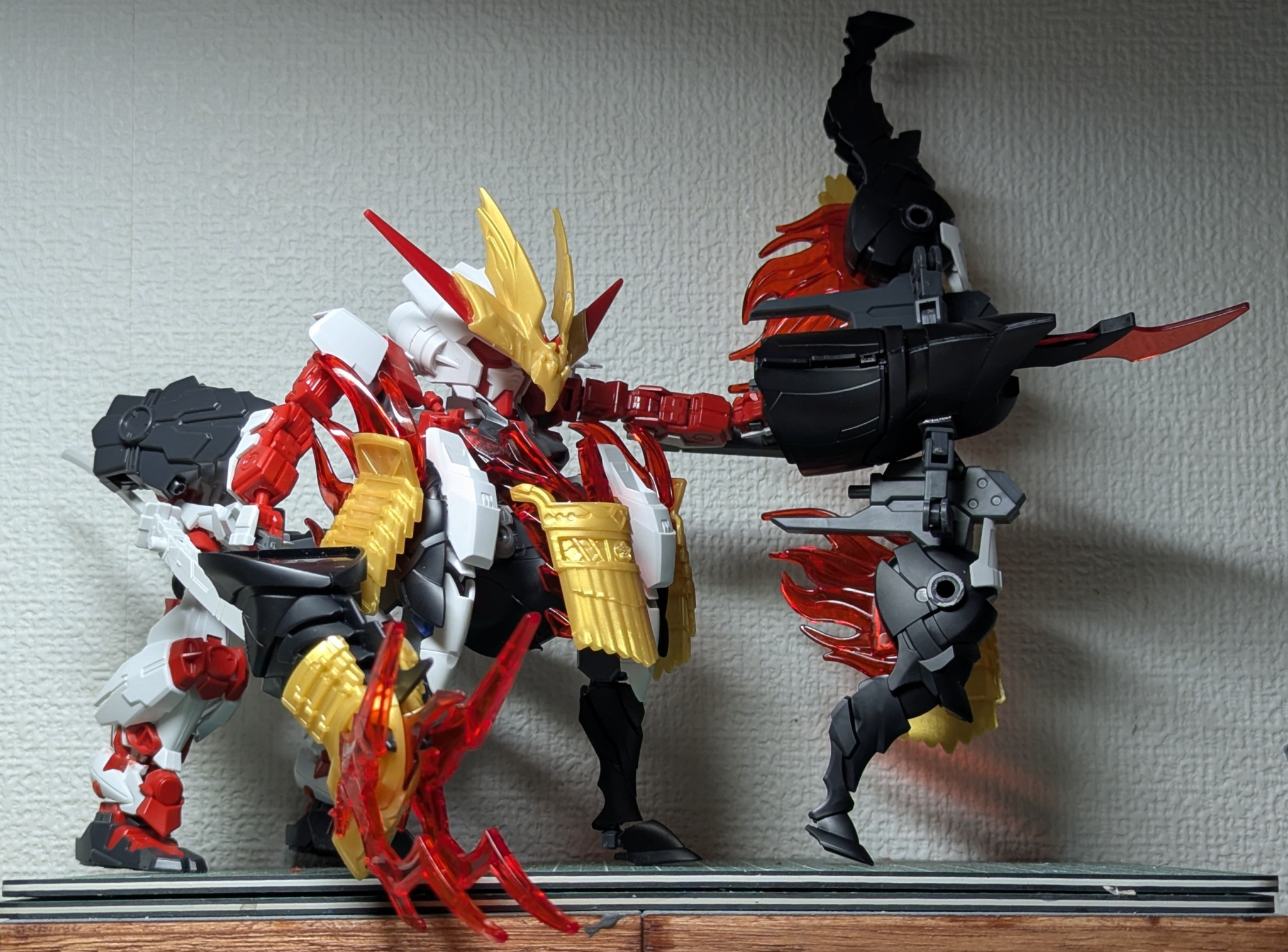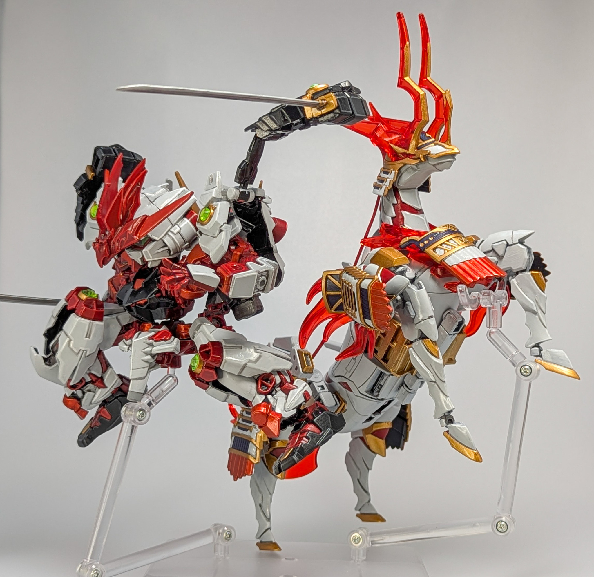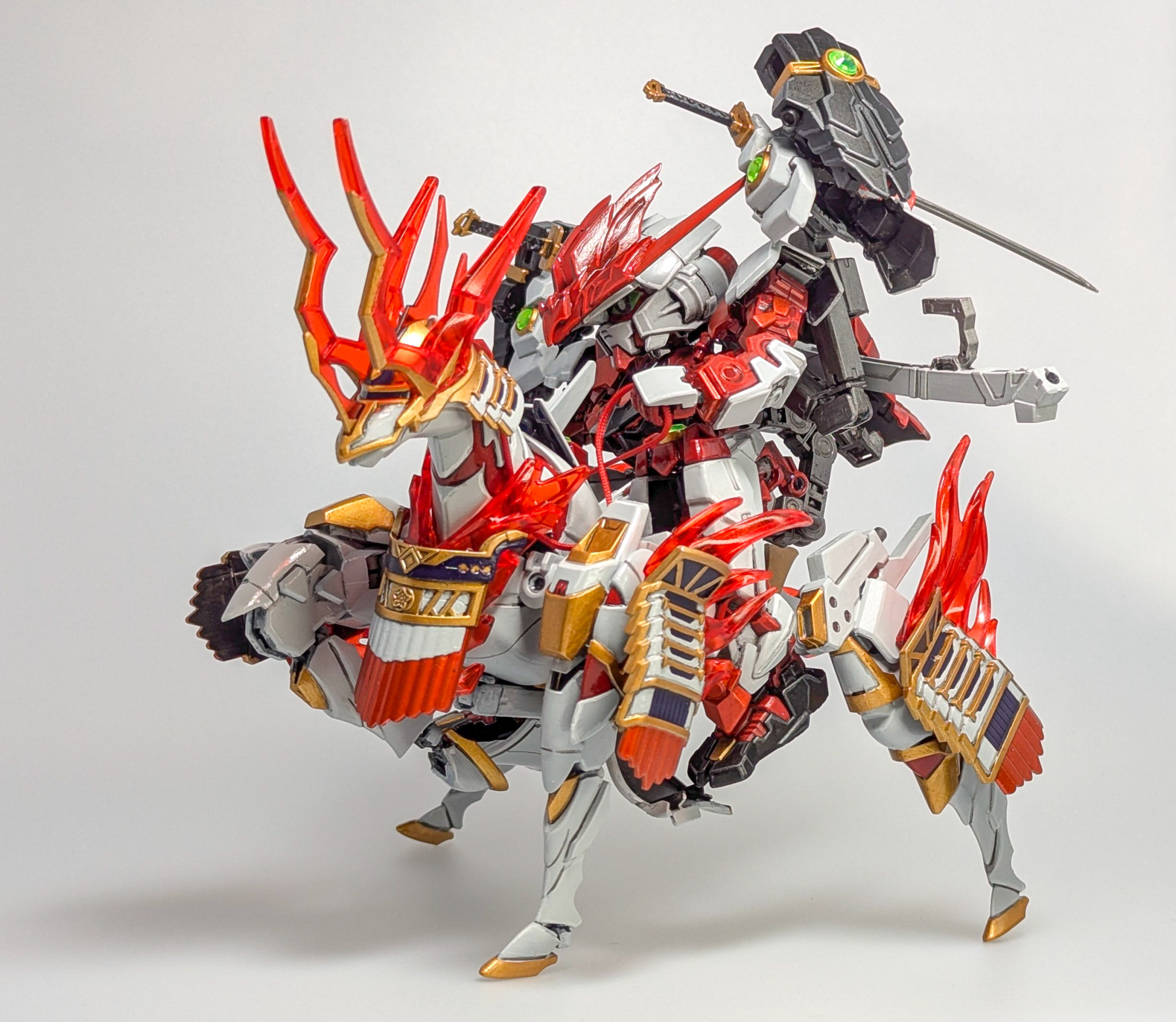 戦国アストレイを合体形態に変形させ、馬メカの前脚を合体させることで、合体させるギミックを追加しました。