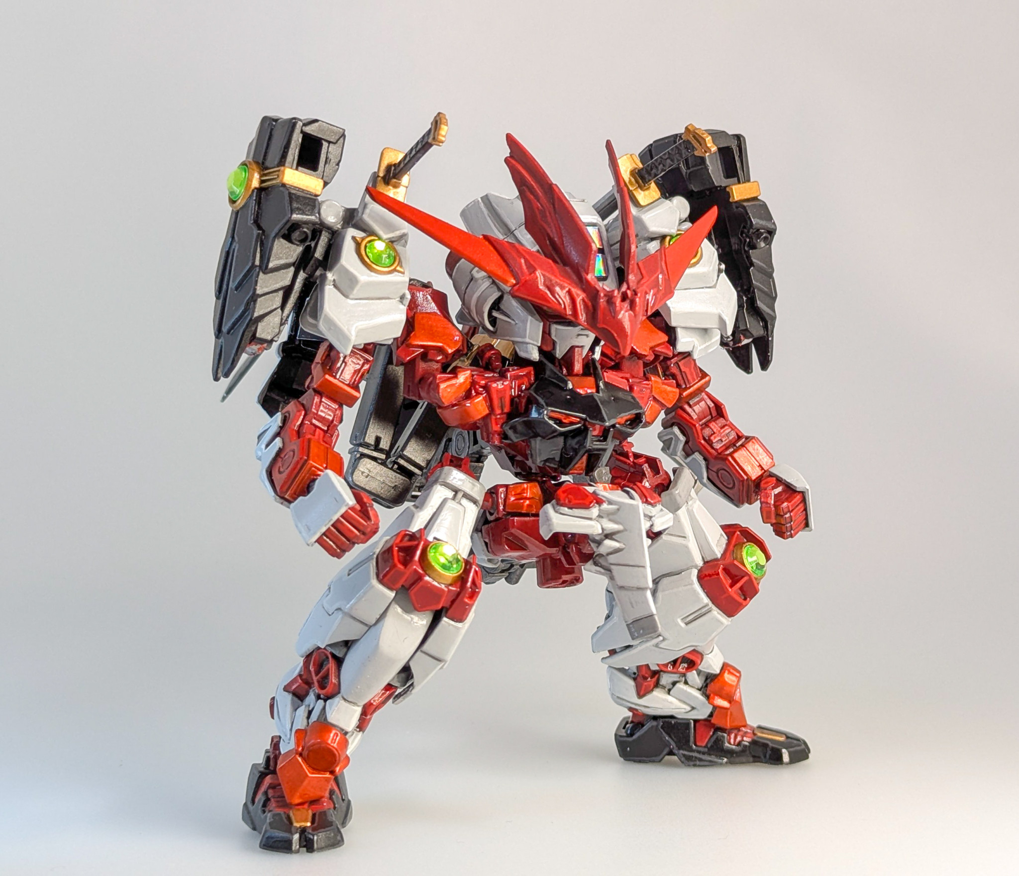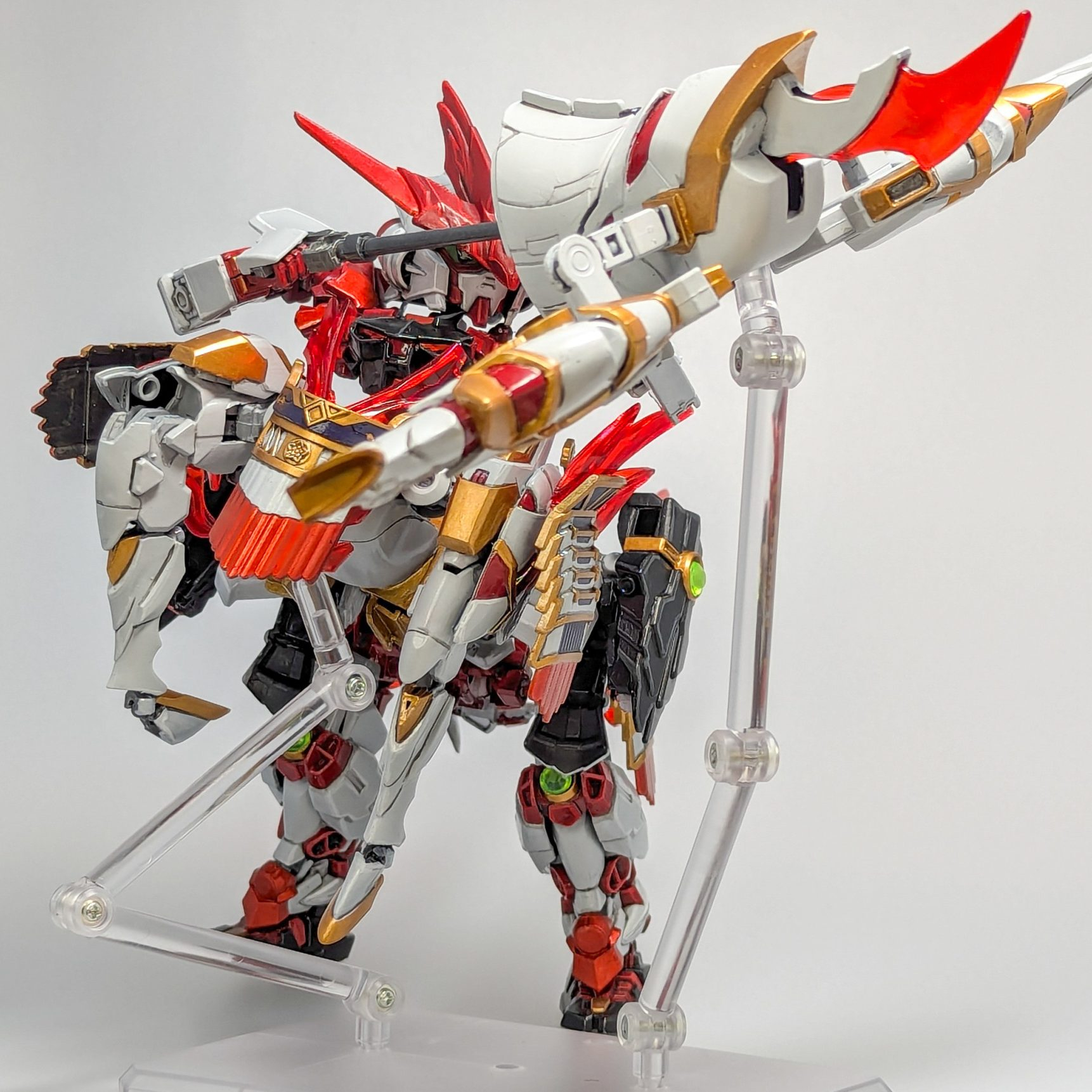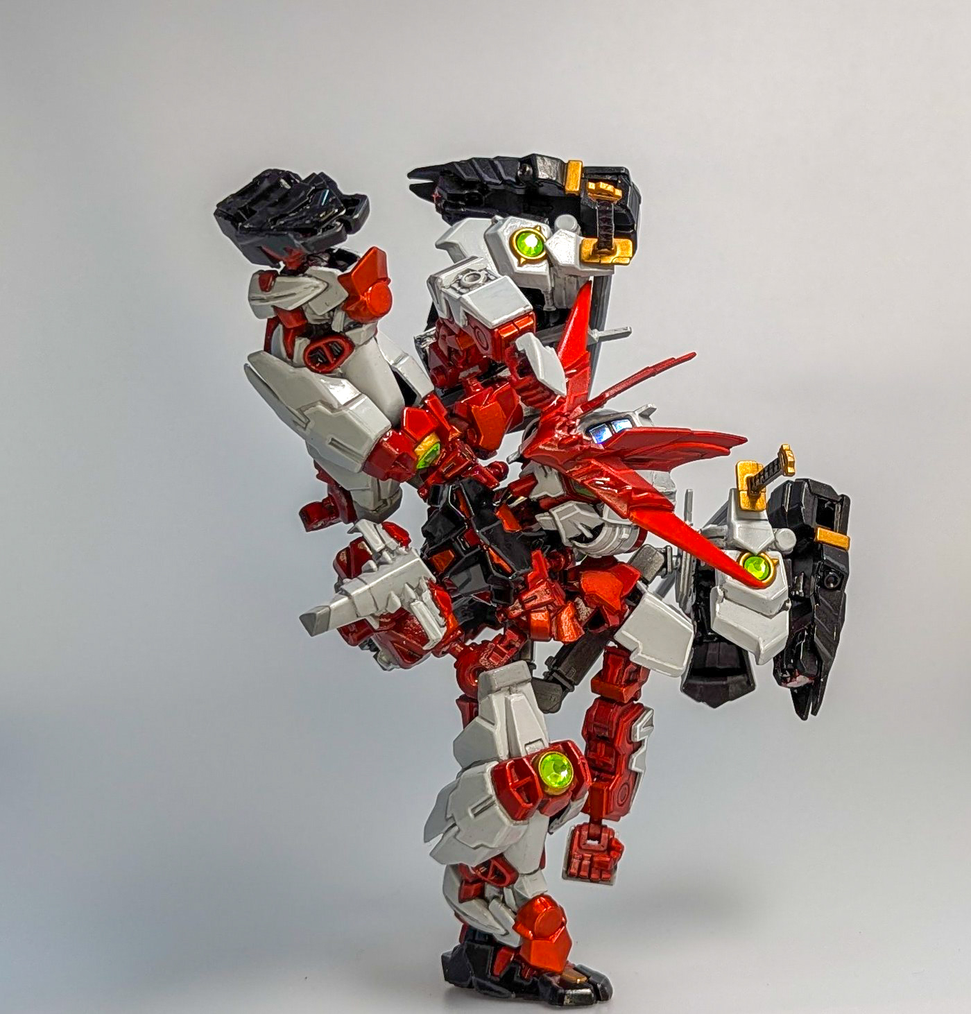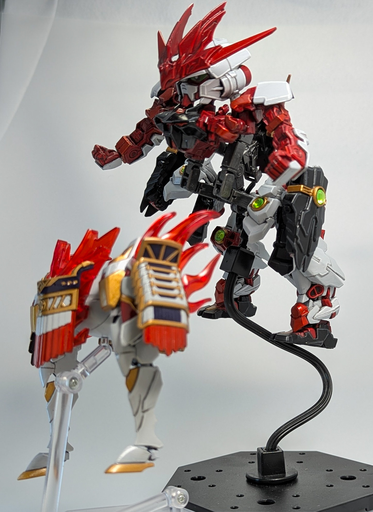 戦国アストレイ頑駄無、完成です!SDEXアストレイとHG戦国アストレイを組み合わせて作りました。筆塗り全塗装で仕上げに光沢スプレーを吹きかけています。また、信長専用軍馬を改造して馬型のサポートメカを作りました。騎乗するだけでなく、合体して高機動形態に変形可能です。