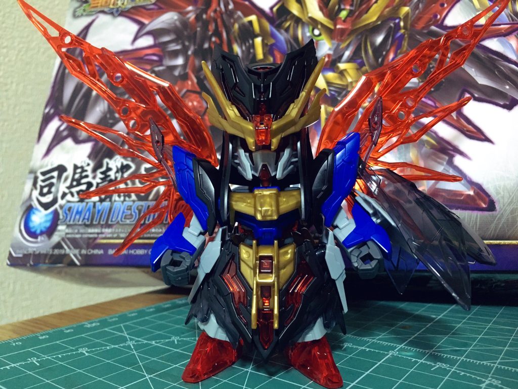 文官らしさ漂う冠を見事にアレンジして組み込んだデザイン、そして禍々しい武装が目を惹く司馬懿デスティニーガンダムです。