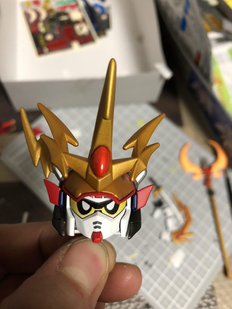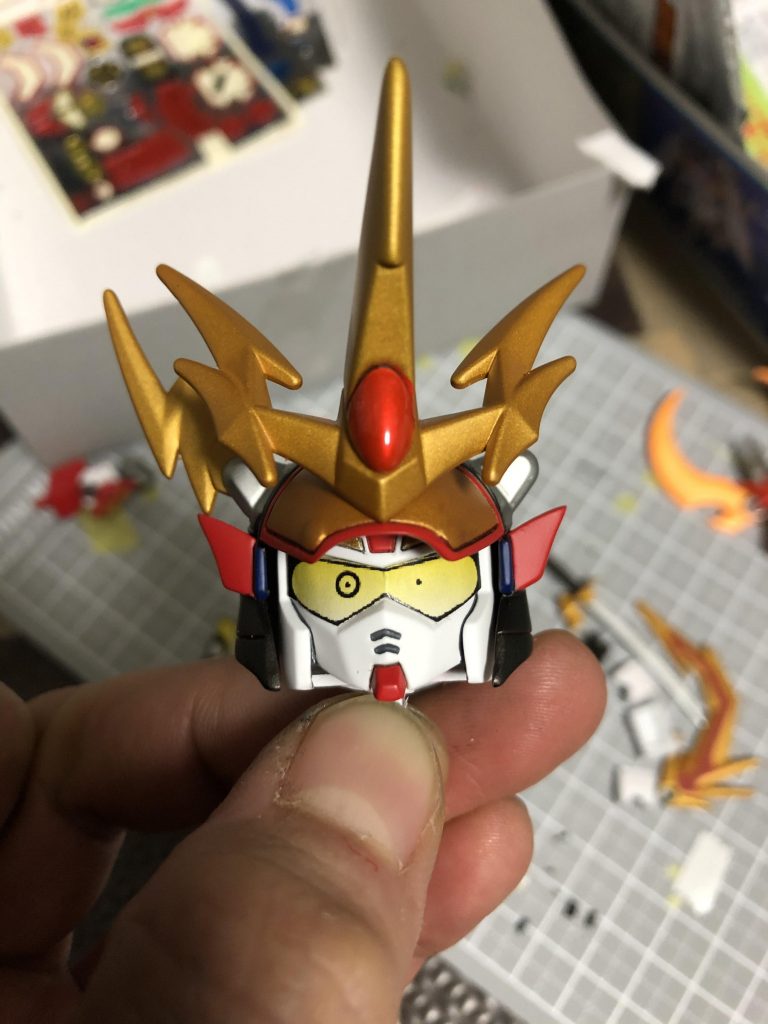 三烈神に続き、雷刃頑駄無を製作しました。今回は武器の持ち替えと若干のポーズ変更ができるようにしました。また武者ガンダム風雲録の武者激闘のイメージで、ちょこっと間抜けな目ん玉シールもつくりました^_^  元キットは武者激闘頑駄無ですが、フェイスが本当にかっこいいですね…!個人的にレジェンドBBも含めたキットの中で一番かっこいいと思います。
