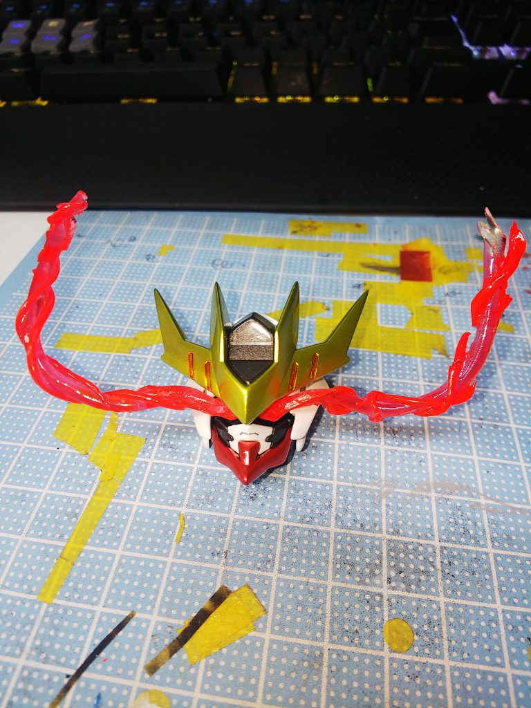 首・胴・腕・足の延長アーマー追加 肩アーマー分離(可動式) フレームアブソーバー追加 各部肉抜き穴埋め 各部シャープ化 ツインアイのエフェクト パールとメタリック塗装にウレタンクリア仕上げ