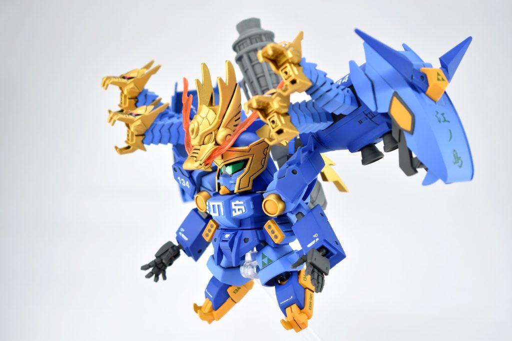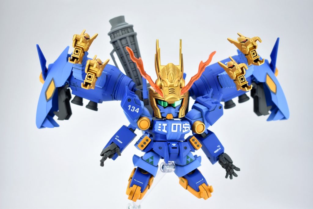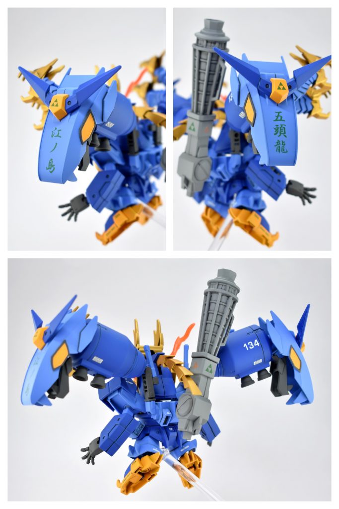 ご当地ガンダムがあったら良いなと思い、江ノ島をテーマにしたGBN用の機体を作ってみました。江ノ島の伝説「五頭龍」と「江の島シーキャンドル」をデザインのモチーフとして取り入れています。カラーリングは海と夕陽をイメージしてブルーとオレンジを基調としました。