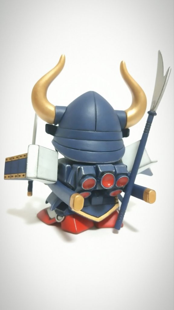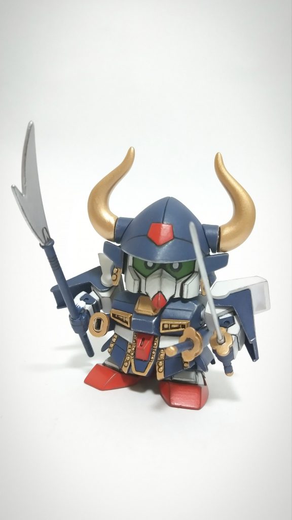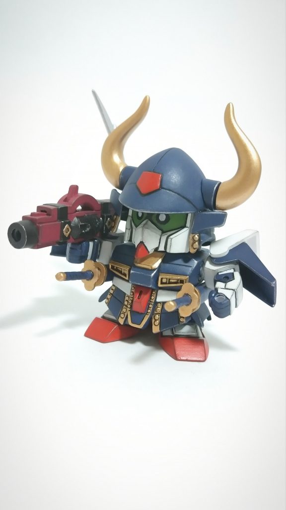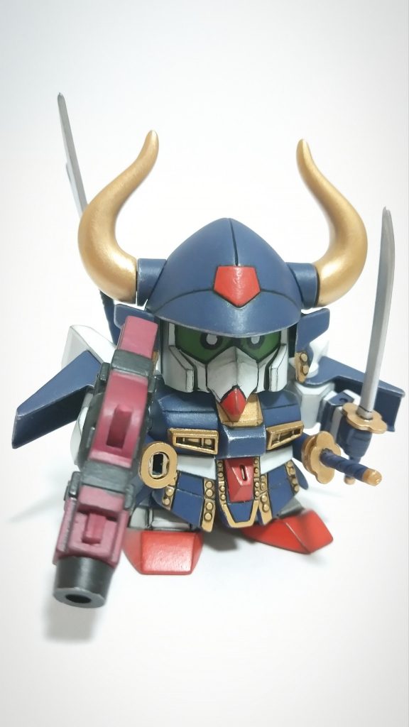 前回の武者ガンダムに比べたら色分けはマシですが、青の部分が少し緑味がかってて、少しイメージとは異なりますので、やはり筆塗りフル塗装しなおしました。青の部分はガンダムカラーのティターンズブルー2で塗ってます。
