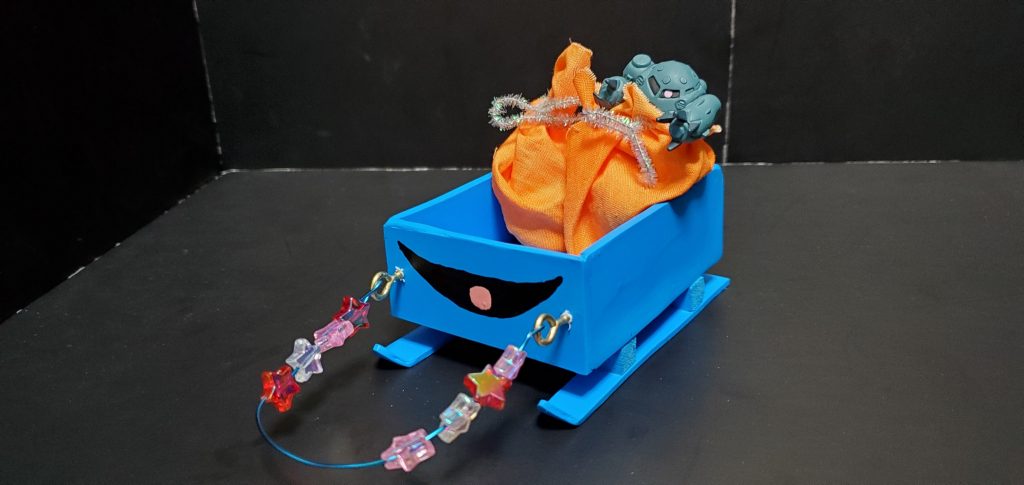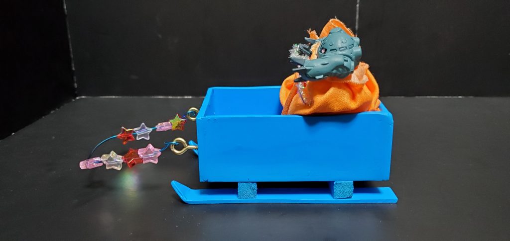ハイゴッグソリ。プラ板と木材を加工して製作しています。オレンジのプレゼント袋はブースターのイメージ、ヒモはケンプファーのチェーンマインをイメージしています。ズゴックEはプレゼントのオモチャです。