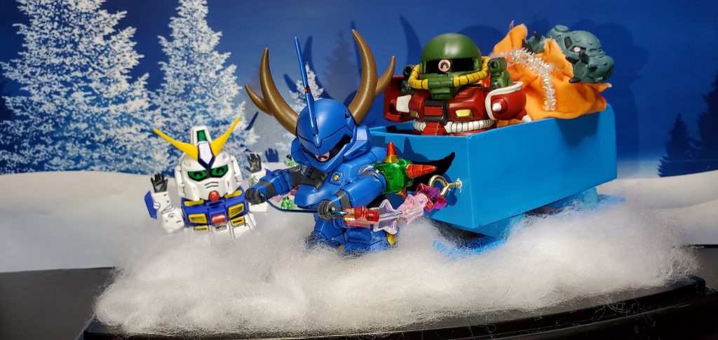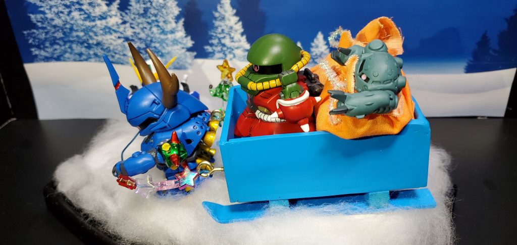 ポケ戦のキャラによるクリスマスです。ザクⅡ改はサンタ、ケンプファーはトナカイ、ハイゴッグはソリ、ズゴックEはプレゼントの一部、アレックスは楽しんでいる子供という設定で作っています。