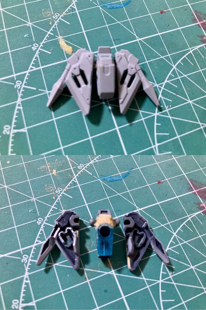 形状は顔やマゲ、肩・もも等の一部分を除いて大部分が佐助デルタガンダムを基にしたデザインとなっていたので、佐助キットをベースにアレンジを交えながら造型しています。