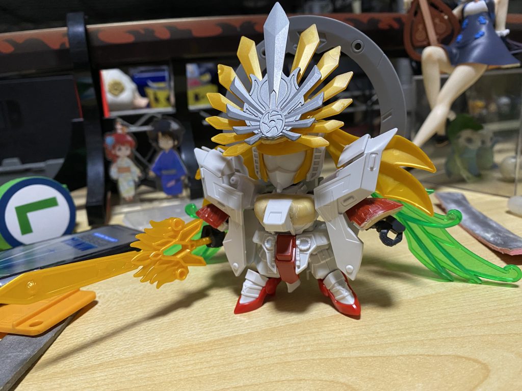 羽衣着せて、派手すぎな武装時の飾りを烈光の物に。出来てから結構贅沢にミキシングしてるなーと思いました。BBの戦国系はここで使おうと京都のガンダムベースサテライト行った時に確保してました。