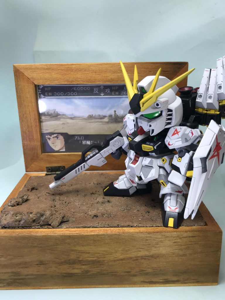 BB戦士のνガンダムを塗装して、以前作ったスパロボ風のディスプレイにニスを塗りました。